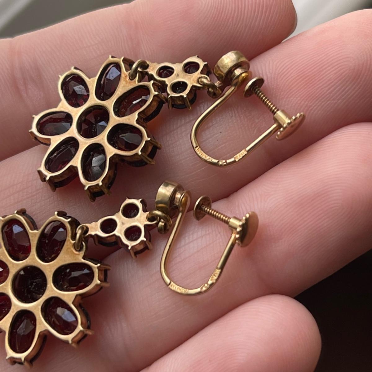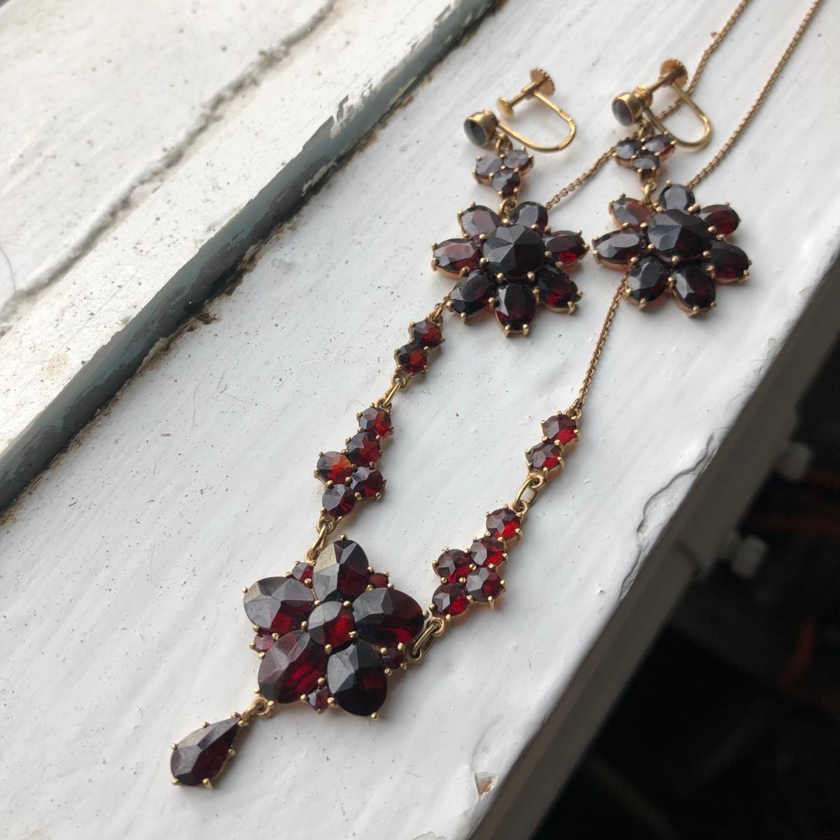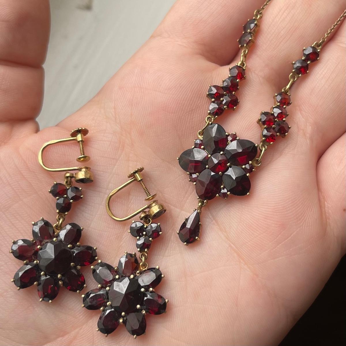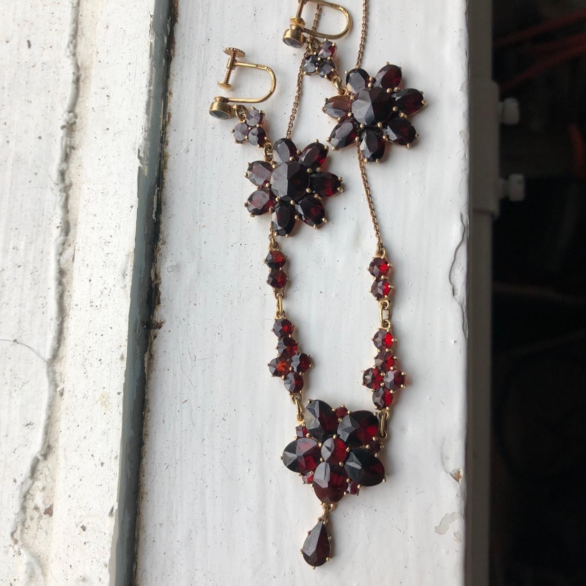 This matching set of garnet and gold clip on earrings and necklace were made in Germany. The garnets tested as garnets on a Presidium tester. The earrings have a 10k mark and the clasp is marked Germany with some other markings that are hard to distinguish.