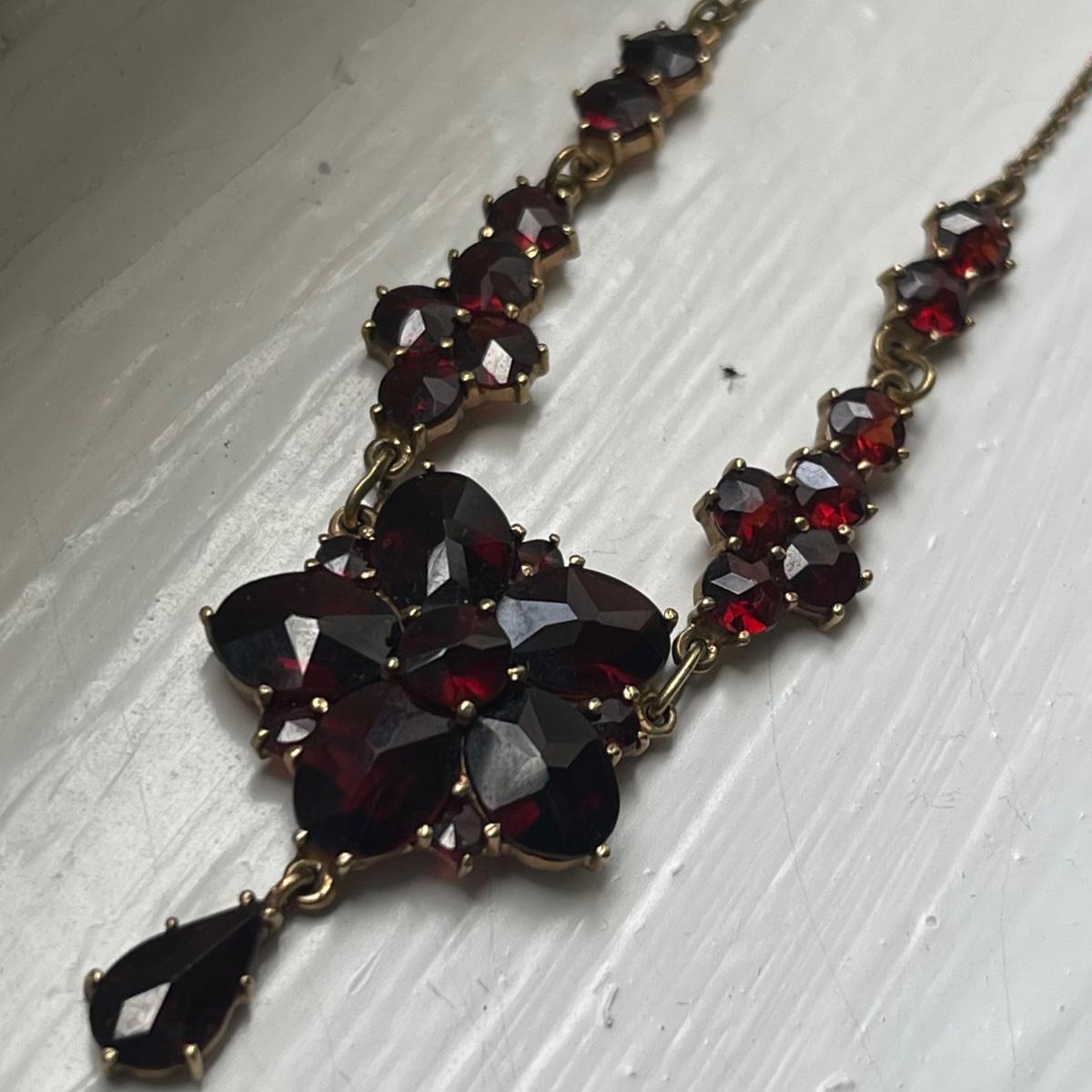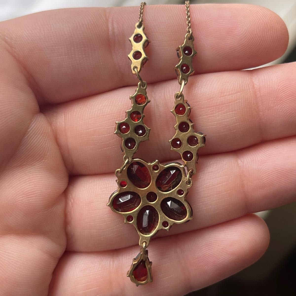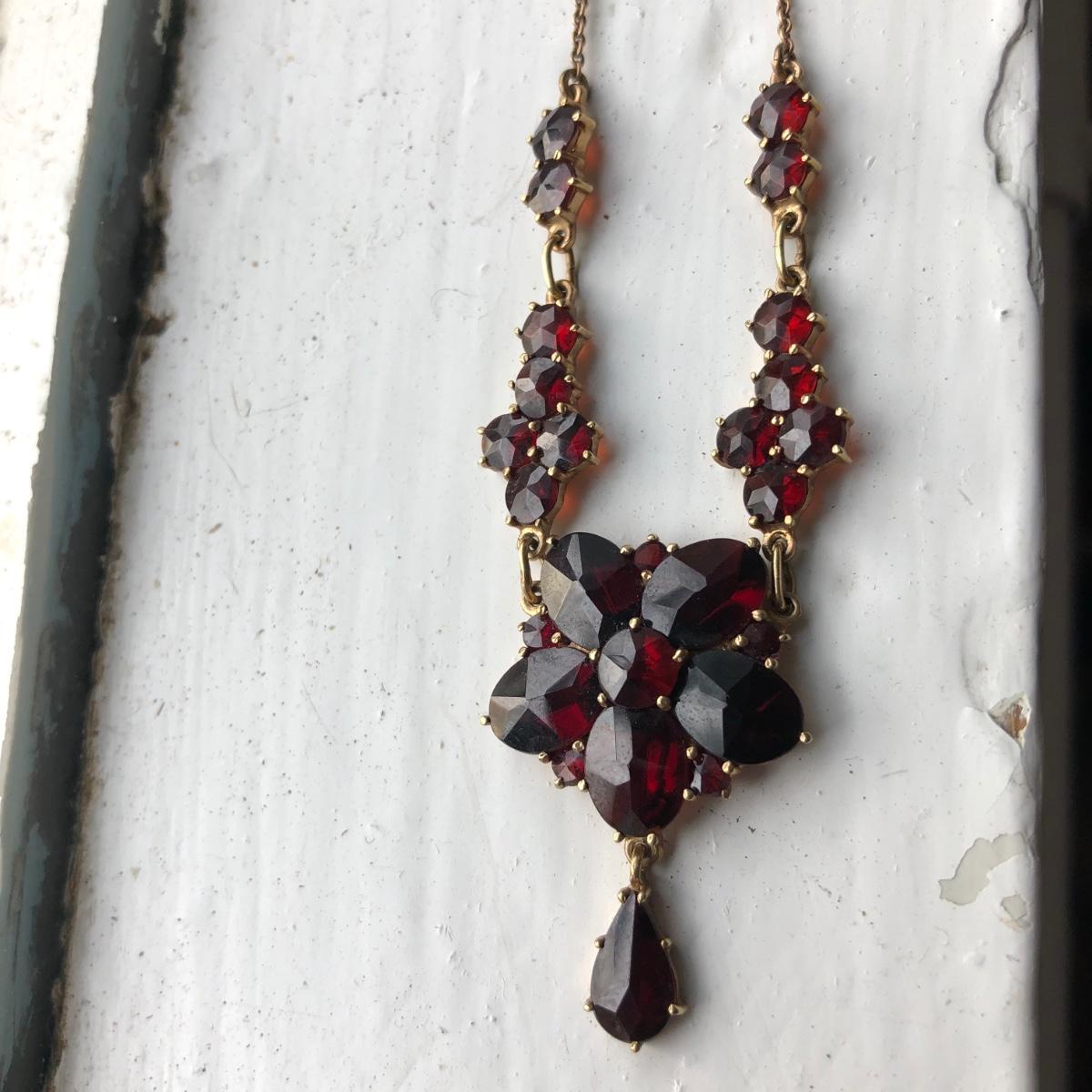 This matching set of garnet and gold clip on earrings and necklace were made in Germany. The garnets tested as garnets on a Presidium tester. The earrings have a 10k mark and the clasp is marked Germany with some other markings that are hard to distinguish.