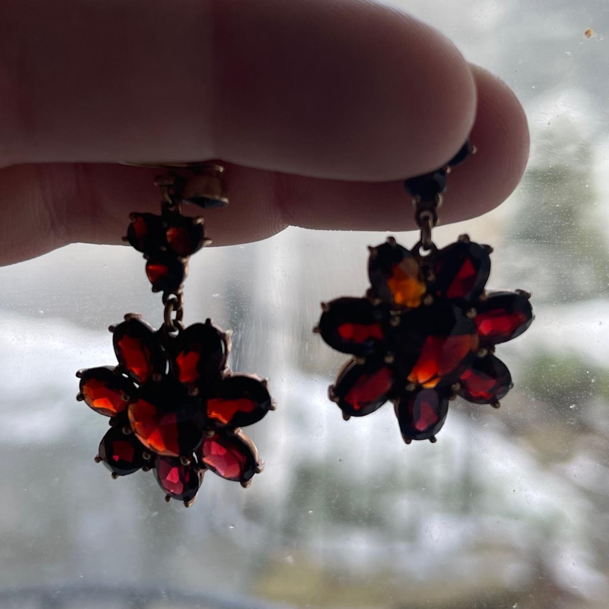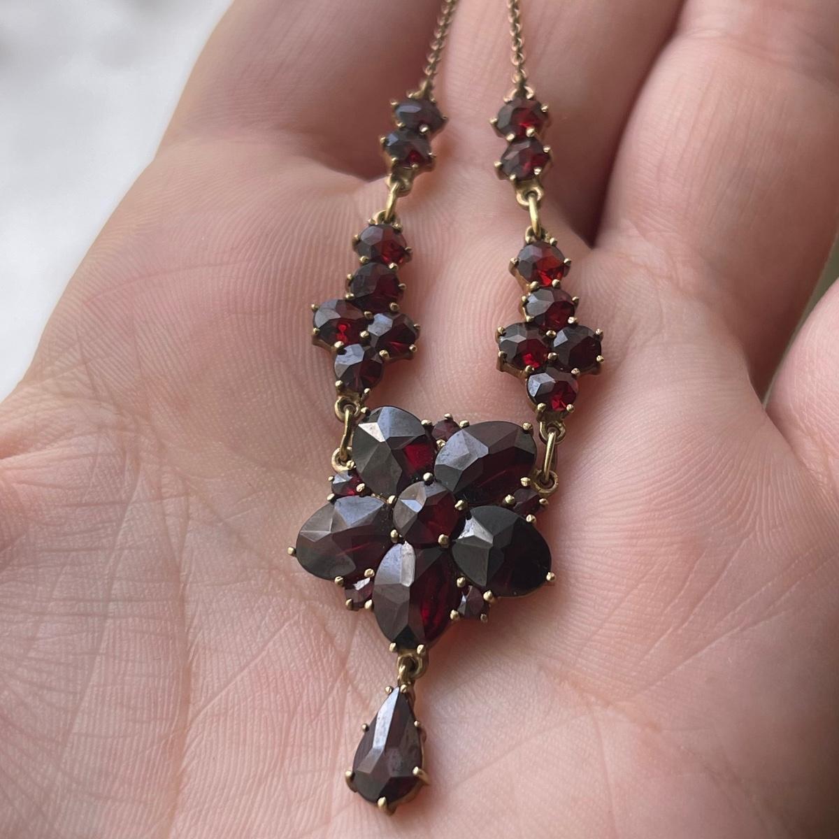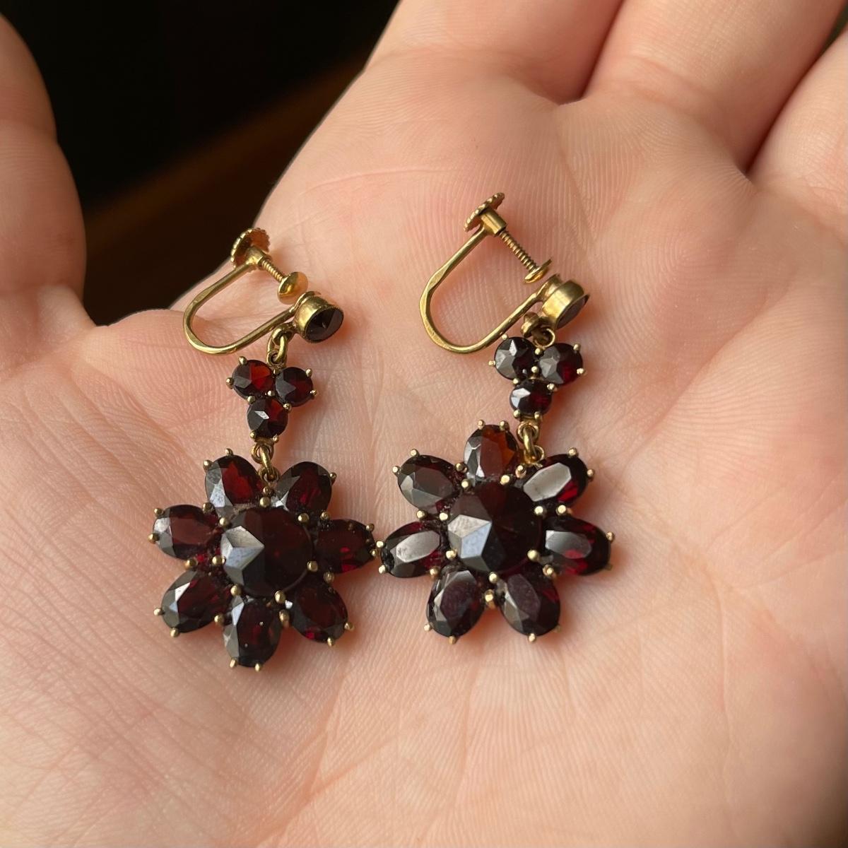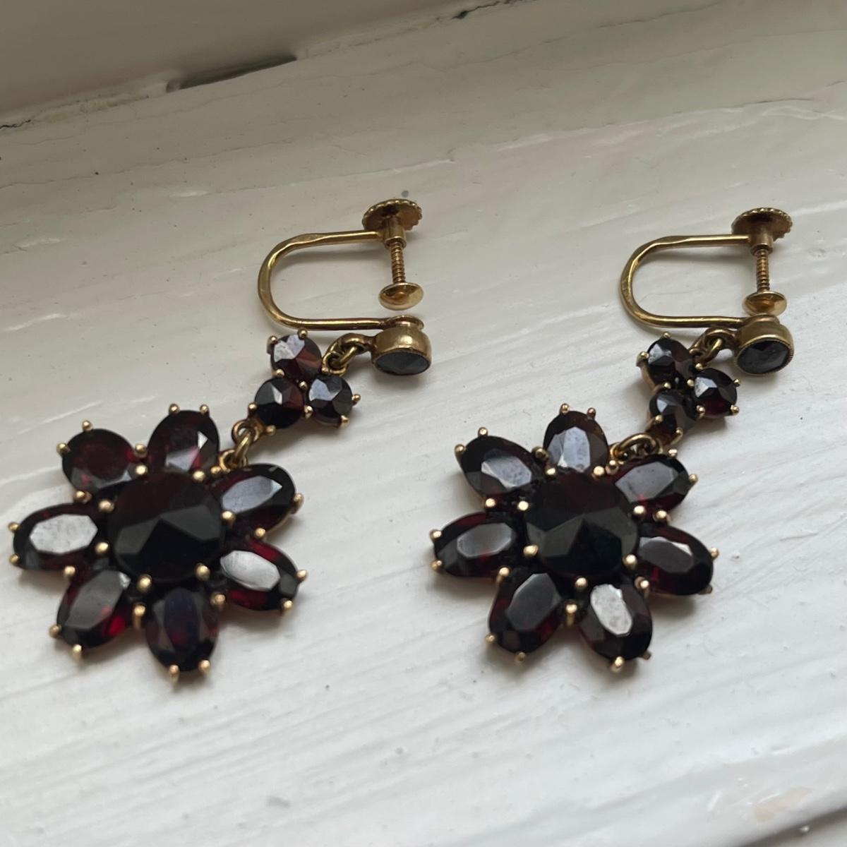 This matching set of garnet and gold clip on earrings and necklace were made in Germany. The garnets tested as garnets on a Presidium tester. The earrings have a 10k mark and the clasp is marked Germany with some other markings that are hard to distinguish.