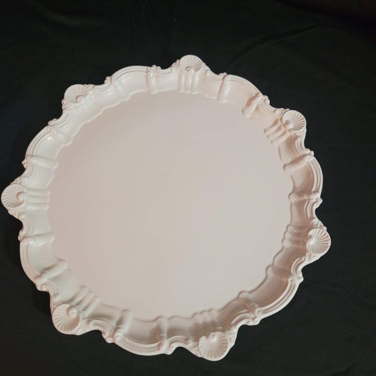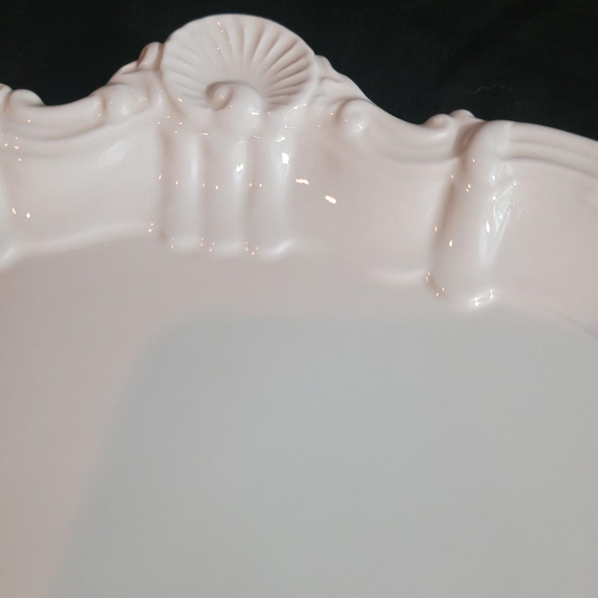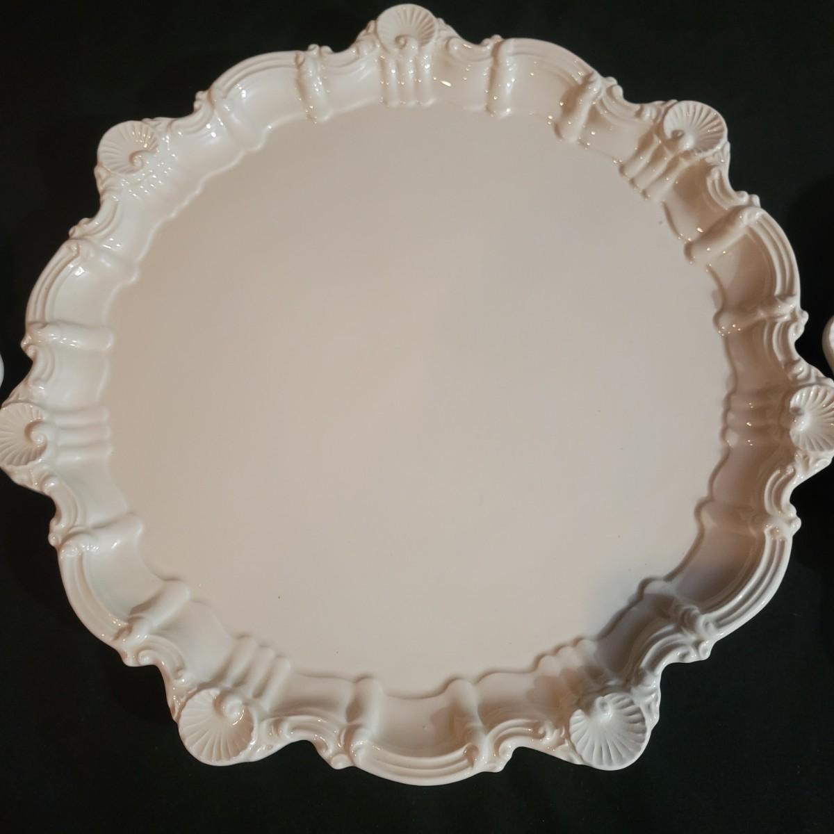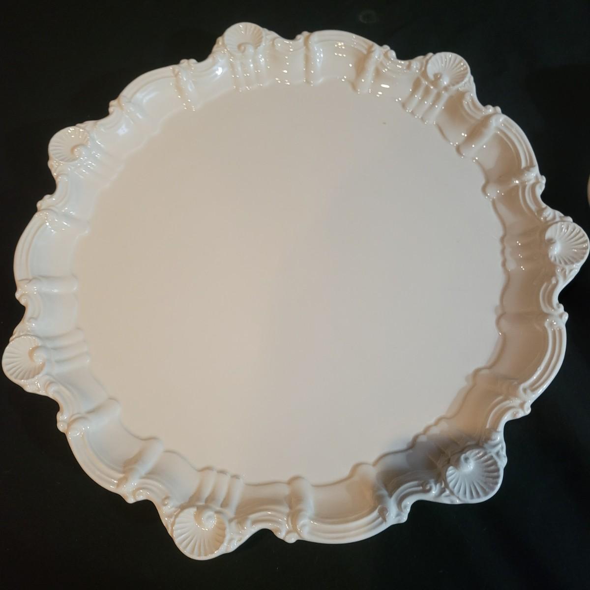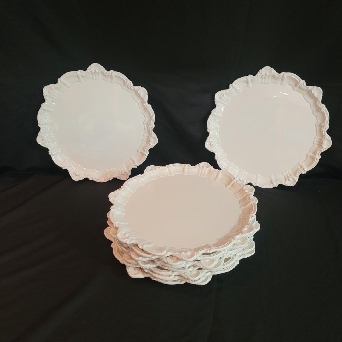 Set of nine cream colored large ceramic dinner plates with detailed scallop shell edging. Plates measure approximately 12"D. Shipping available.