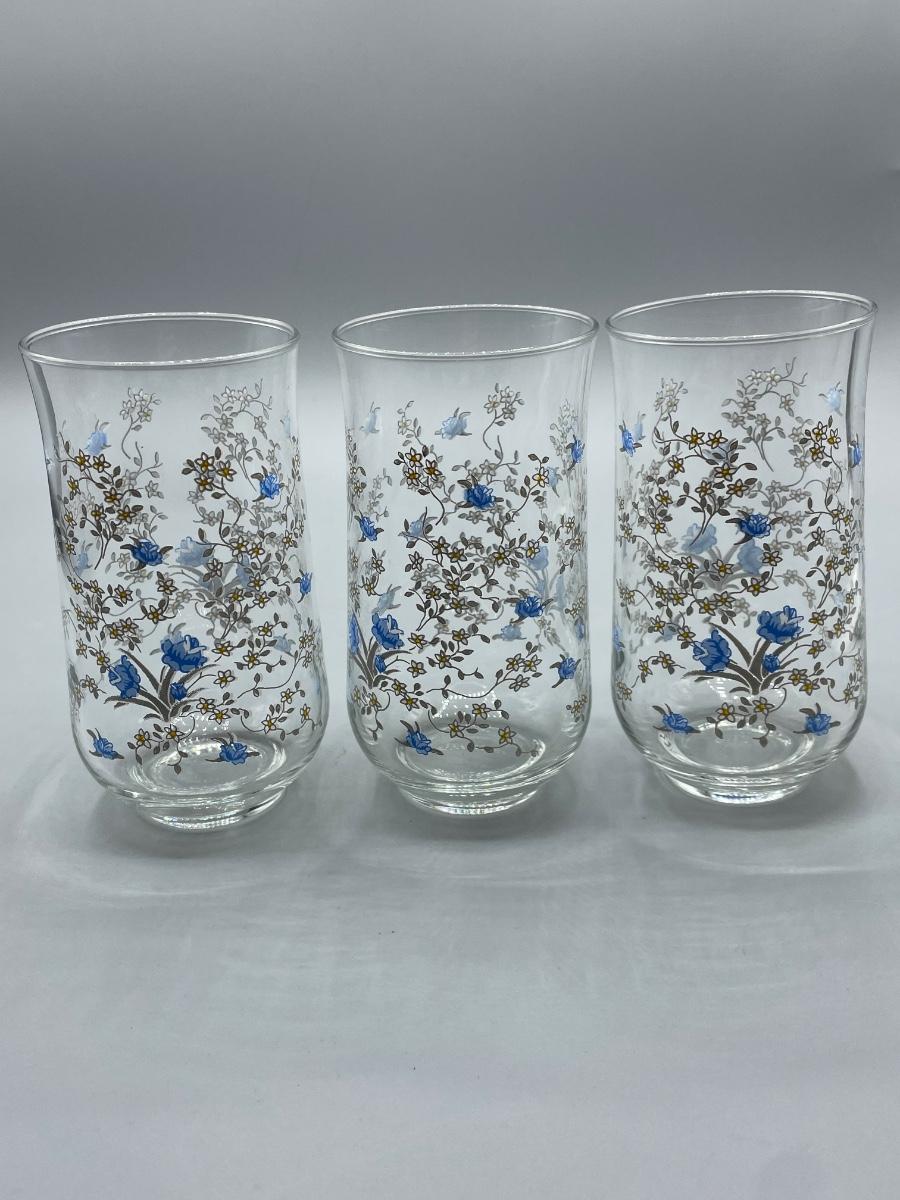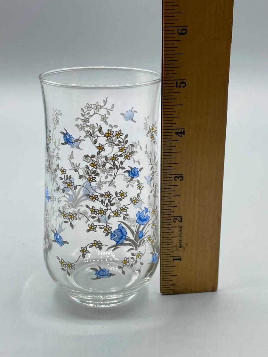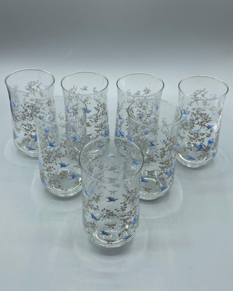 Vintage Retro Set of Seven Blue Floral Painted Drink Glasses
