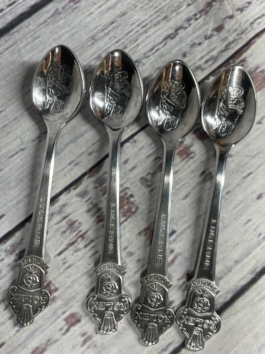 All spoons are in great condition and some come in their original packaging. This set includes: 4 Rolex Bucherer spoons, 1 Mormon Temple Spoon, 1 Park City 1884 Teaspoon, and 1 Flower designed spoon from Korea. The only spoons that aren’t in packaging are the set of 4 Rolex spoons.