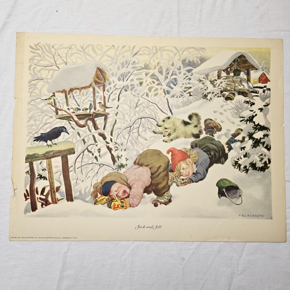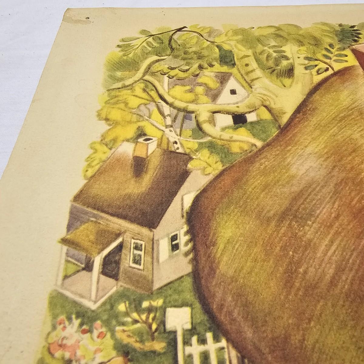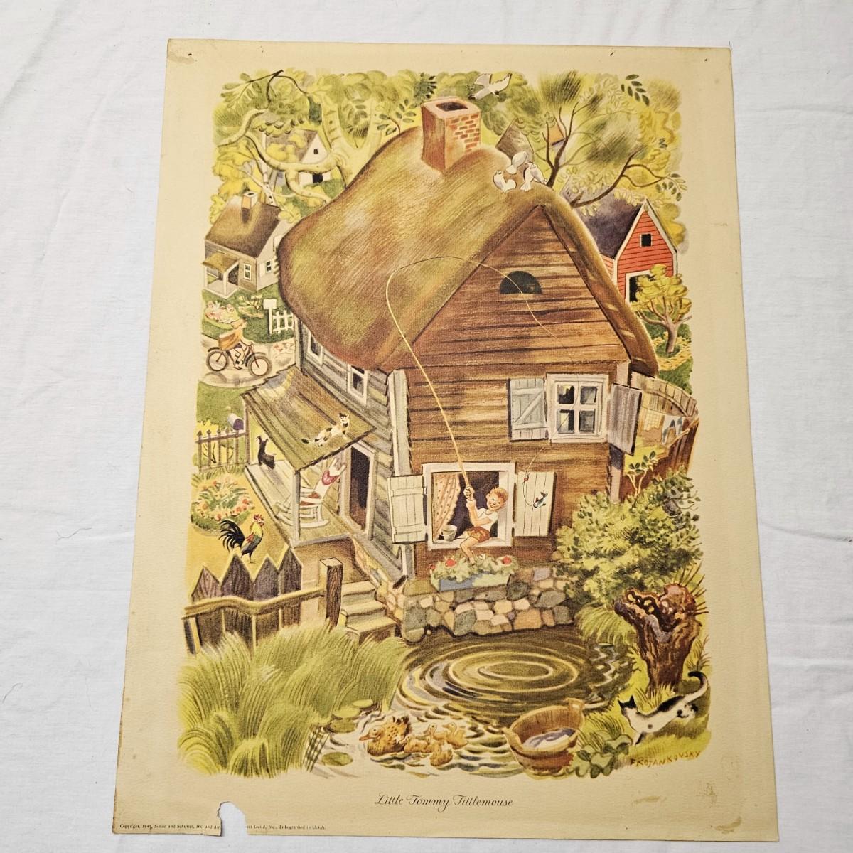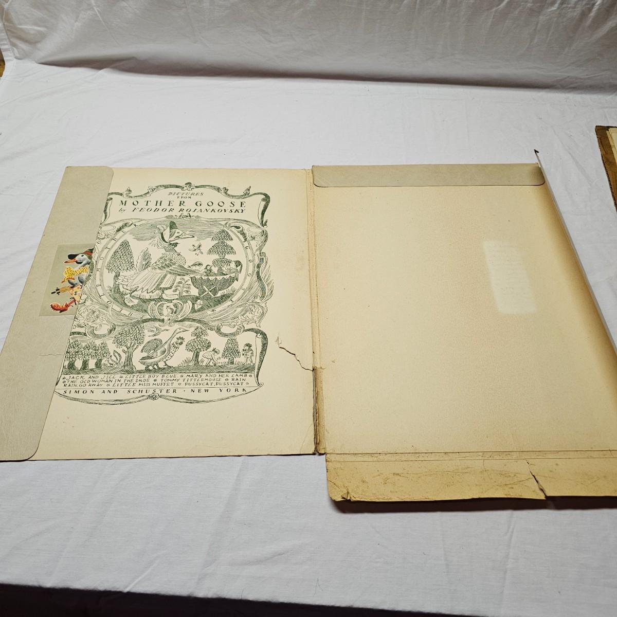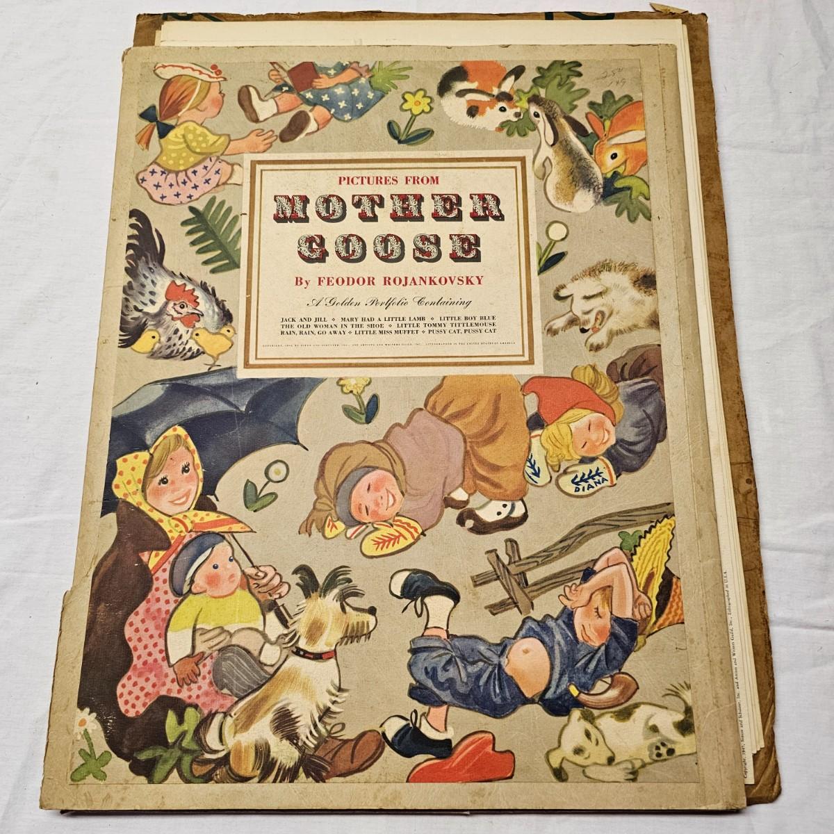 Beautiful color panels on heavy stock, a set with binder by Feodor Rojankovsky. Produced in 1945 by Simon & Schuster and are part of the Golden Library of children's publications. Six of the prints are loose, on is stuck on cardboard and slightly torn at the top. All prints measure 14.25" x 18.75". Portfolio binder is 15"W x 19"H. Set is missing one print of The Old Woman in the Shoe. Some discoloring and tears on the prints. See photos for details. Shipping available.