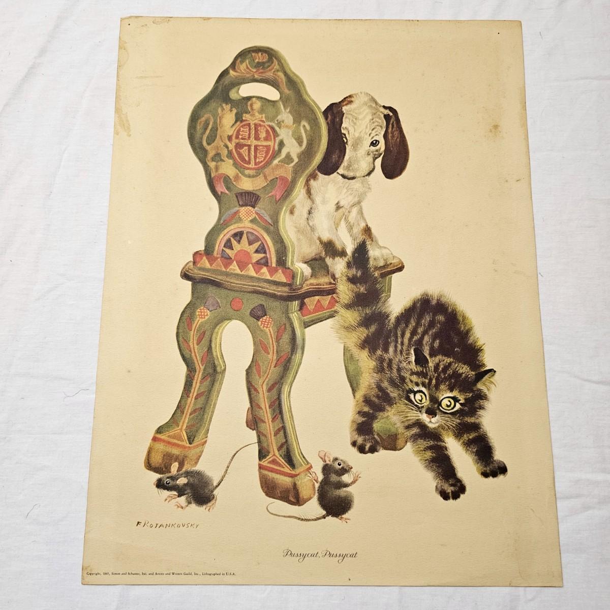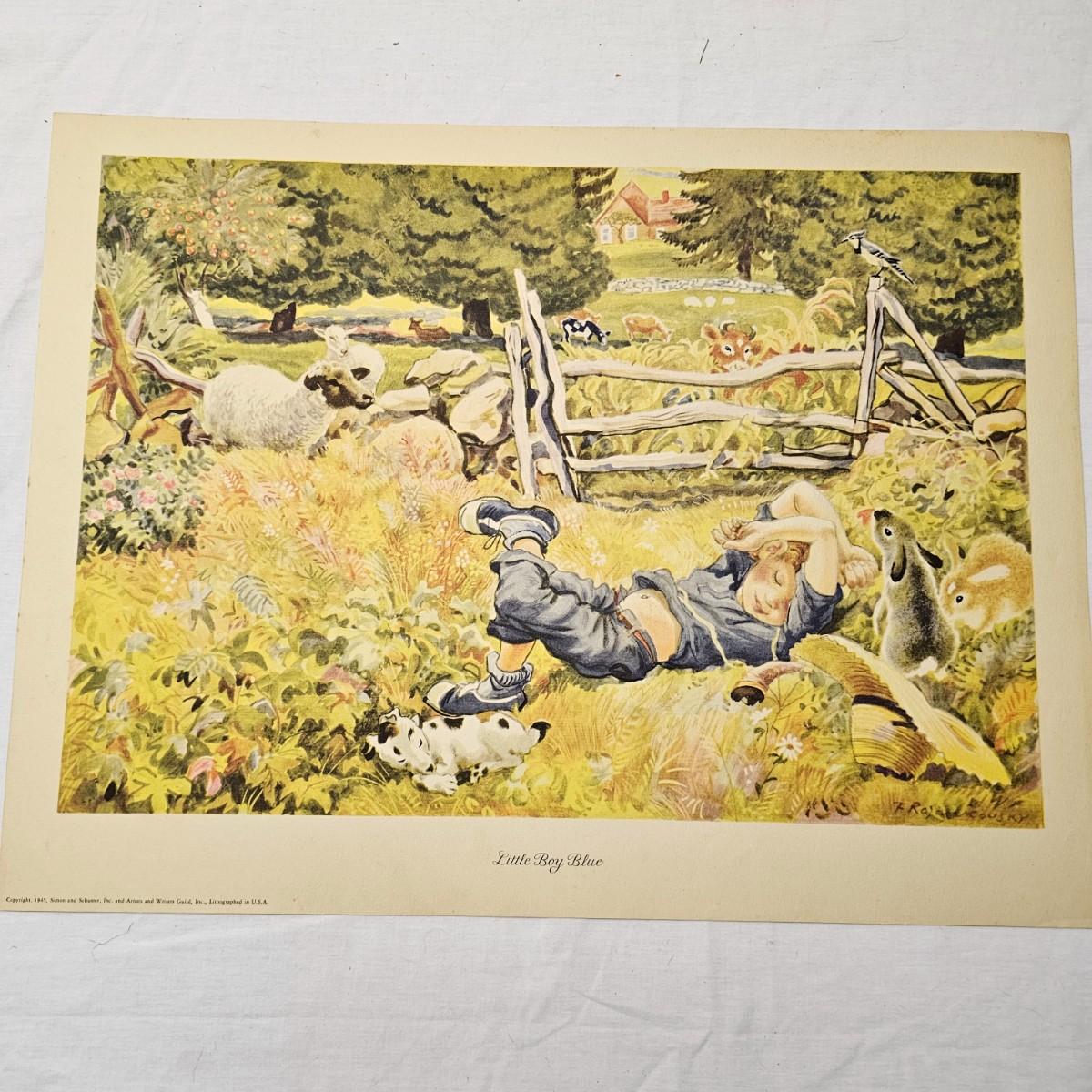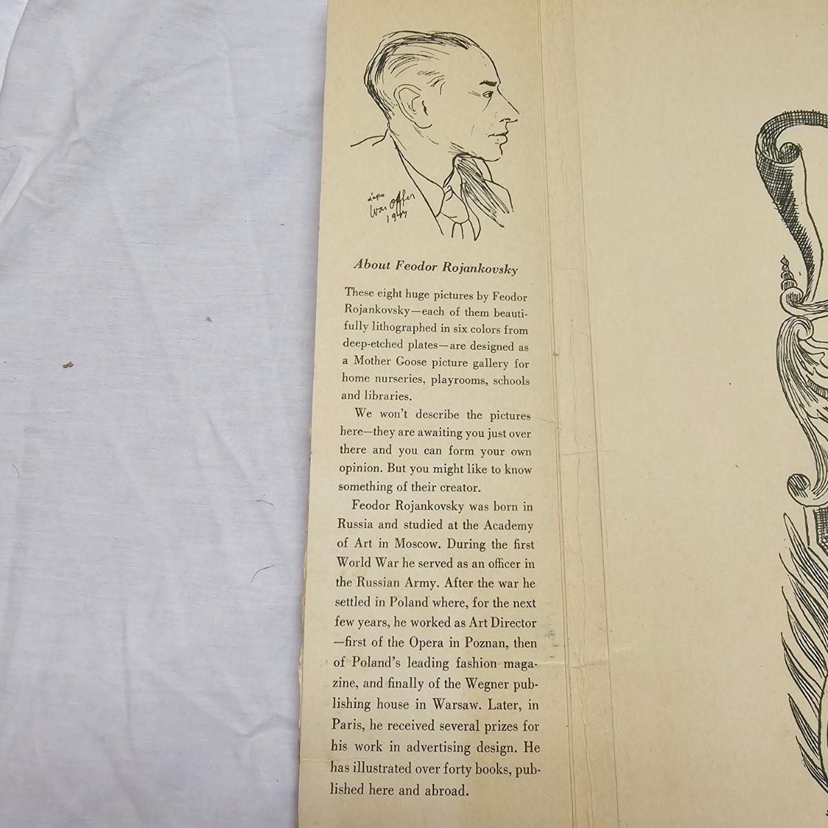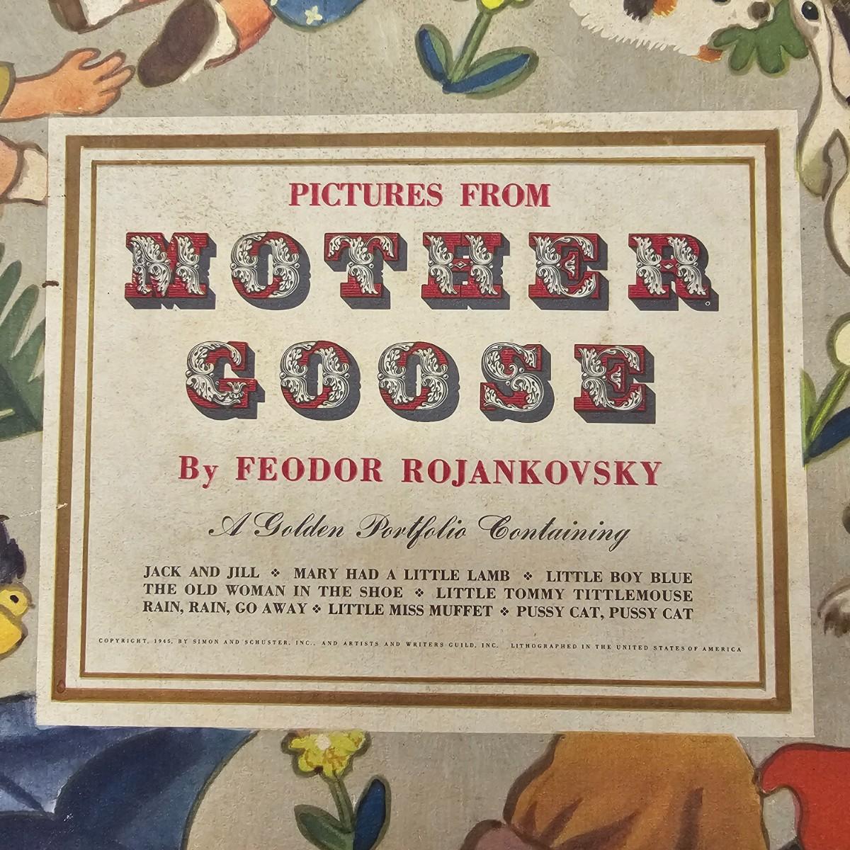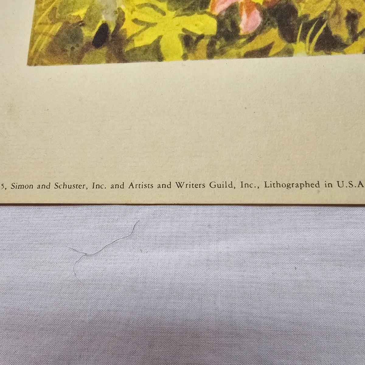 Beautiful color panels on heavy stock, a set with binder by Feodor Rojankovsky. Produced in 1945 by Simon & Schuster and are part of the Golden Library of children's publications. Six of the prints are loose, on is stuck on cardboard and slightly torn at the top. All prints measure 14.25" x 18.75". Portfolio binder is 15"W x 19"H. Set is missing one print of The Old Woman in the Shoe. Some discoloring and tears on the prints. See photos for details. Shipping available.