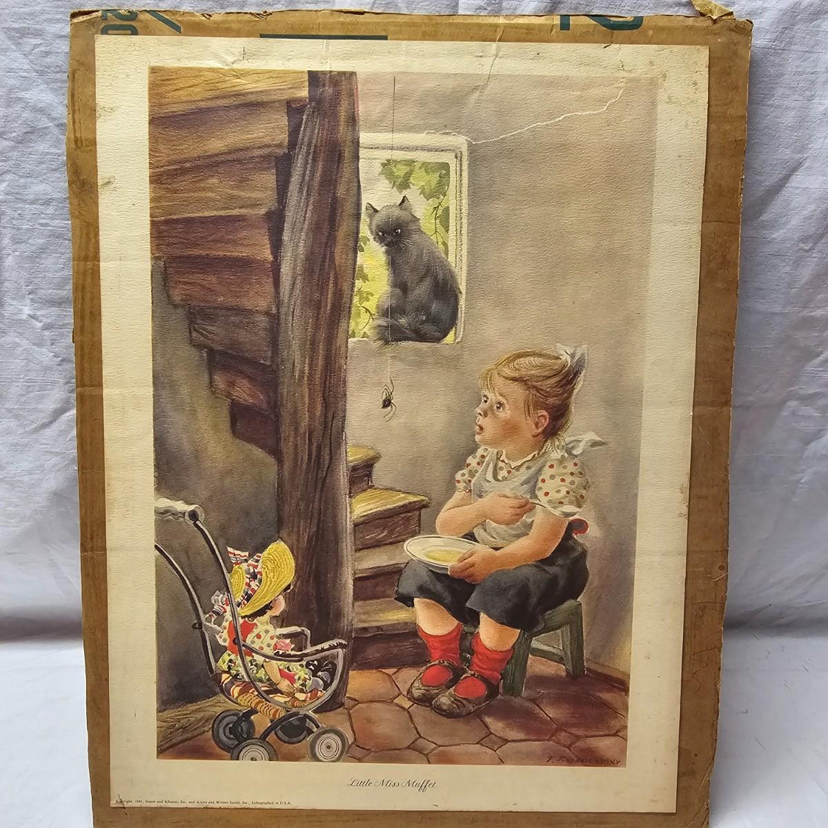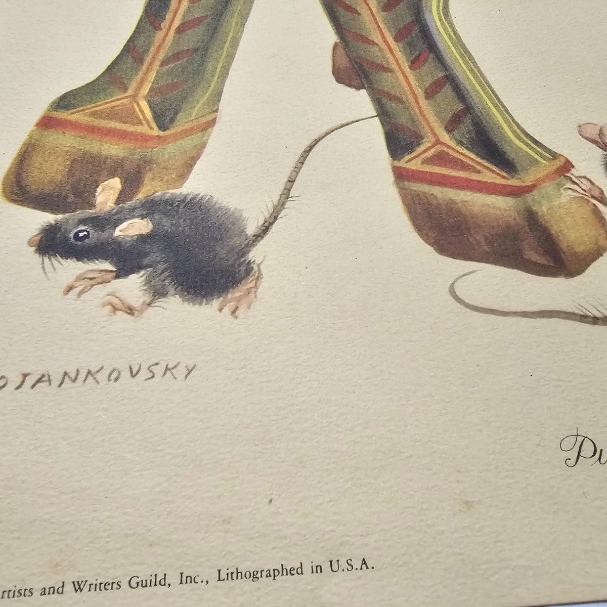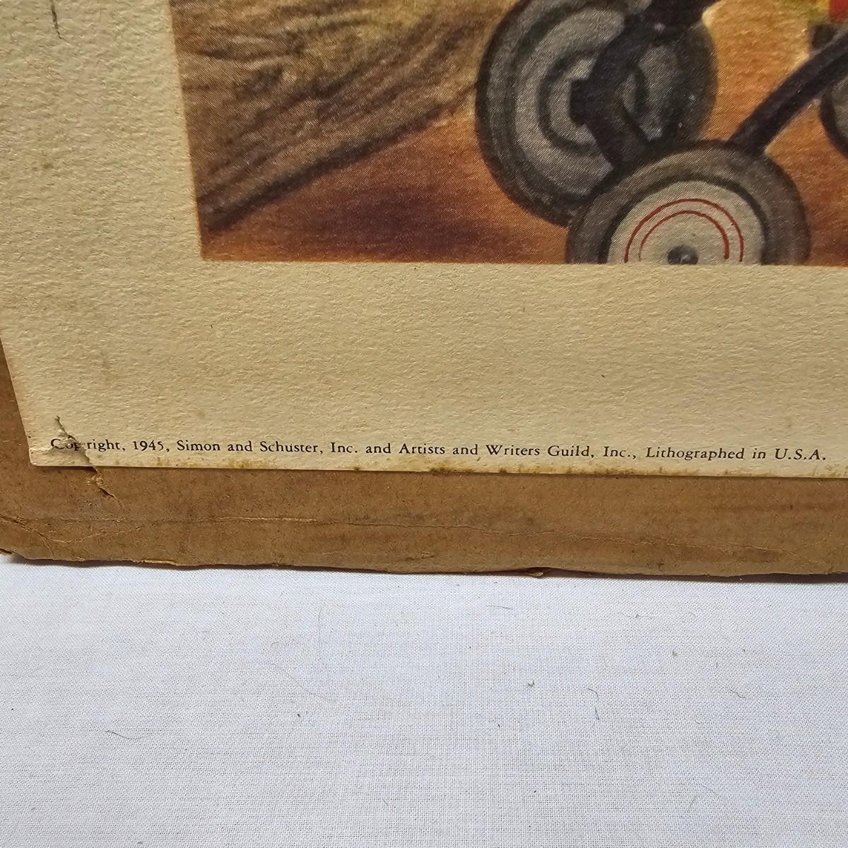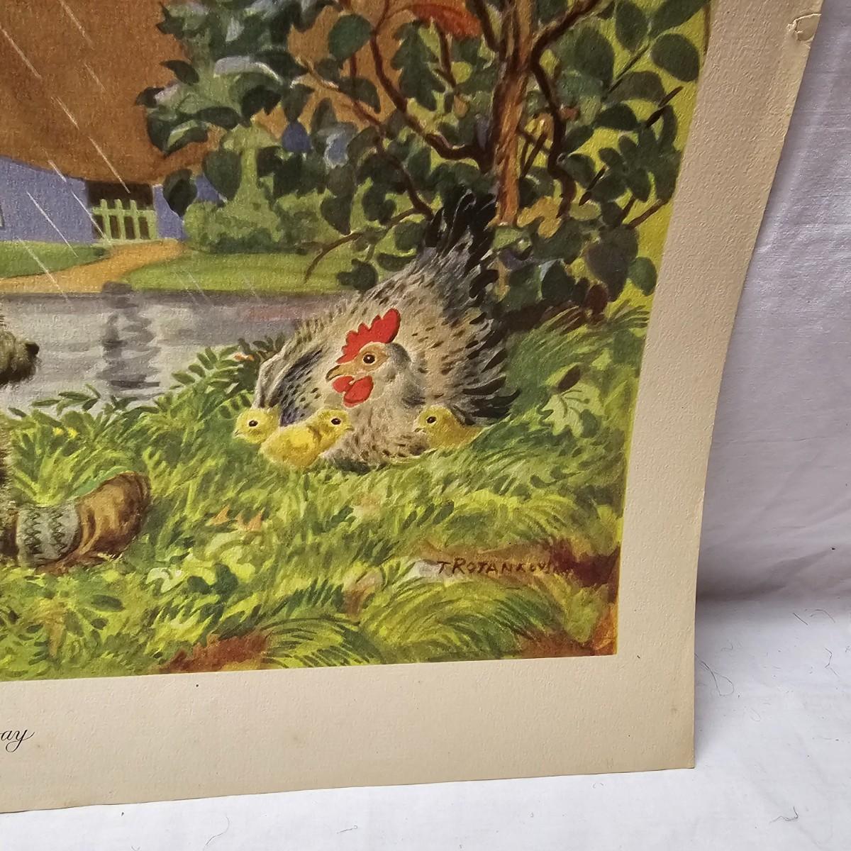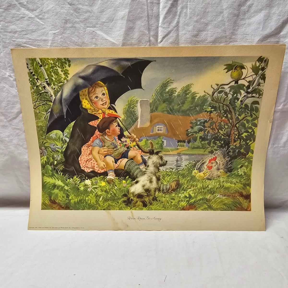 Beautiful color panels on heavy stock, a set with binder by Feodor Rojankovsky. Produced in 1945 by Simon & Schuster and are part of the Golden Library of children's publications. Six of the prints are loose, on is stuck on cardboard and slightly torn at the top. All prints measure 14.25" x 18.75". Portfolio binder is 15"W x 19"H. Set is missing one print of The Old Woman in the Shoe. Some discoloring and tears on the prints. See photos for details. Shipping available.