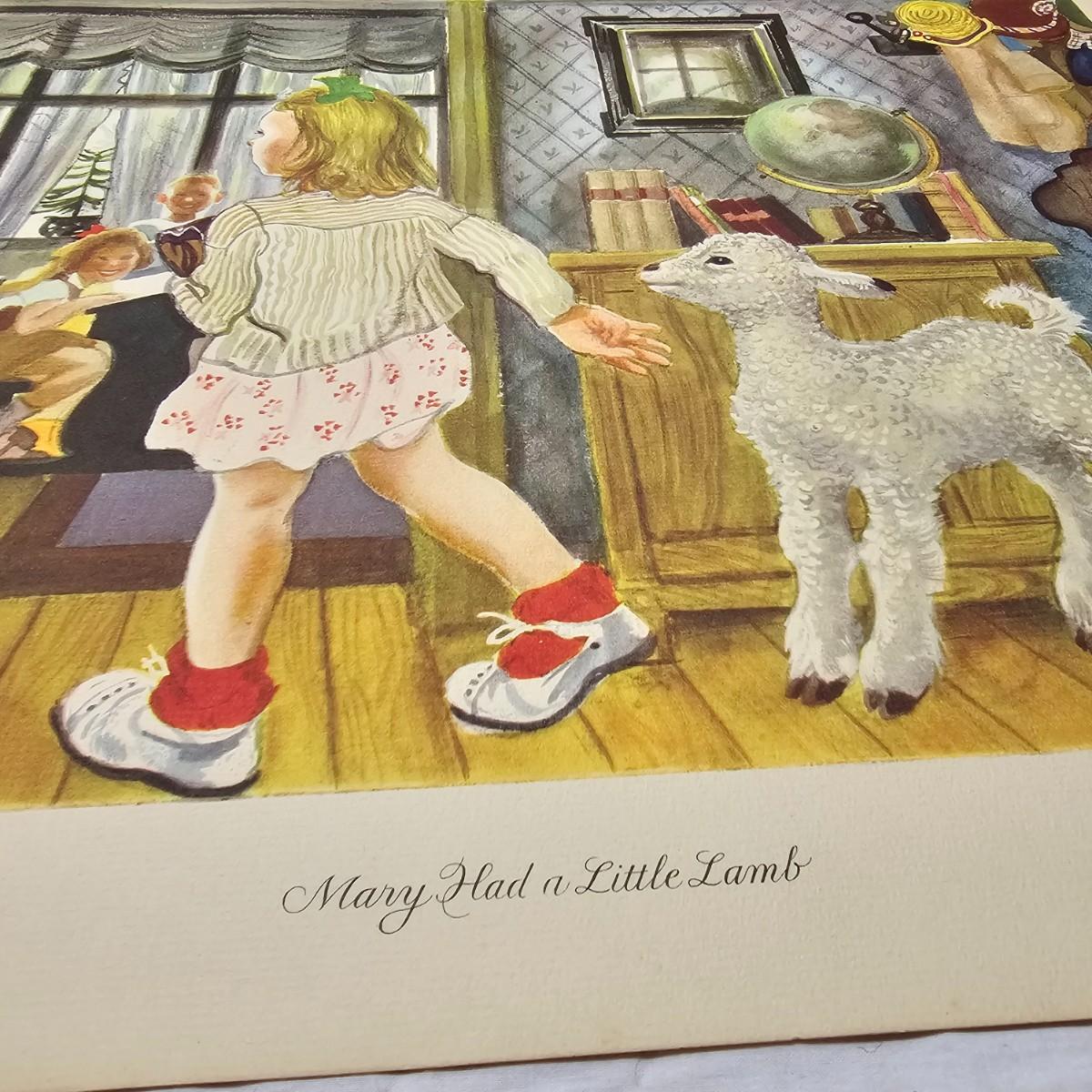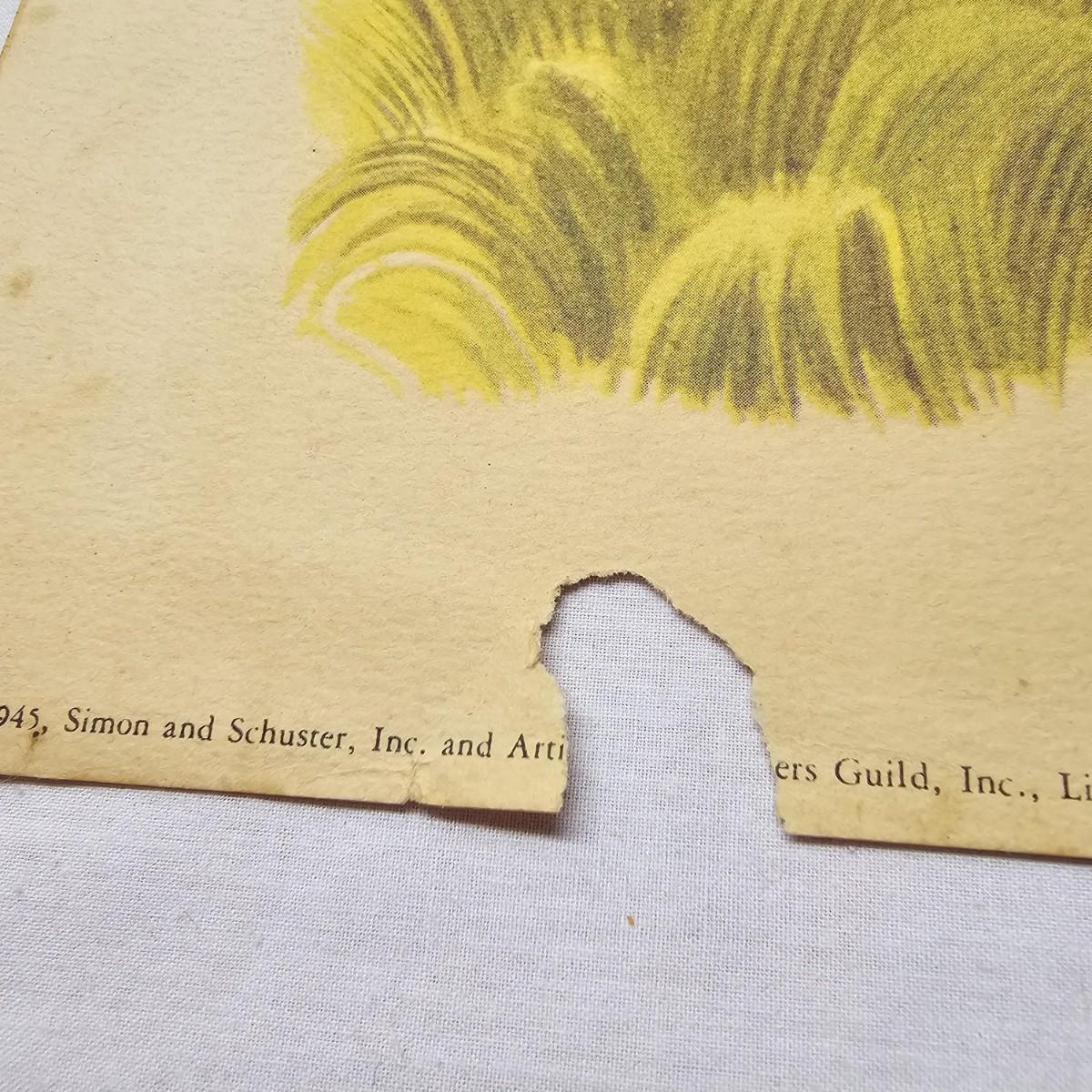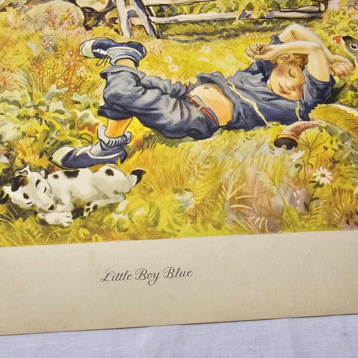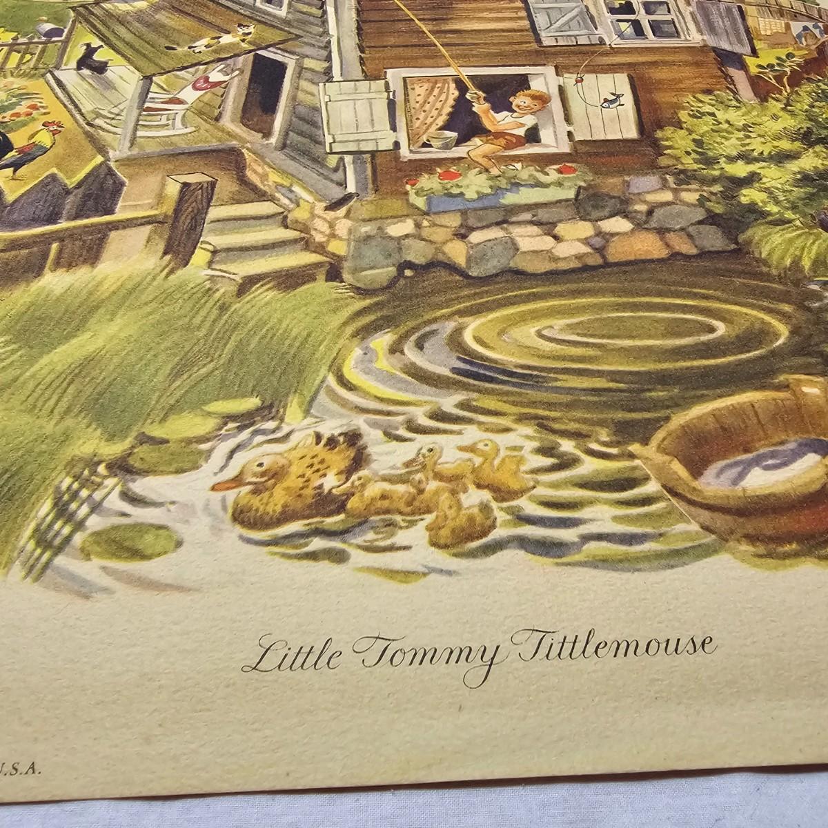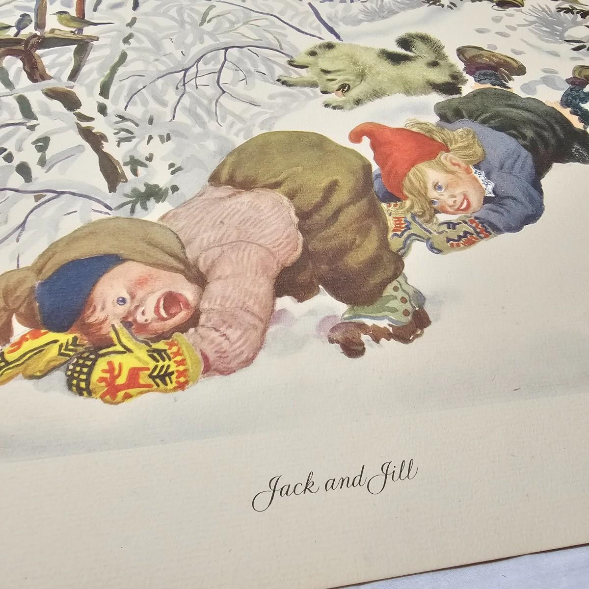 Beautiful color panels on heavy stock, a set with binder by Feodor Rojankovsky. Produced in 1945 by Simon & Schuster and are part of the Golden Library of children's publications. Six of the prints are loose, on is stuck on cardboard and slightly torn at the top. All prints measure 14.25" x 18.75". Portfolio binder is 15"W x 19"H. Set is missing one print of The Old Woman in the Shoe. Some discoloring and tears on the prints. See photos for details. Shipping available.