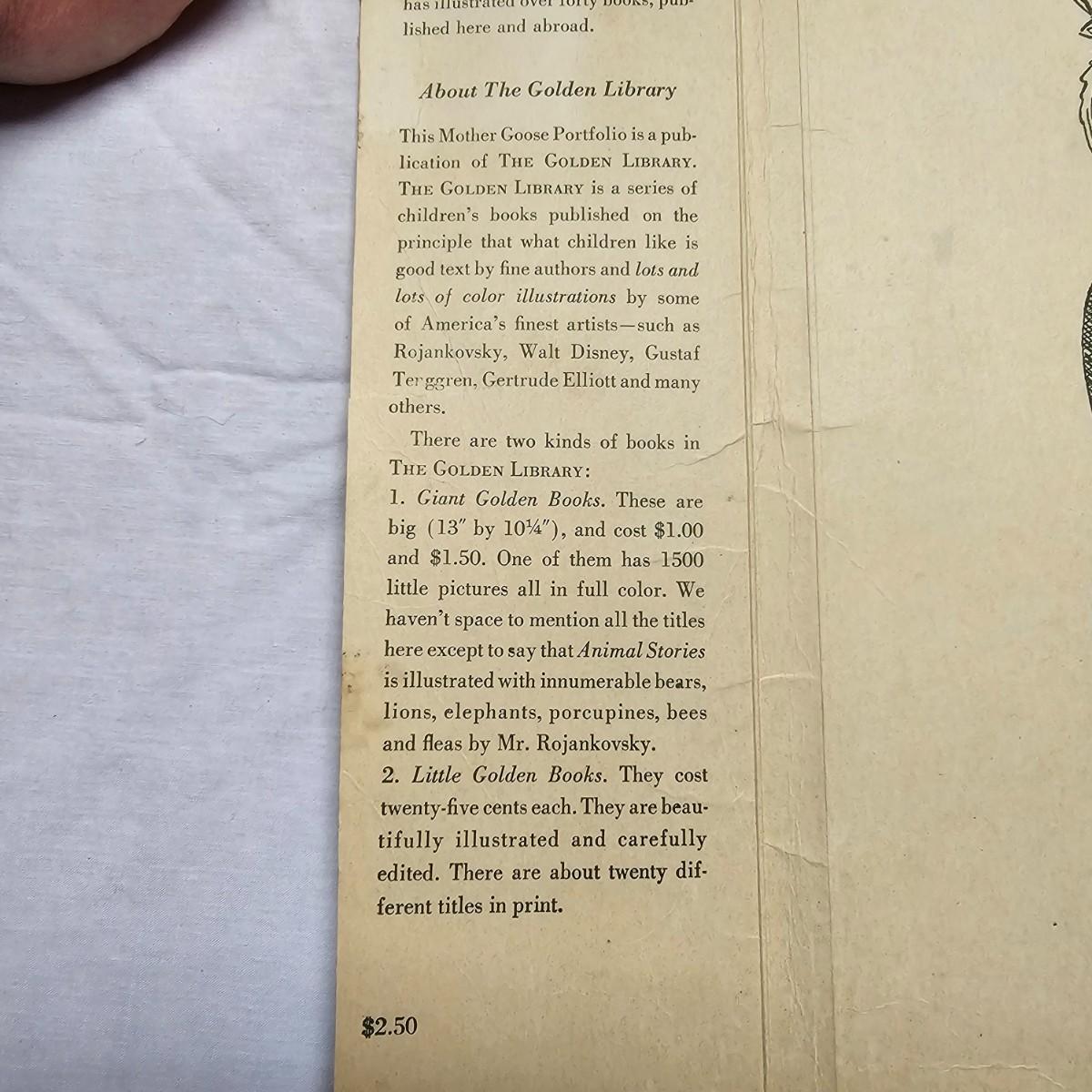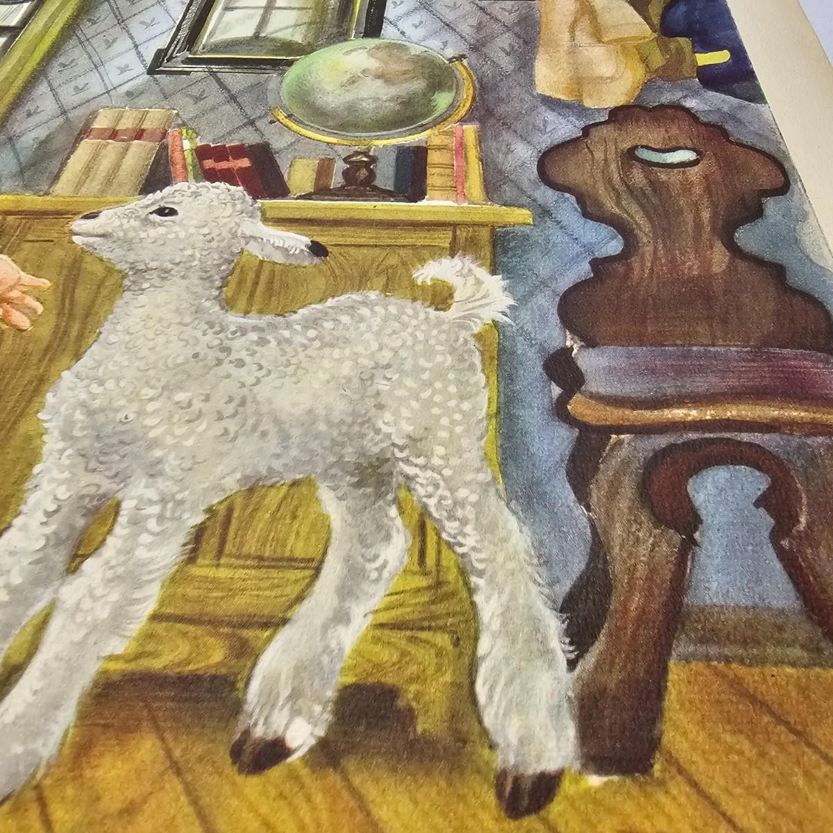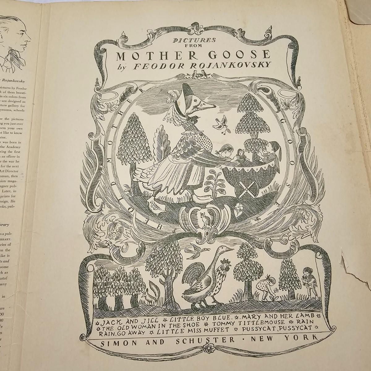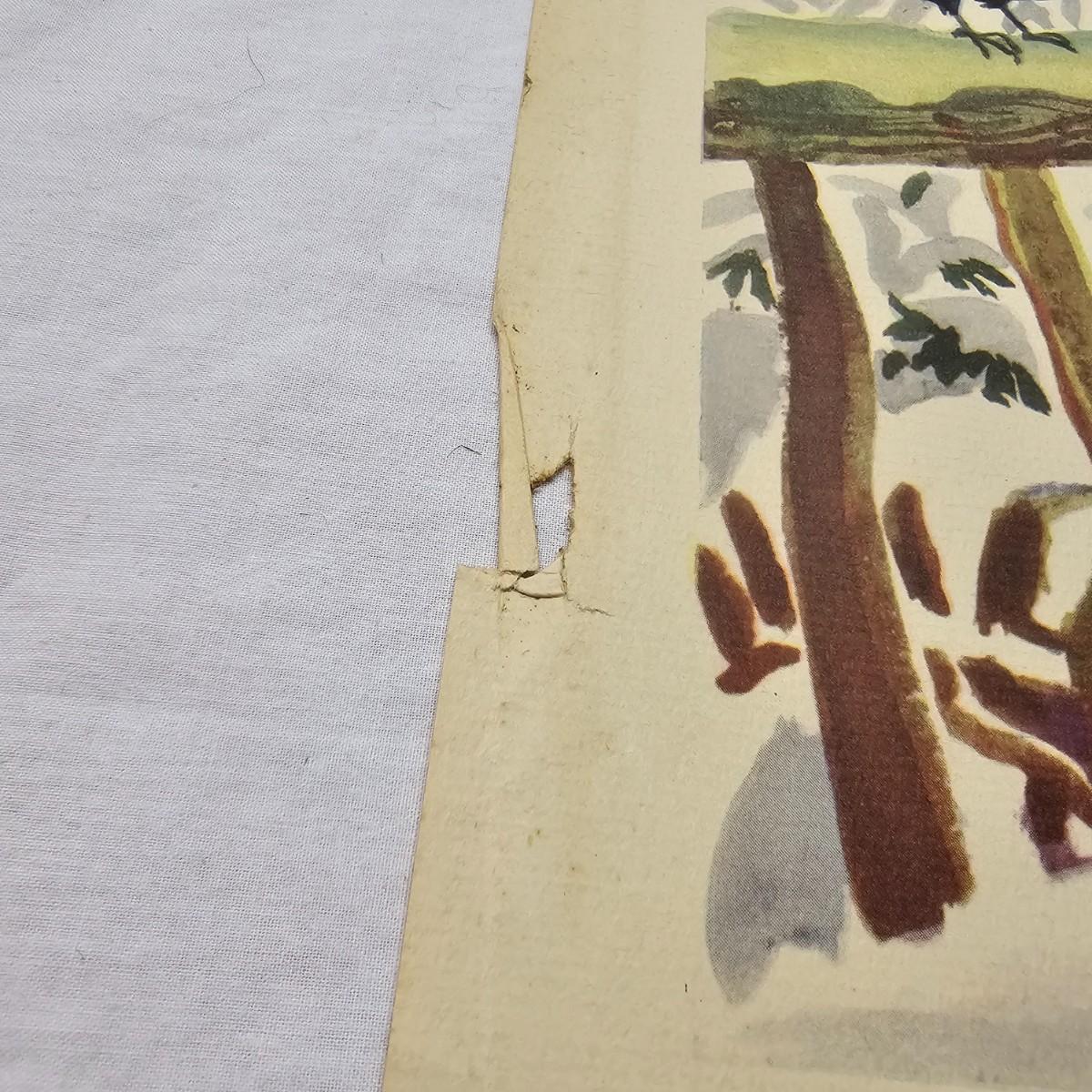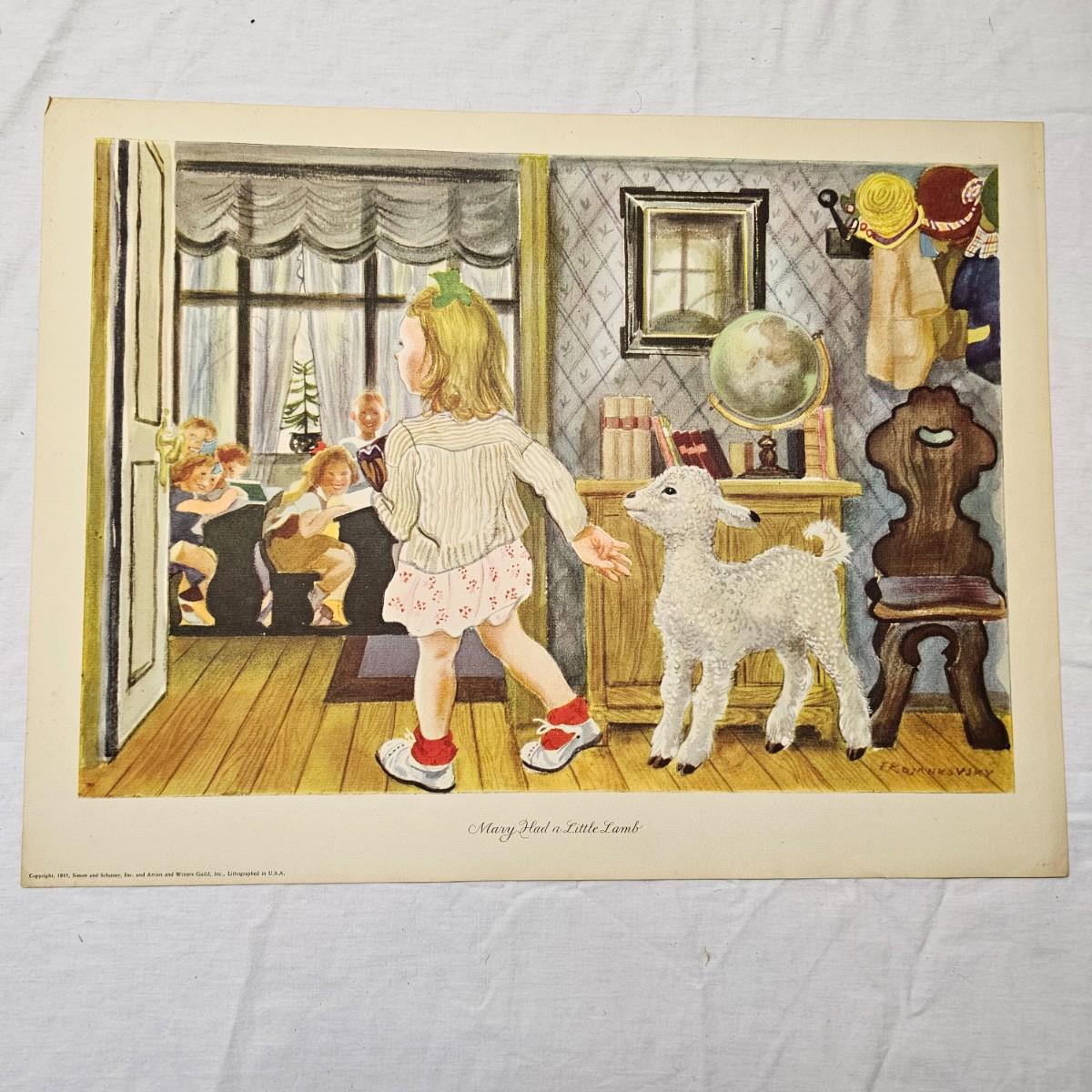 Beautiful color panels on heavy stock, a set with binder by Feodor Rojankovsky. Produced in 1945 by Simon & Schuster and are part of the Golden Library of children's publications. Six of the prints are loose, on is stuck on cardboard and slightly torn at the top. All prints measure 14.25" x 18.75". Portfolio binder is 15"W x 19"H. Set is missing one print of The Old Woman in the Shoe. Some discoloring and tears on the prints. See photos for details. Shipping available.