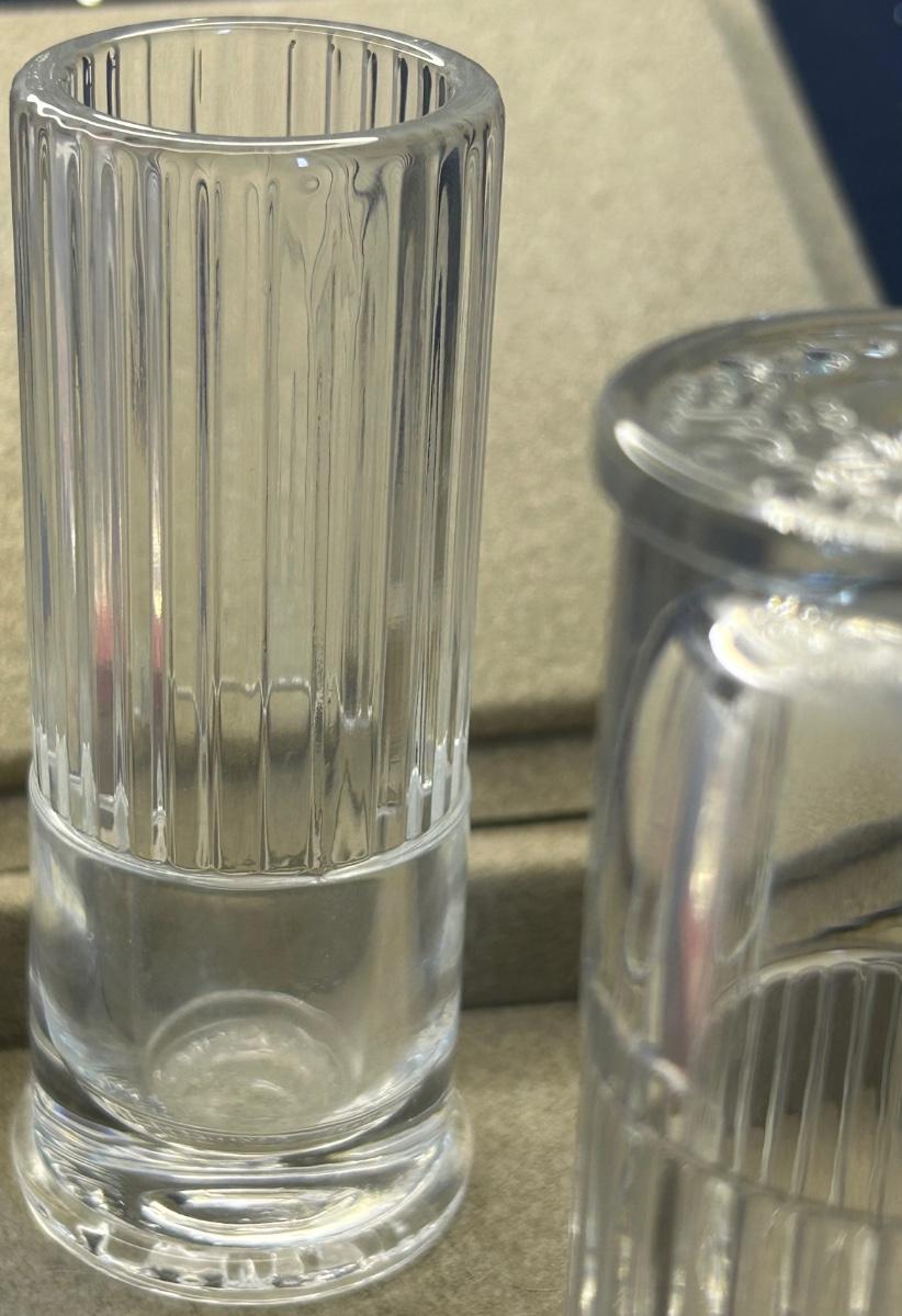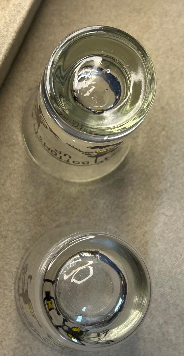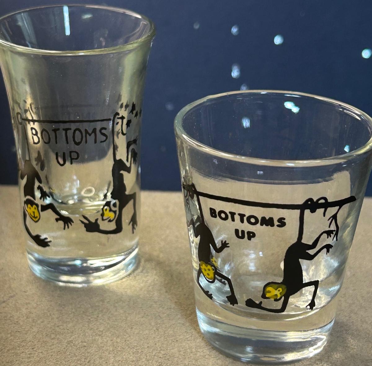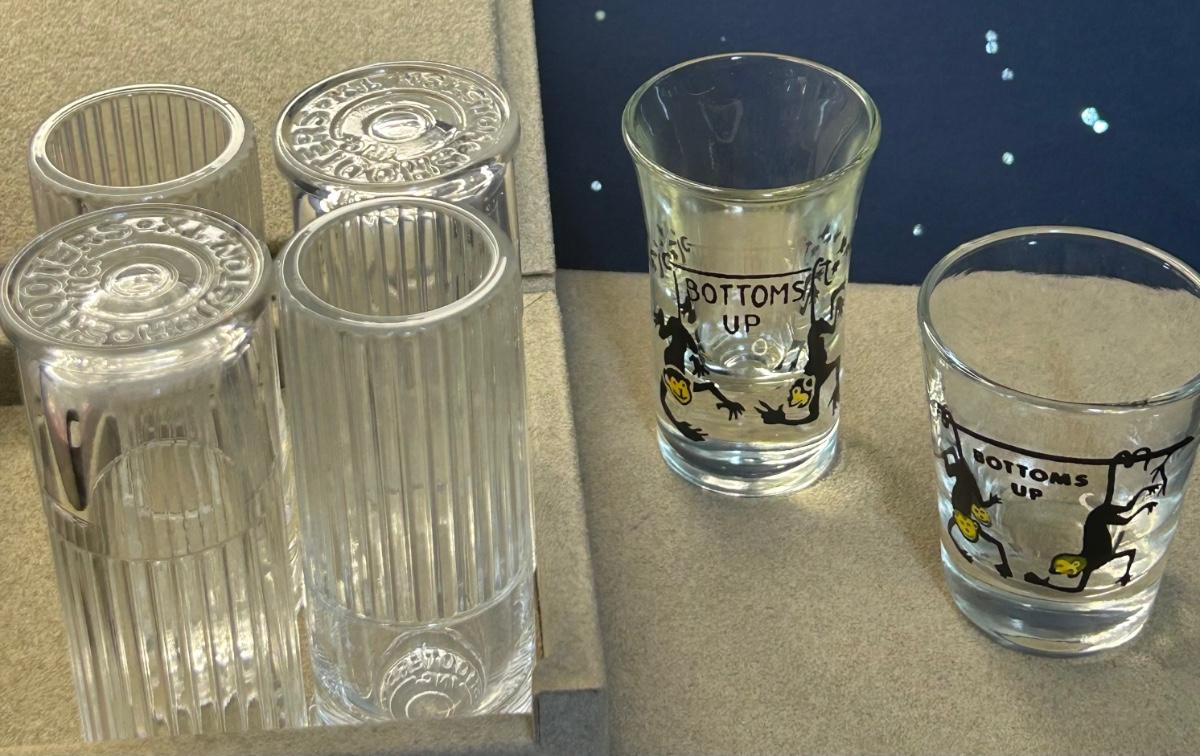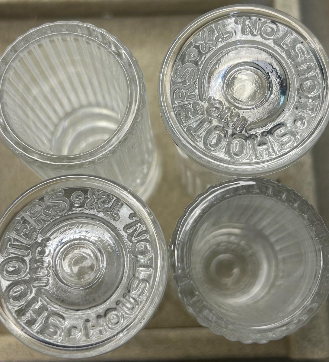 Bottoms up & a set of 4 that resemble bullets & say SHOOTERS INC. HOUSTON TX. on the bottom. Pretty heavy.