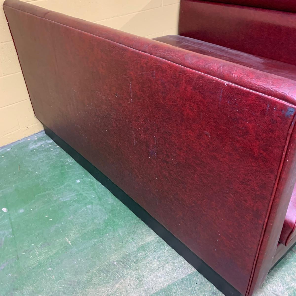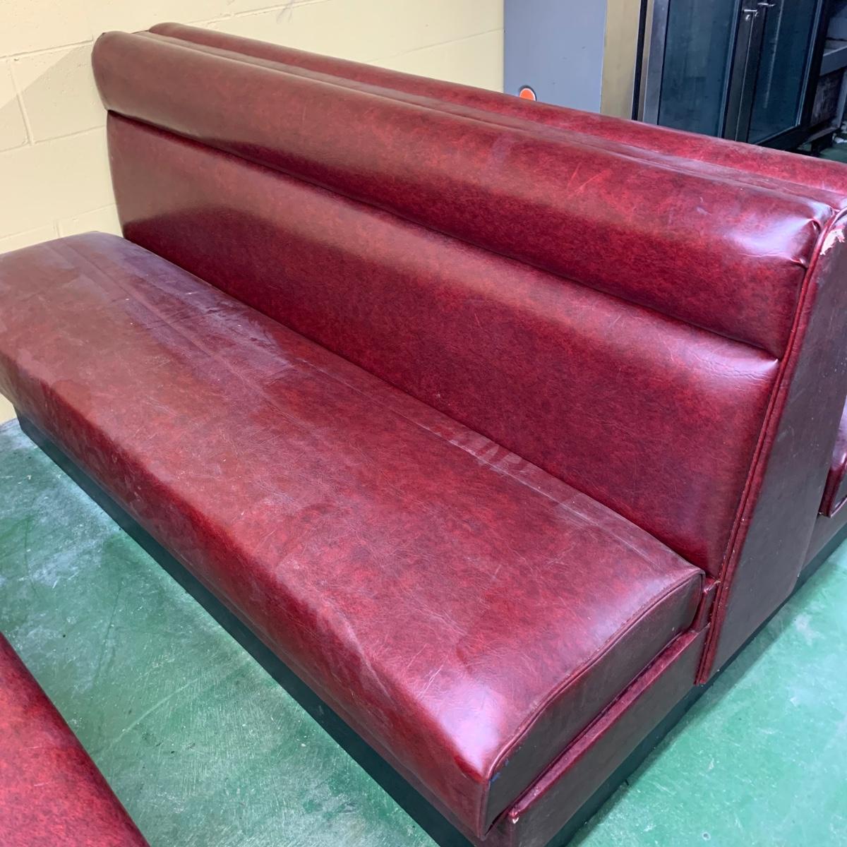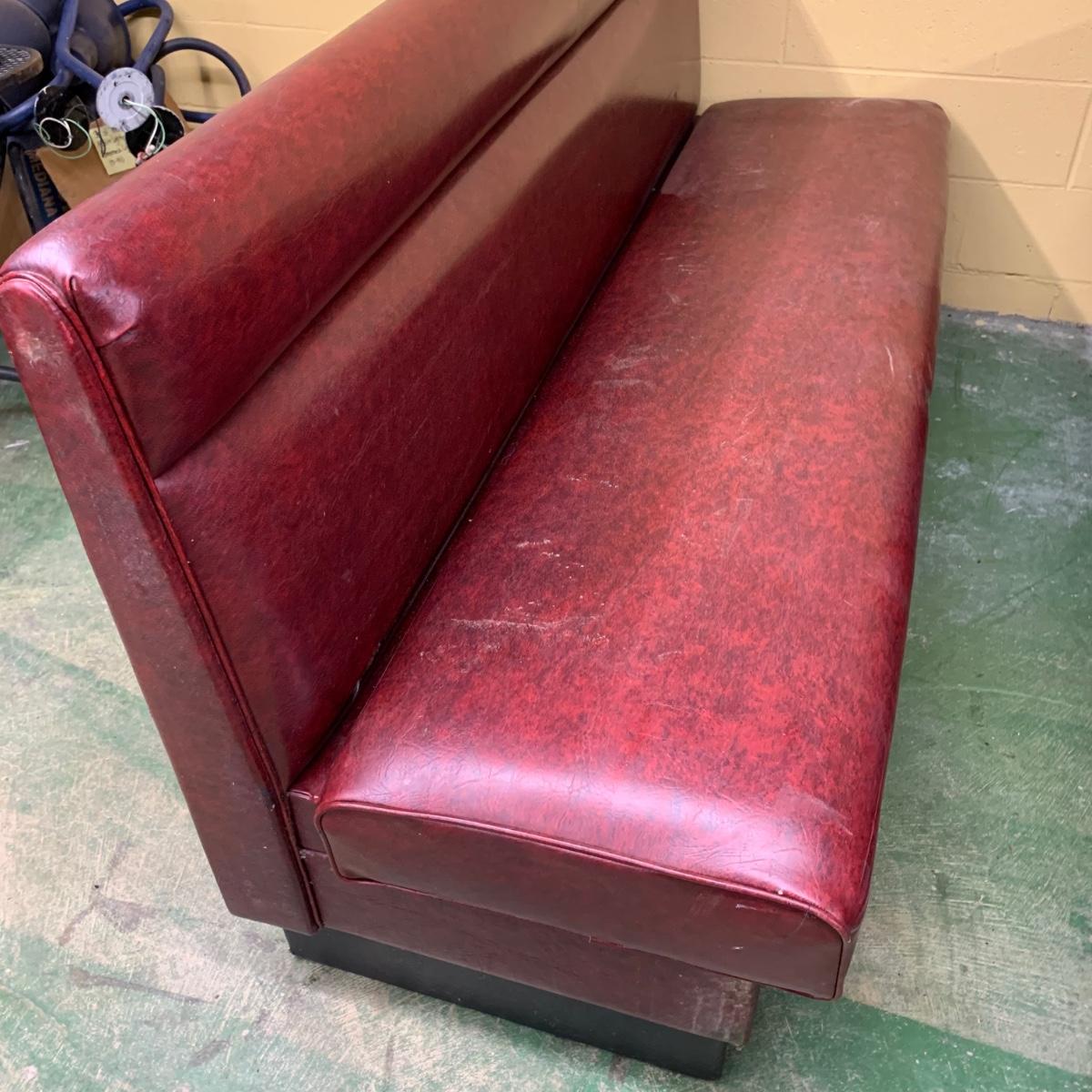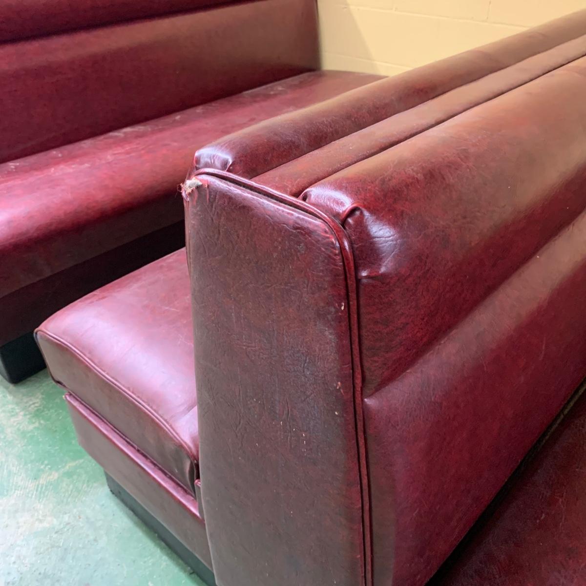 In this set there are four single three-person booths and two double three-person Carolina Custom booths. They measure approximately 71” long with a 19” seat height. The backs are approximately 36” tall. The seats have solid wooden bases and are covered with High-Naugahyde Rogue 11-Crimson. Seats are removable. Seat covers are in various conditions. Have been used in a restaurant. Seats will need a thorough cleaning before their next use. See other lots in this auction for matching booths of different shapes and sizes. Local pickup only. There is easy access to load these items into your vehicle through a door in the room they are located in to the parking lot. They will not have to be moved up or down any stairs. We recommend the winning bidder bring help to load these items.