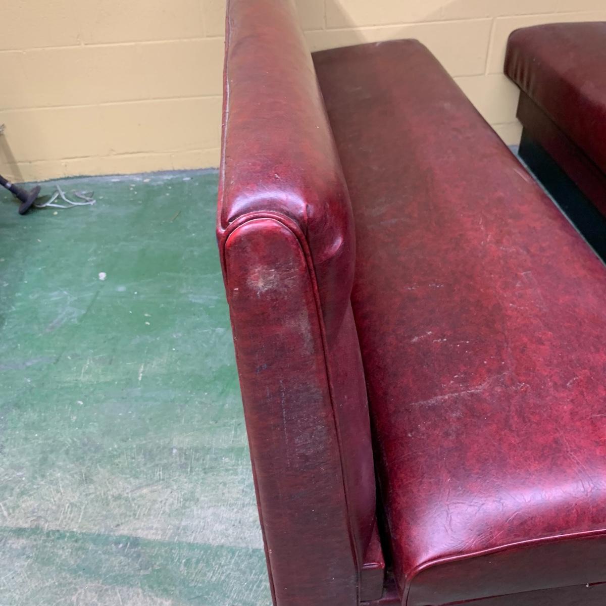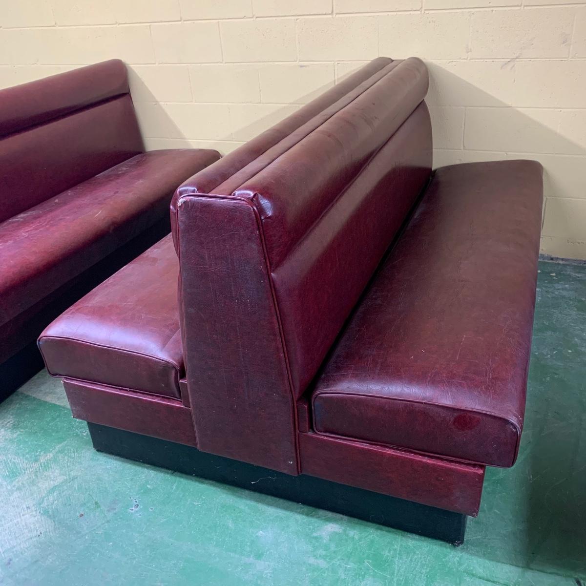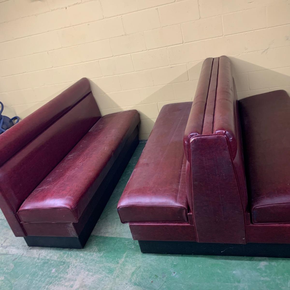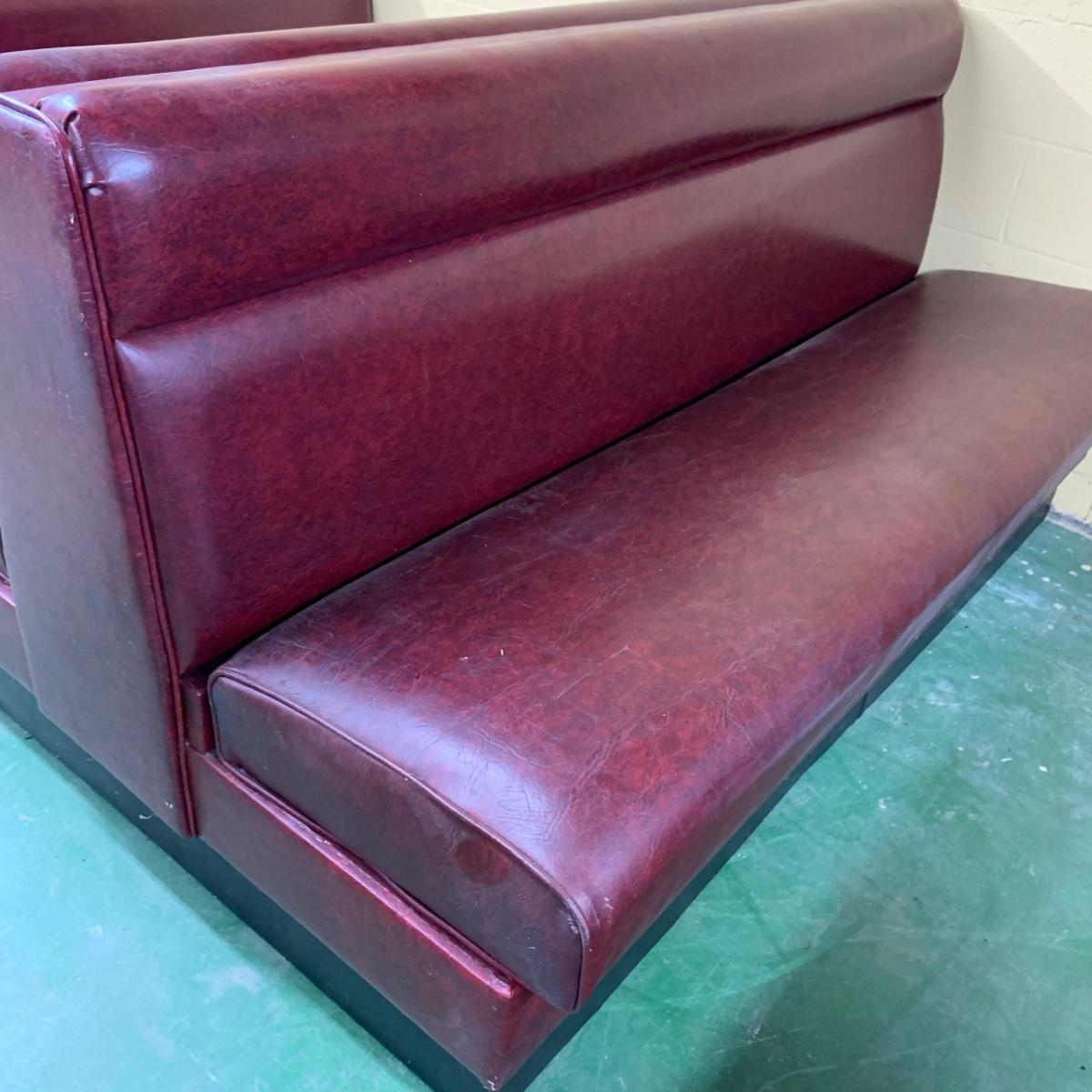 In this set there are four single three-person booths and two double three-person Carolina Custom booths. They measure approximately 71” long with a 19” seat height. The backs are approximately 36” tall. The seats have solid wooden bases and are covered with High-Naugahyde Rogue 11-Crimson. Seats are removable. Seat covers are in various conditions. Have been used in a restaurant. Seats will need a thorough cleaning before their next use. See other lots in this auction for matching booths of different shapes and sizes. Local pickup only. There is easy access to load these items into your vehicle through a door in the room they are located in to the parking lot. They will not have to be moved up or down any stairs. We recommend the winning bidder bring help to load these items.