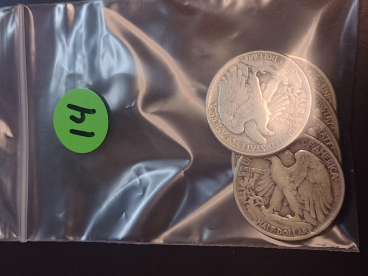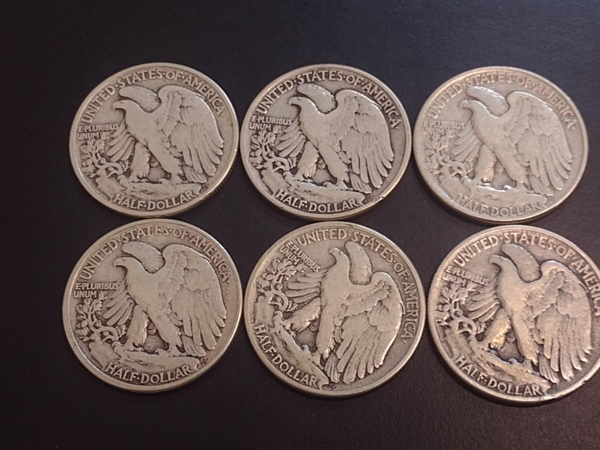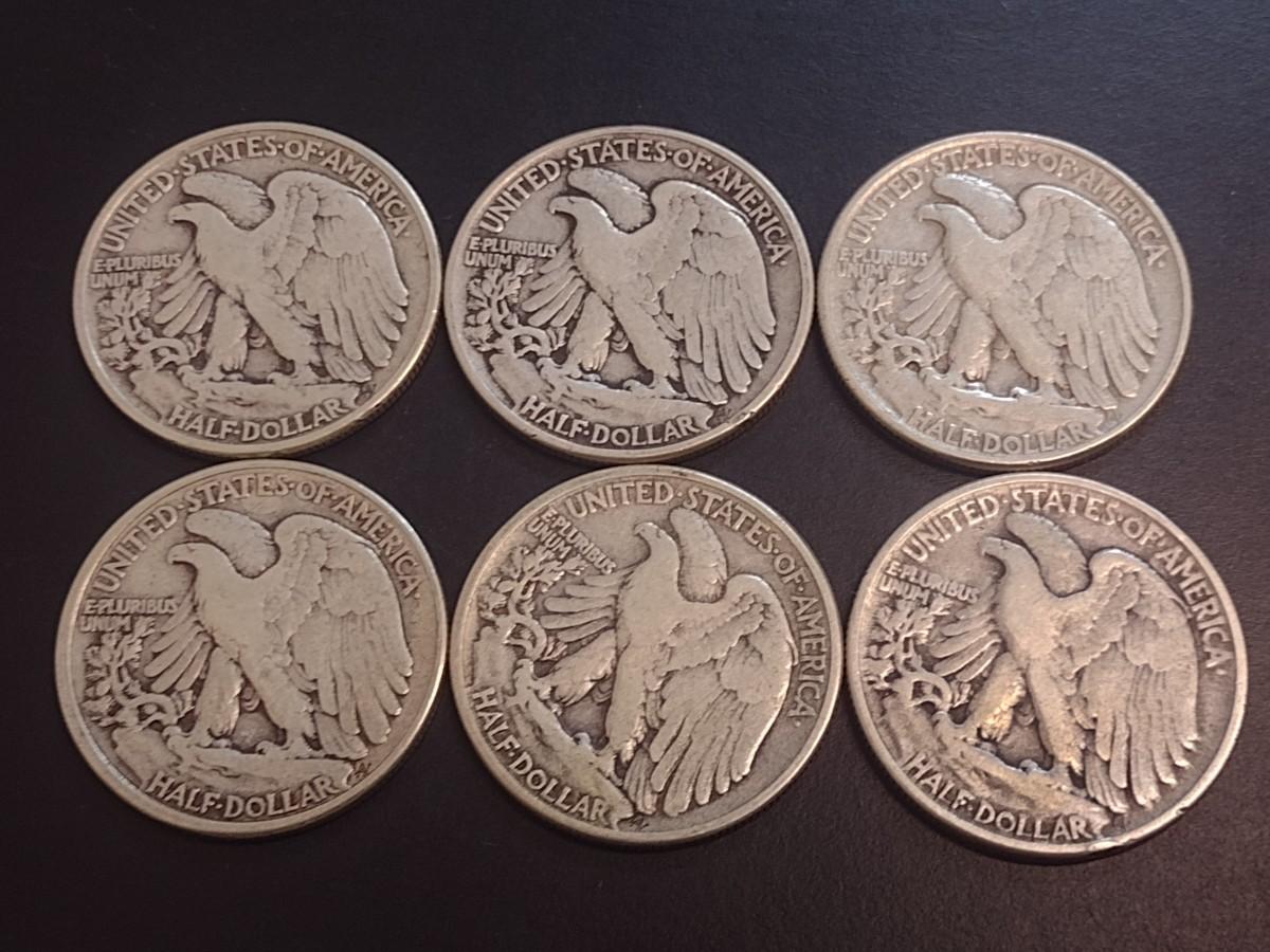 Set of Six 1945 U.S. Mint Walking Liberty Silver Half Dollars Circulated (14)