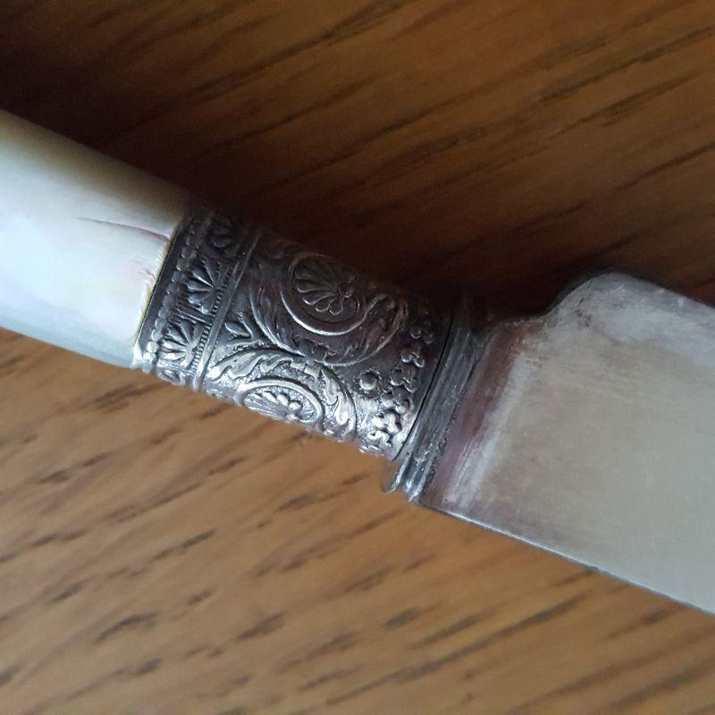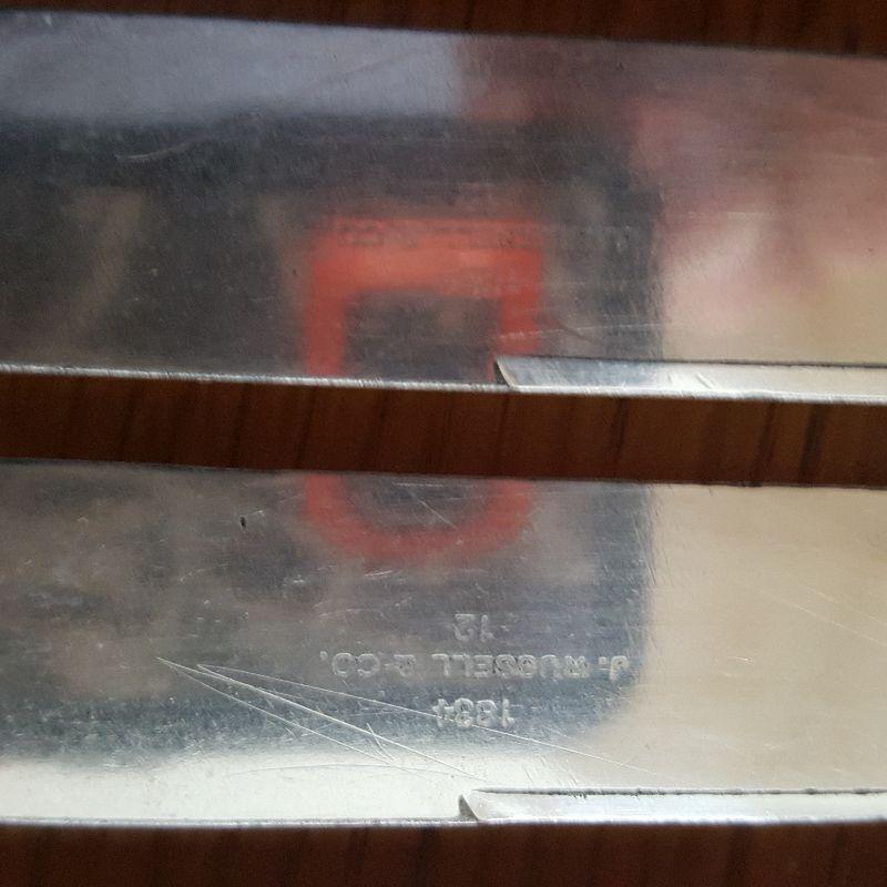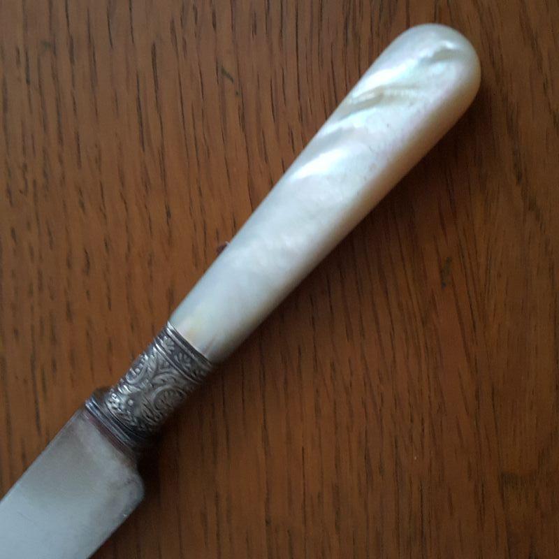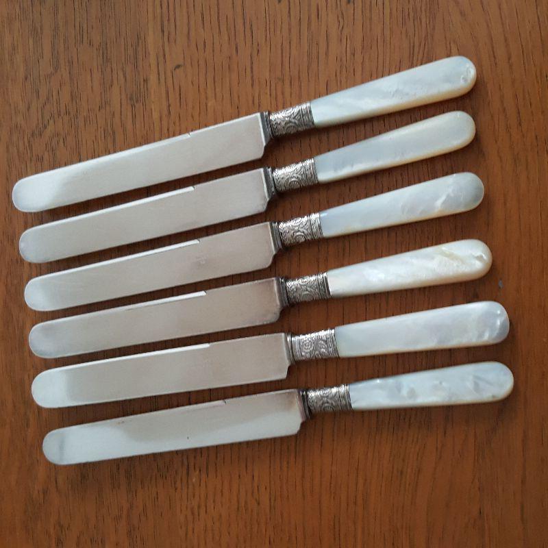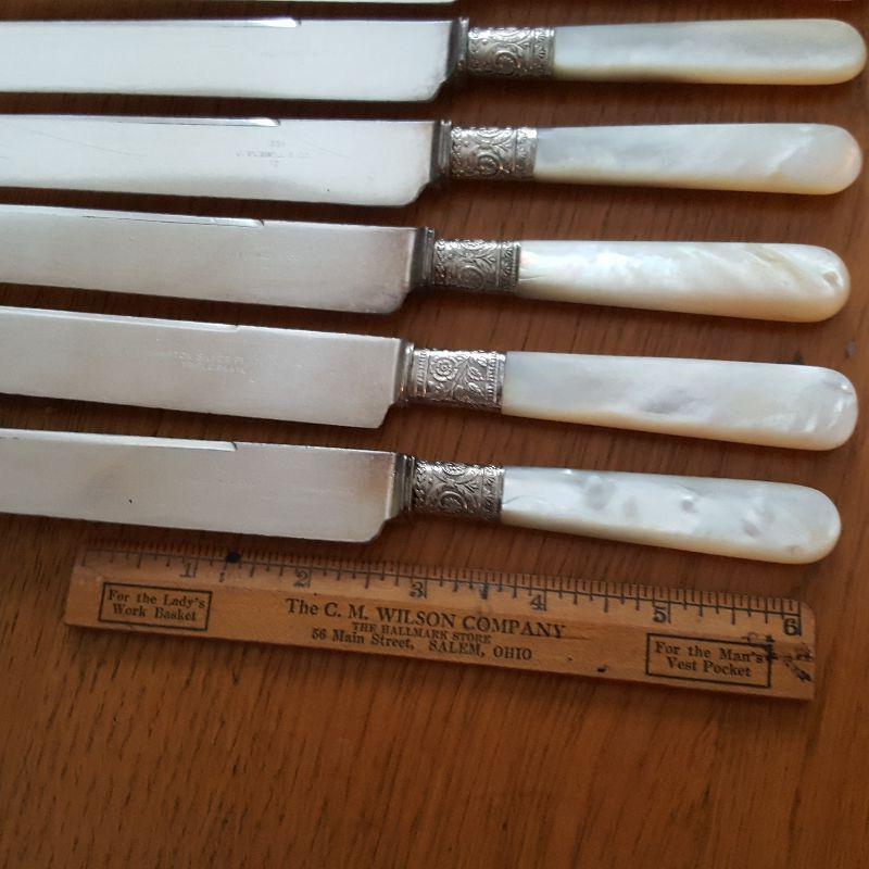 This auction lot is for a Set of Six Antique Mother of Pearl Handled Knives. These wonderful antique knives are quite the find. Five the six knives are marked 1884 J. Russell & Company, the remaining knife is marked Hampton Silver Plate Company - Triple Plate.