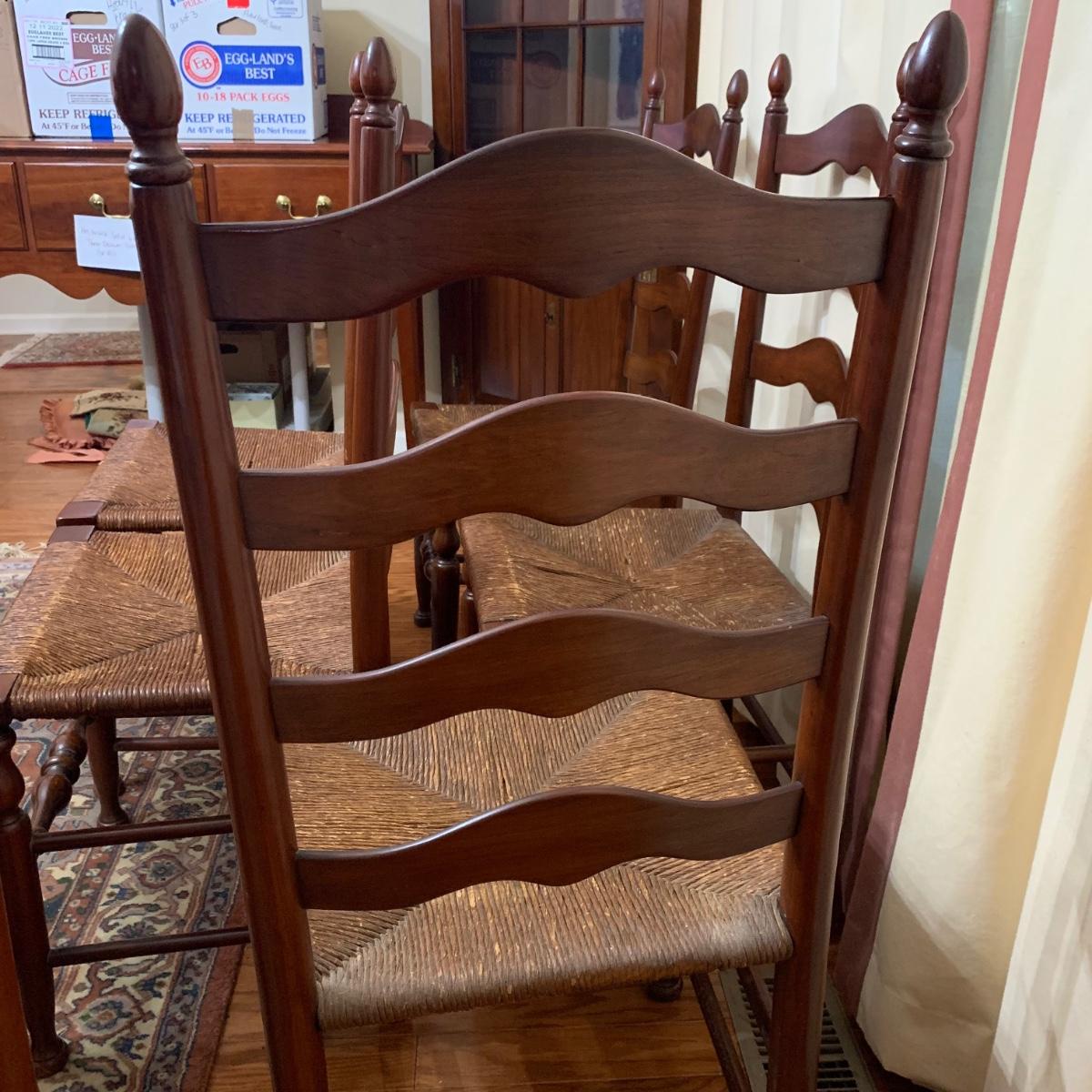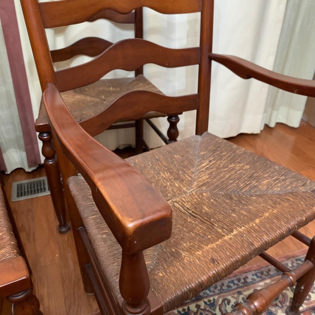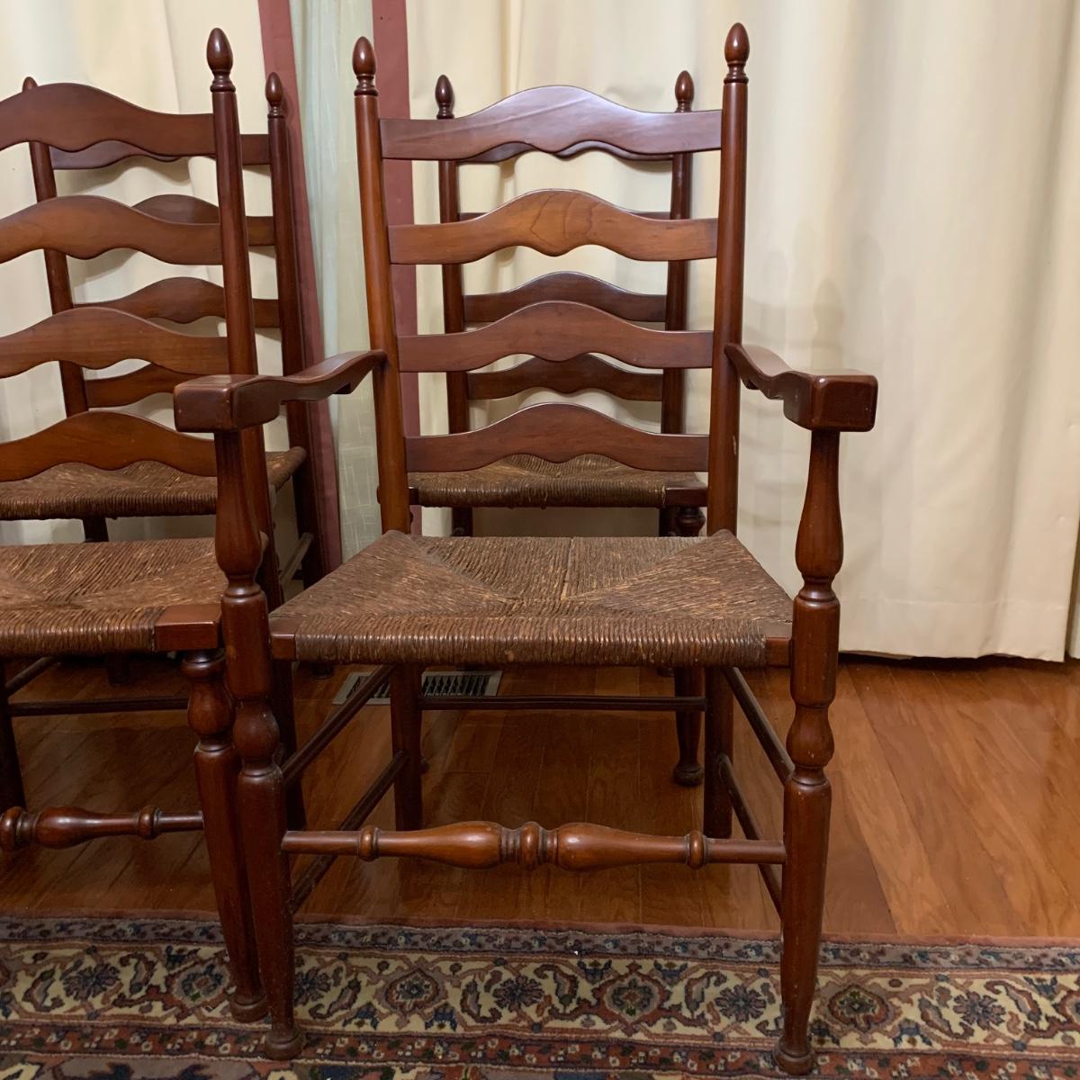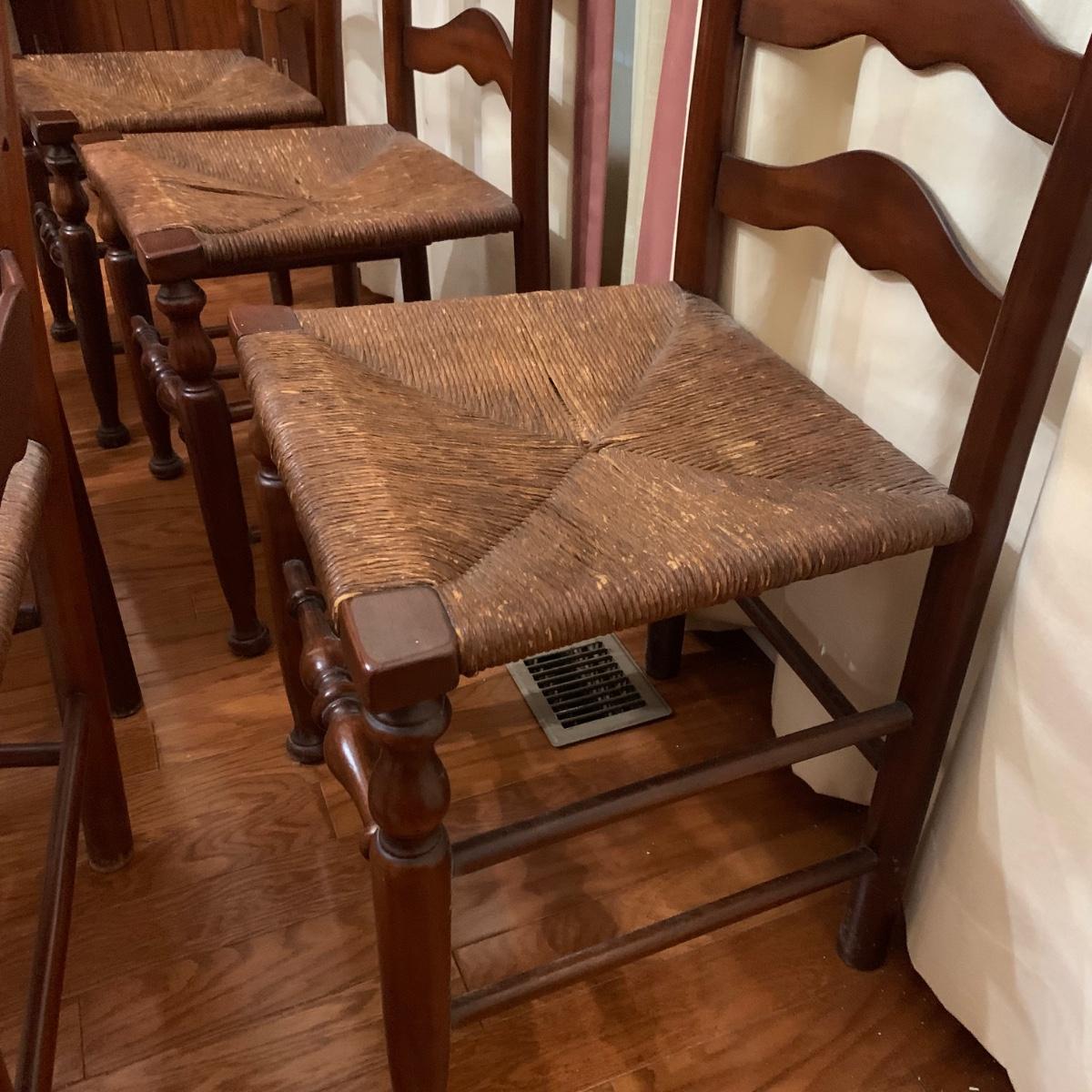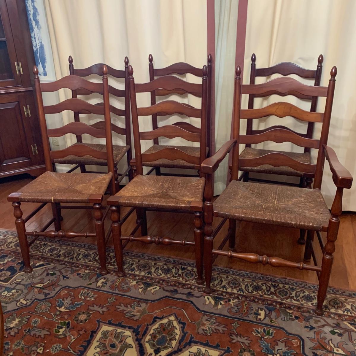 This is a set of six matching wooden chairs with ladder backs and rush woven seats. One of the six has armrests. The chairs all appear to be in good condition, though some light wear is seen on the woven seats and the chairs are a bit dusty. Chairs each measure 19” x 17” x 41” and have a seat height of 18”. The armchair is 23” x 20” x 41” also with a seat height of 18”.