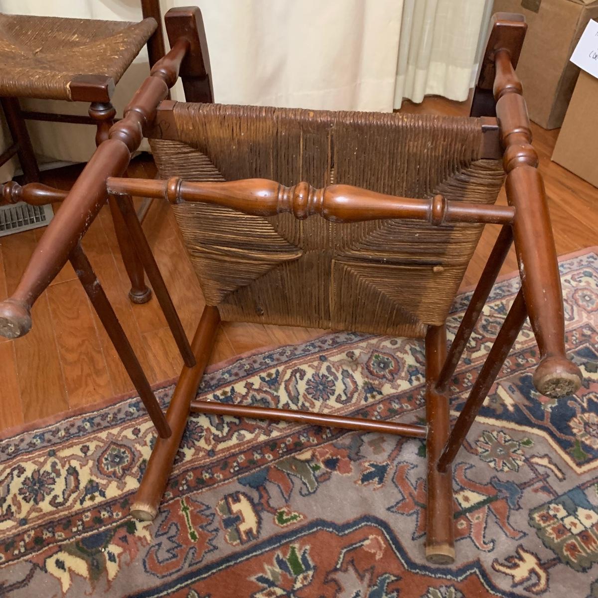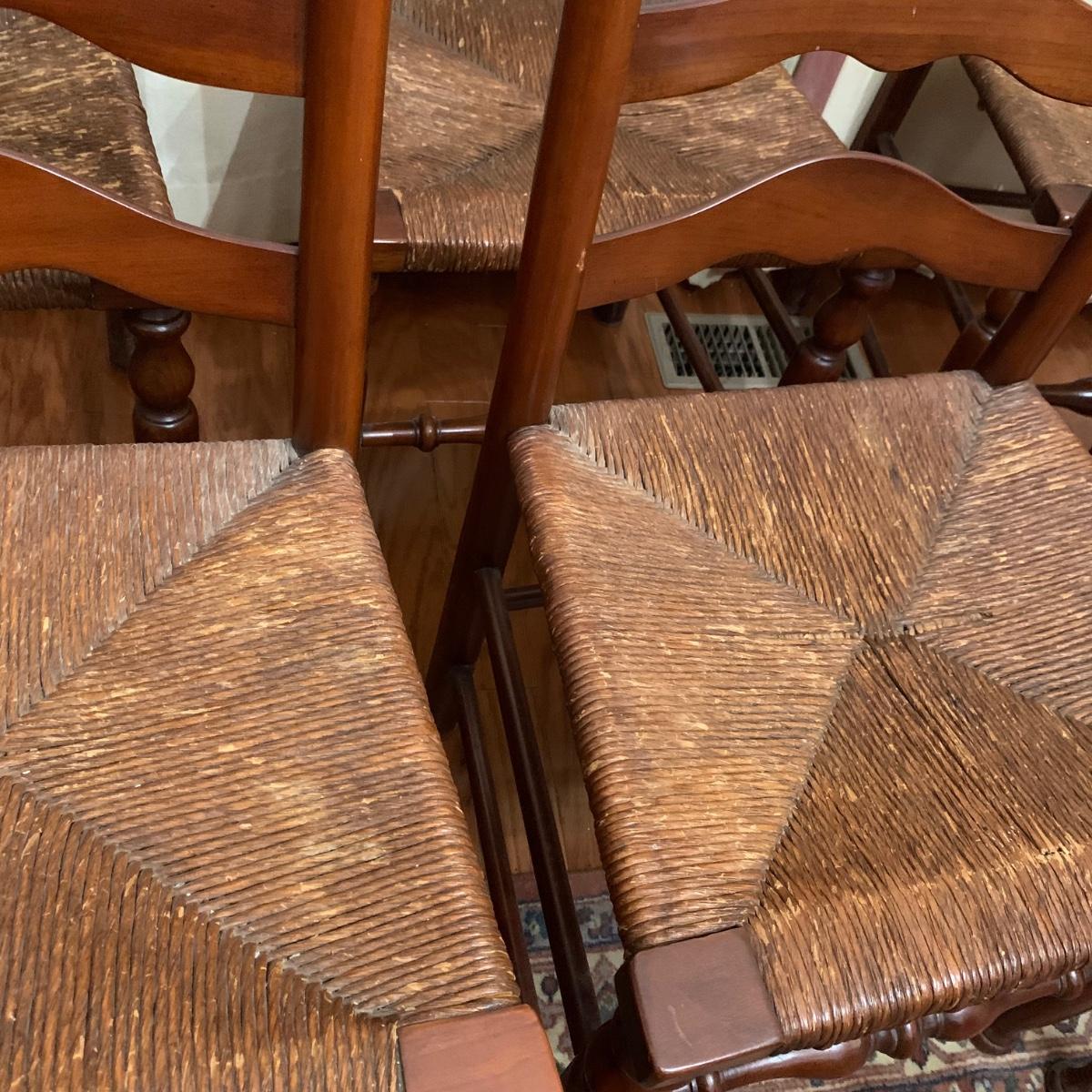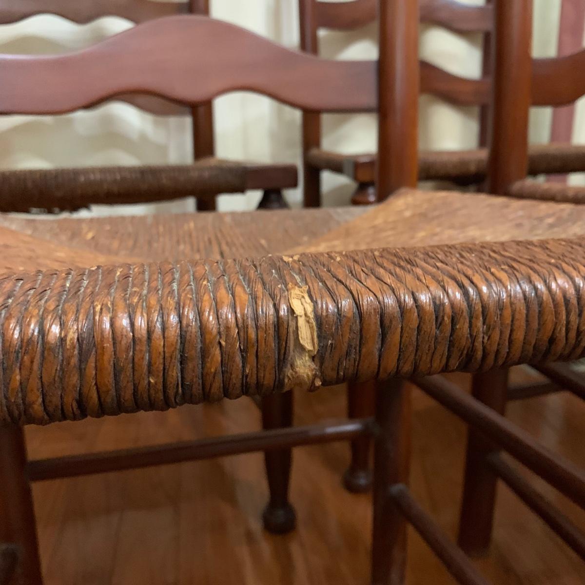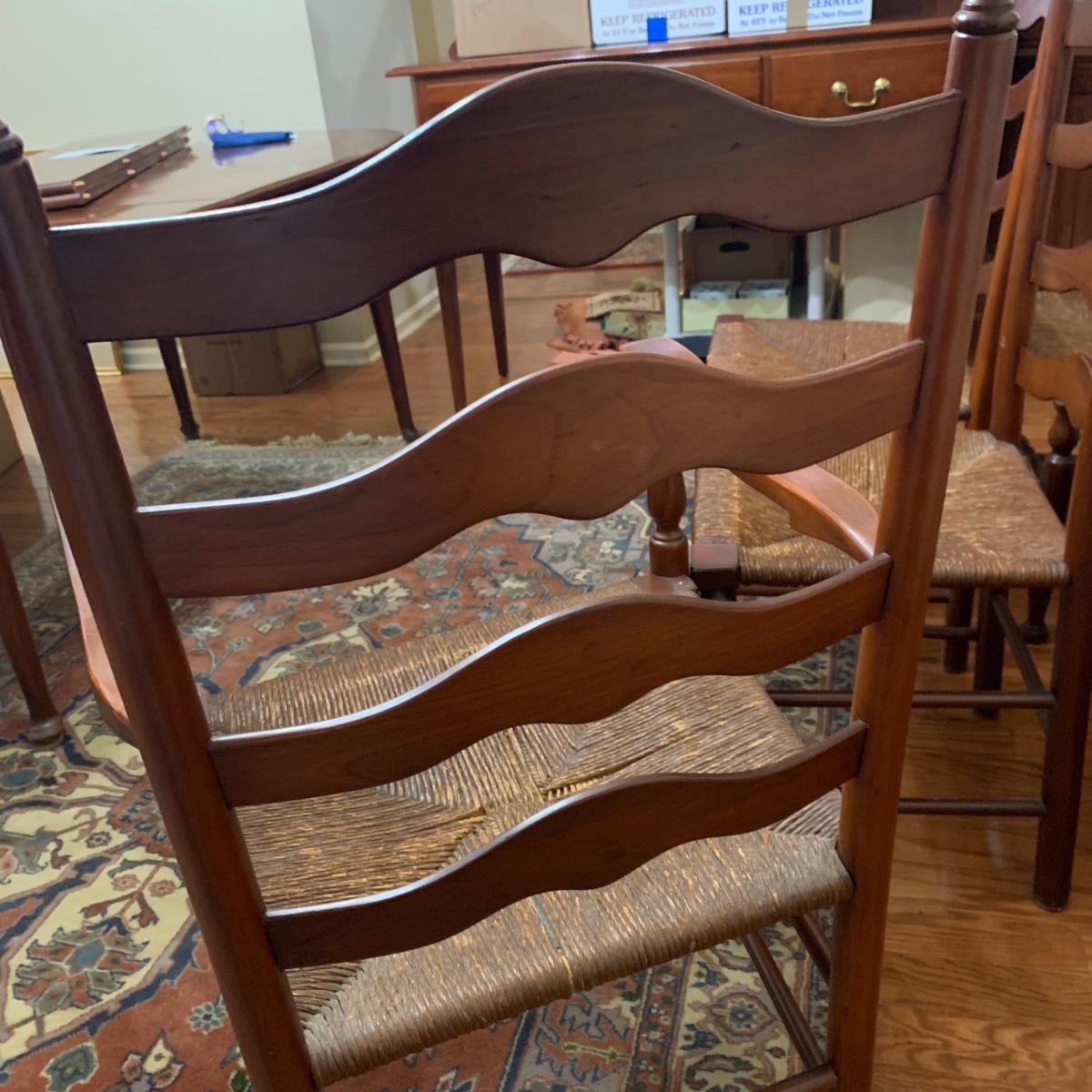 This is a set of six matching wooden chairs with ladder backs and rush woven seats. One of the six has armrests. The chairs all appear to be in good condition, though some light wear is seen on the woven seats and the chairs are a bit dusty. Chairs each measure 19” x 17” x 41” and have a seat height of 18”. The armchair is 23” x 20” x 41” also with a seat height of 18”.