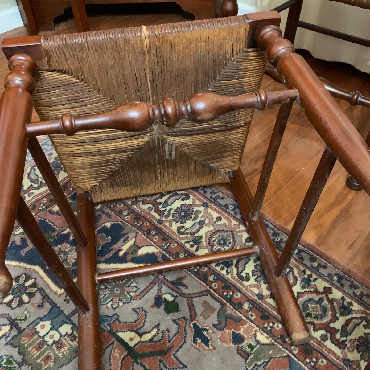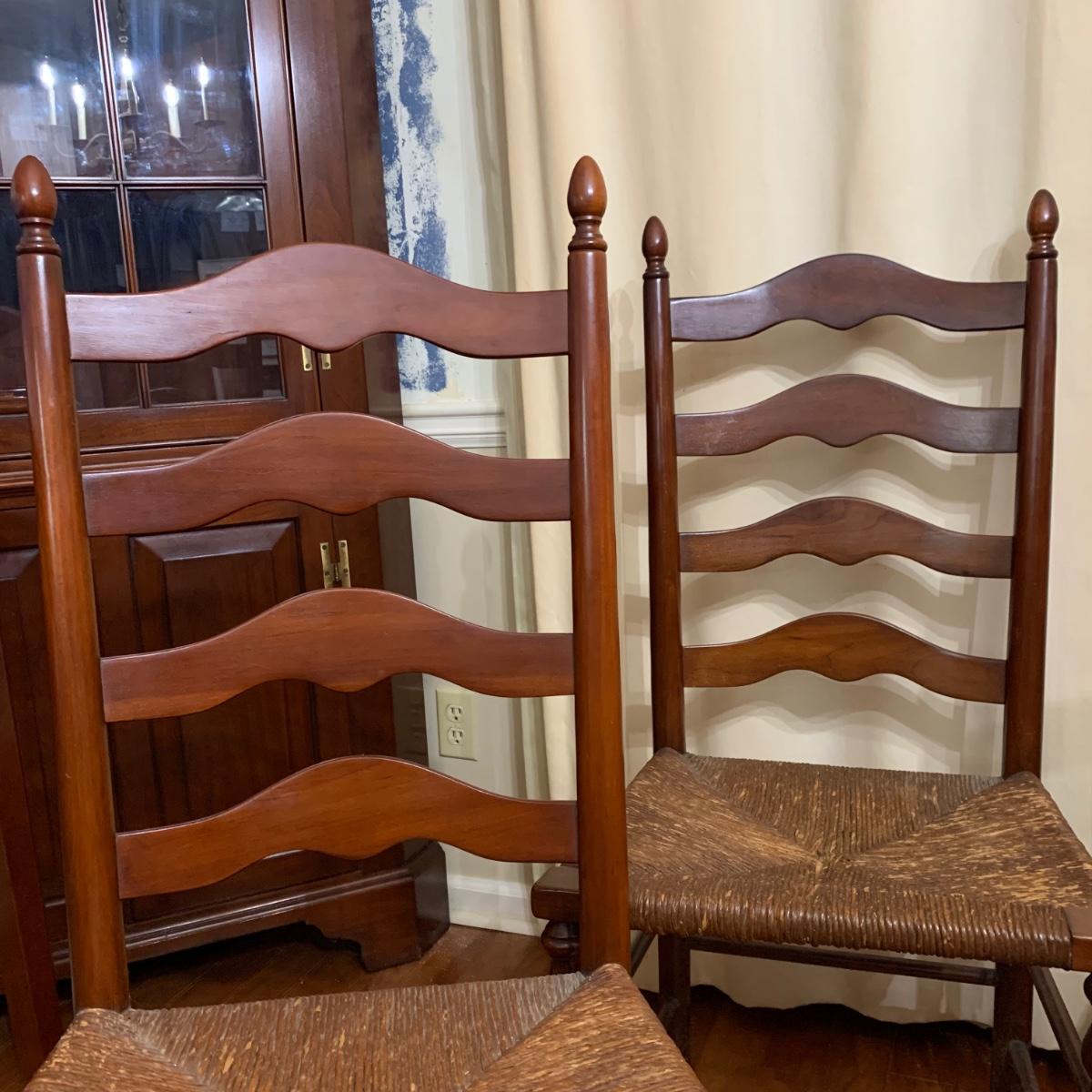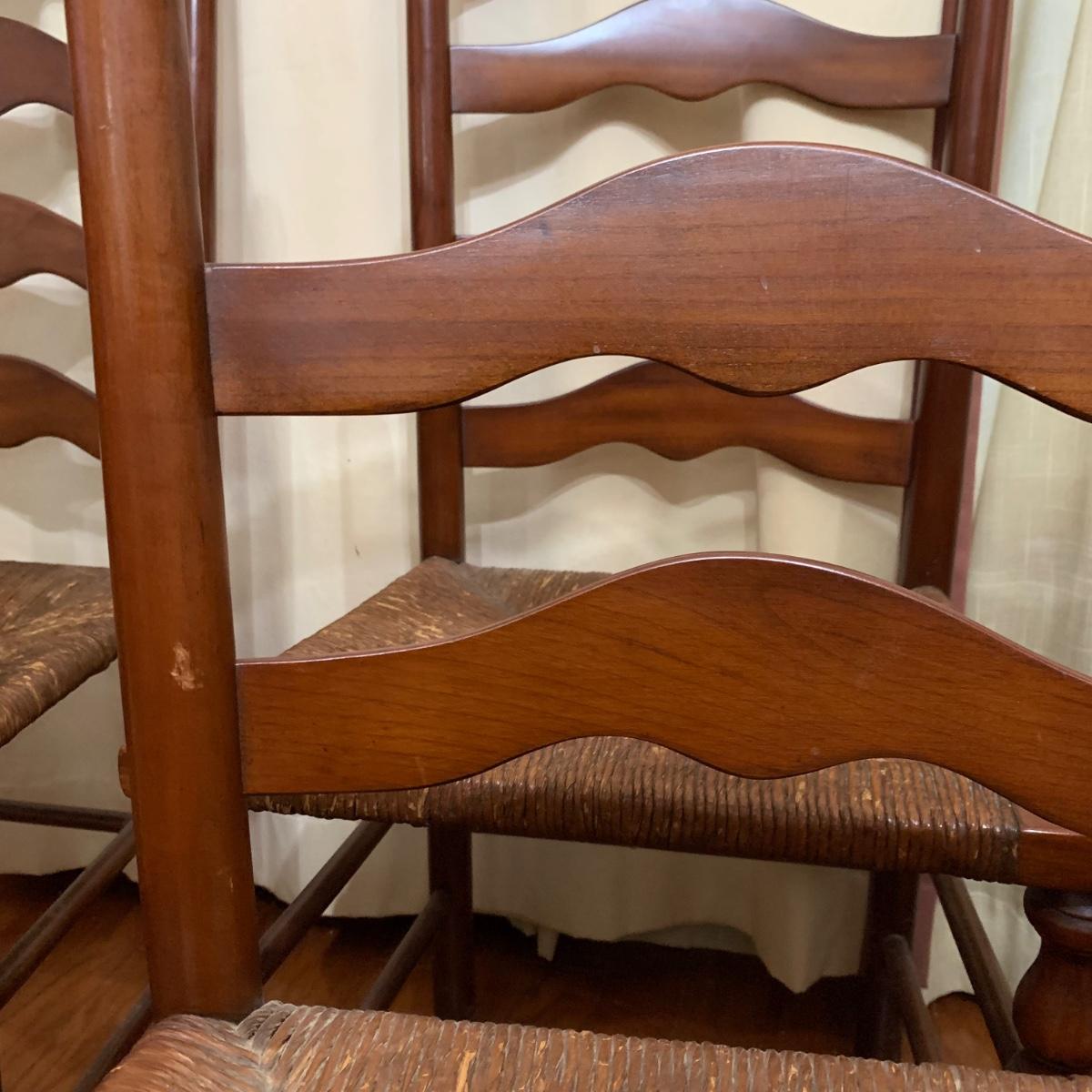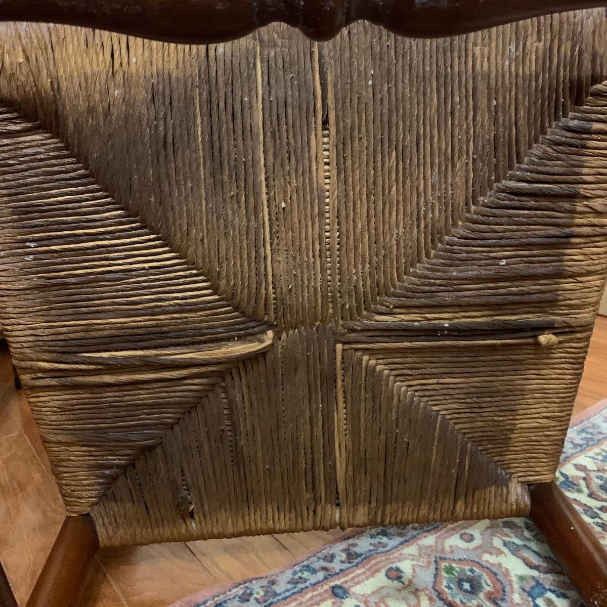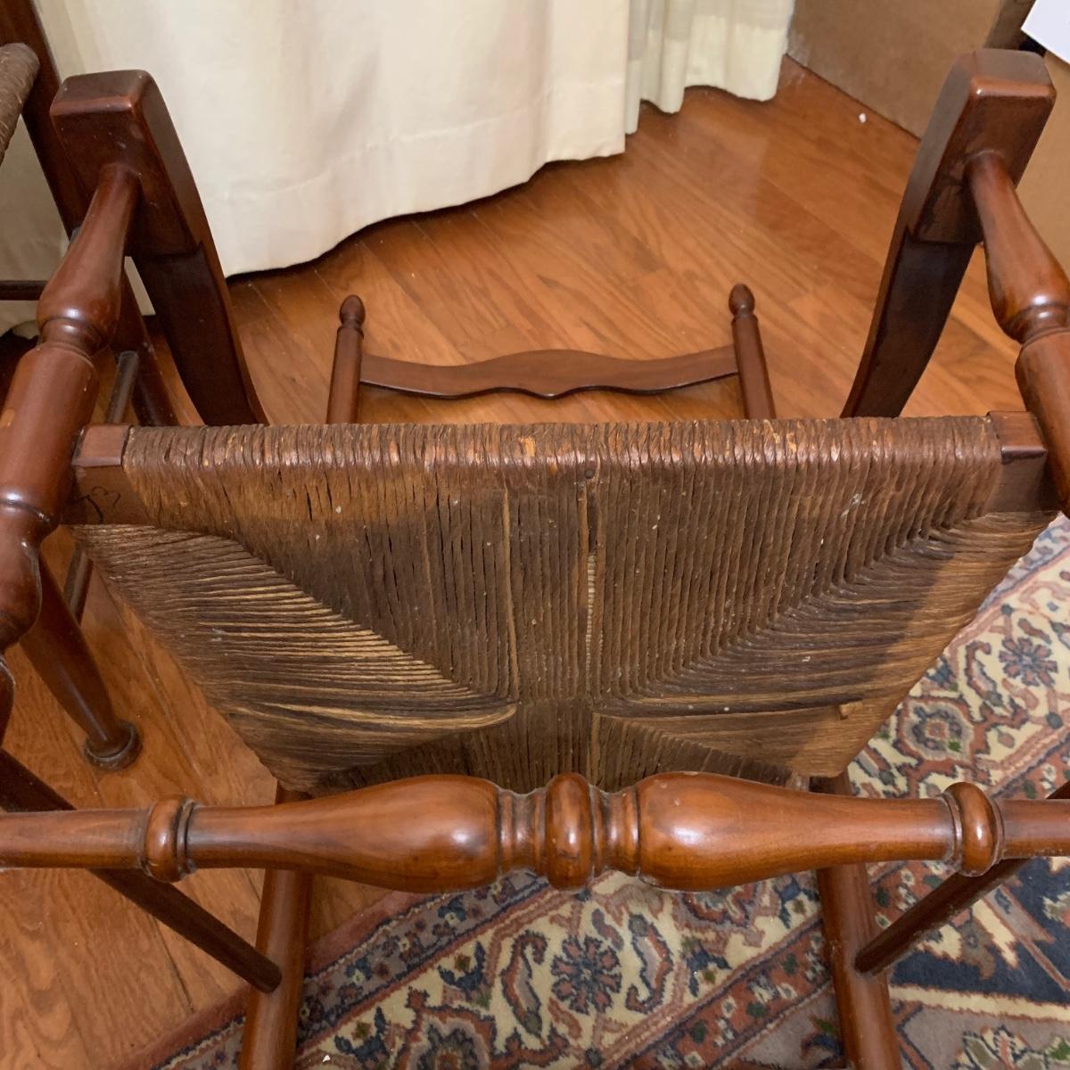This is a set of six matching wooden chairs with ladder backs and rush woven seats. One of the six has armrests. The chairs all appear to be in good condition, though some light wear is seen on the woven seats and the chairs are a bit dusty. Chairs each measure 19” x 17” x 41” and have a seat height of 18”. The armchair is 23” x 20” x 41” also with a seat height of 18”.