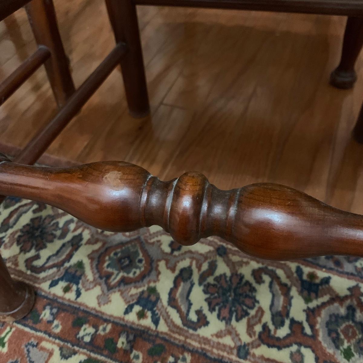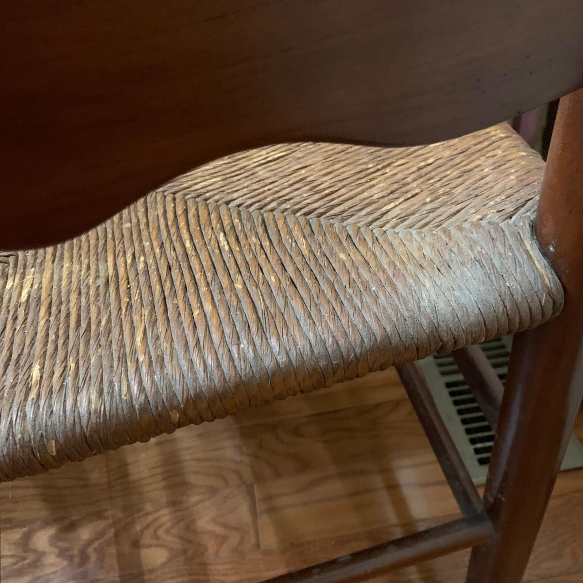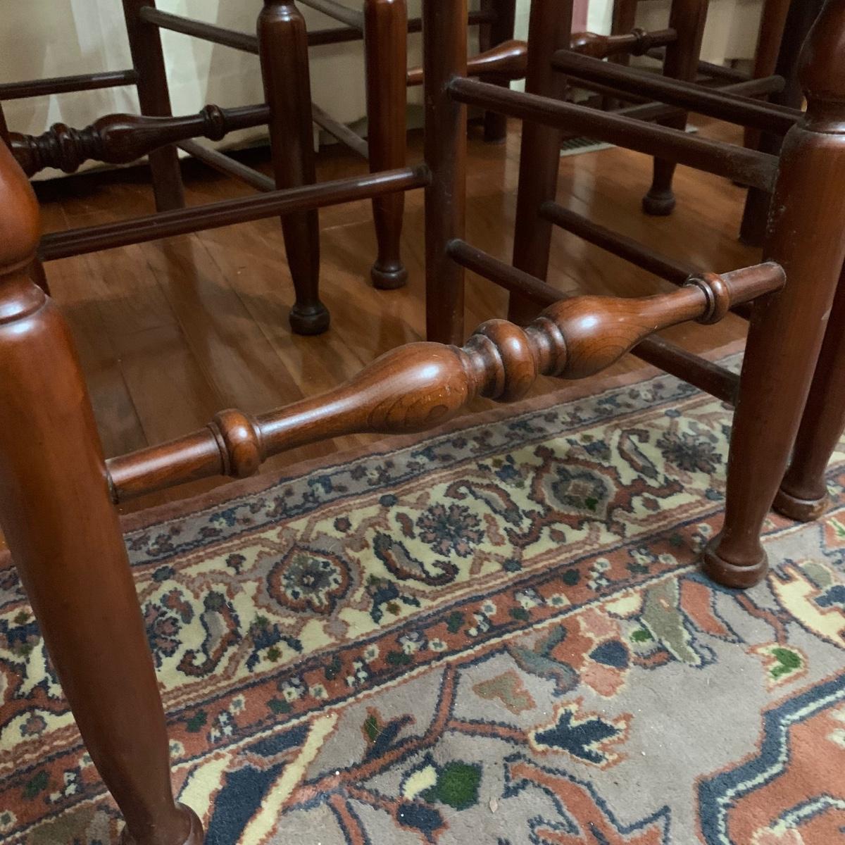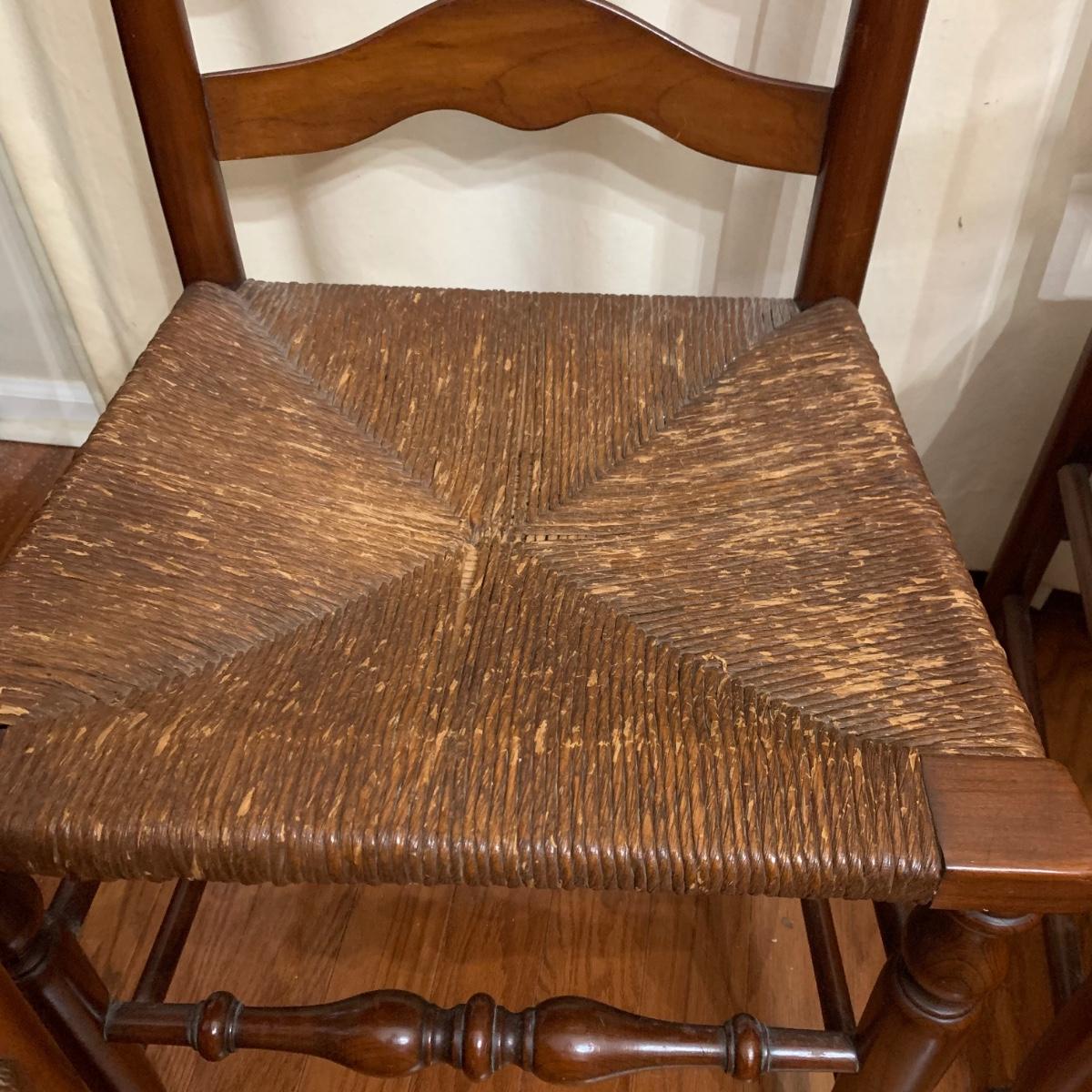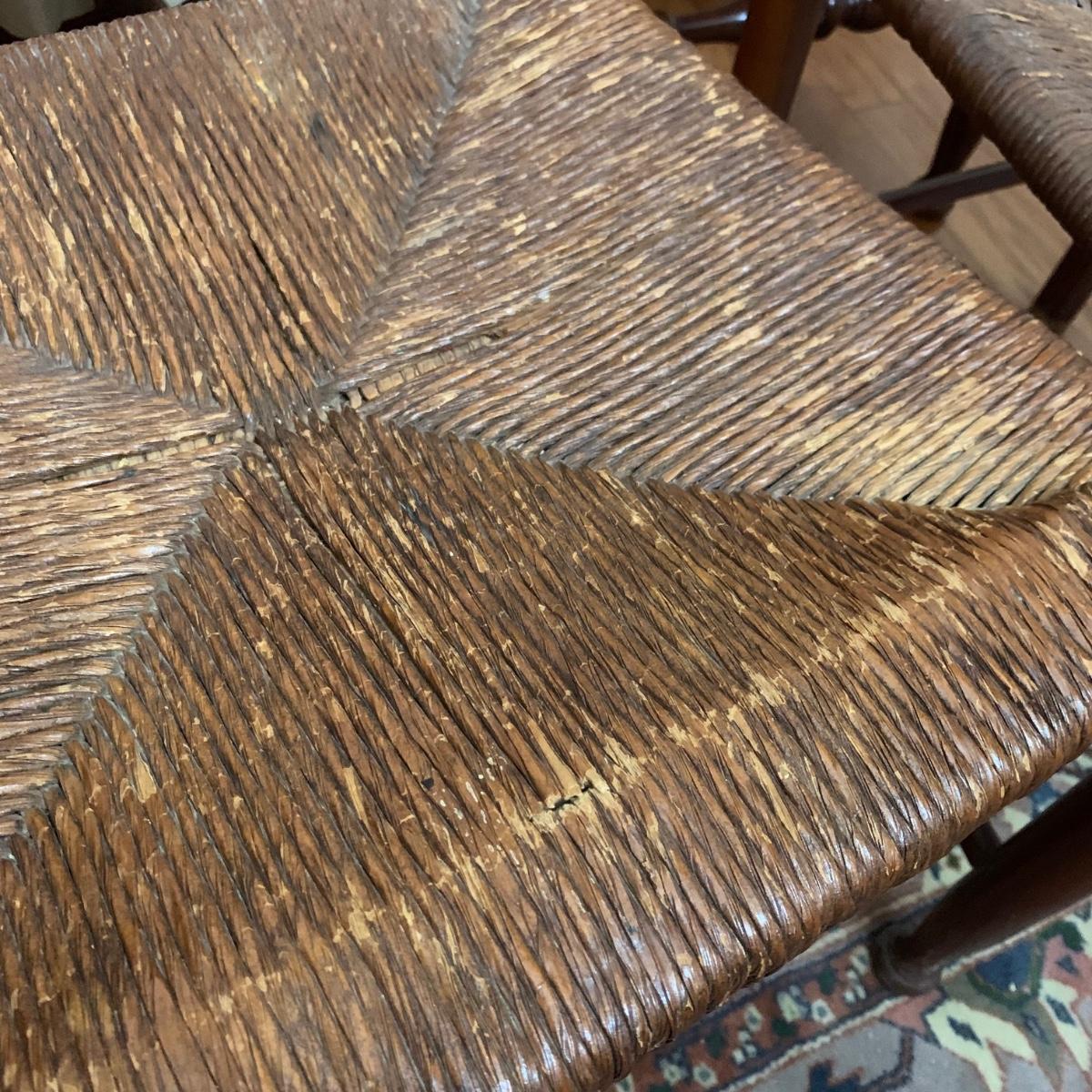 This is a set of six matching wooden chairs with ladder backs and rush woven seats. One of the six has armrests. The chairs all appear to be in good condition, though some light wear is seen on the woven seats and the chairs are a bit dusty. Chairs each measure 19” x 17” x 41” and have a seat height of 18”. The armchair is 23” x 20” x 41” also with a seat height of 18”.