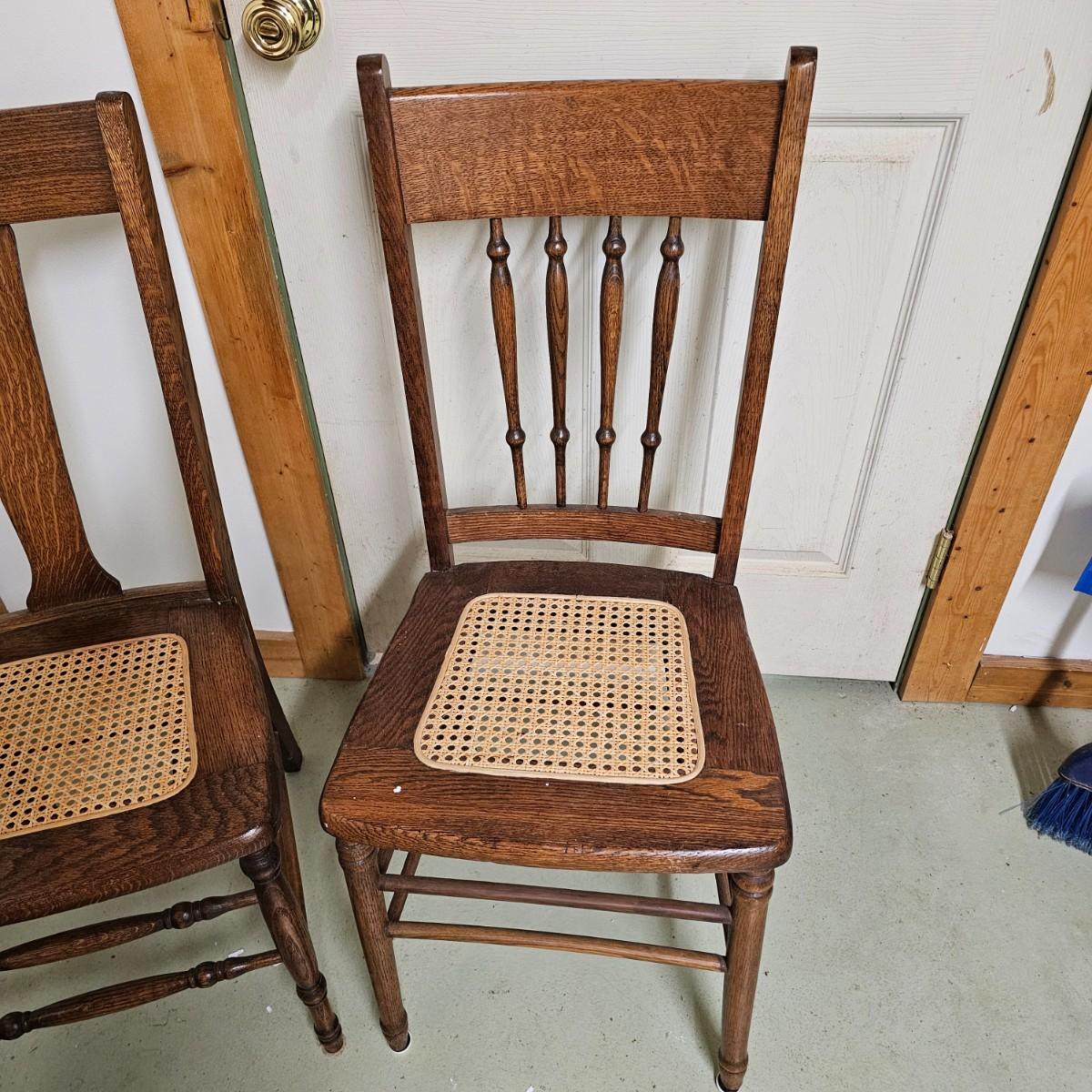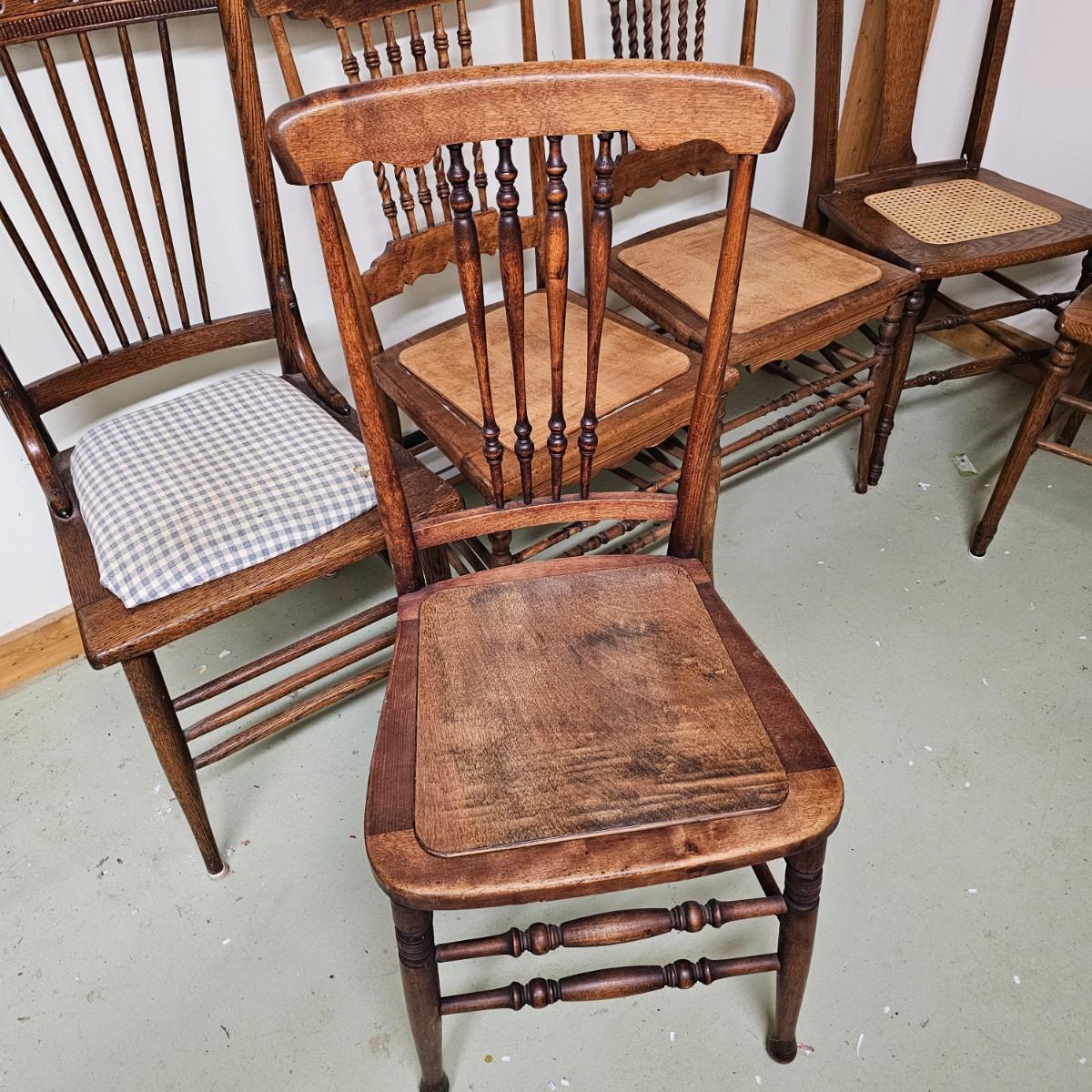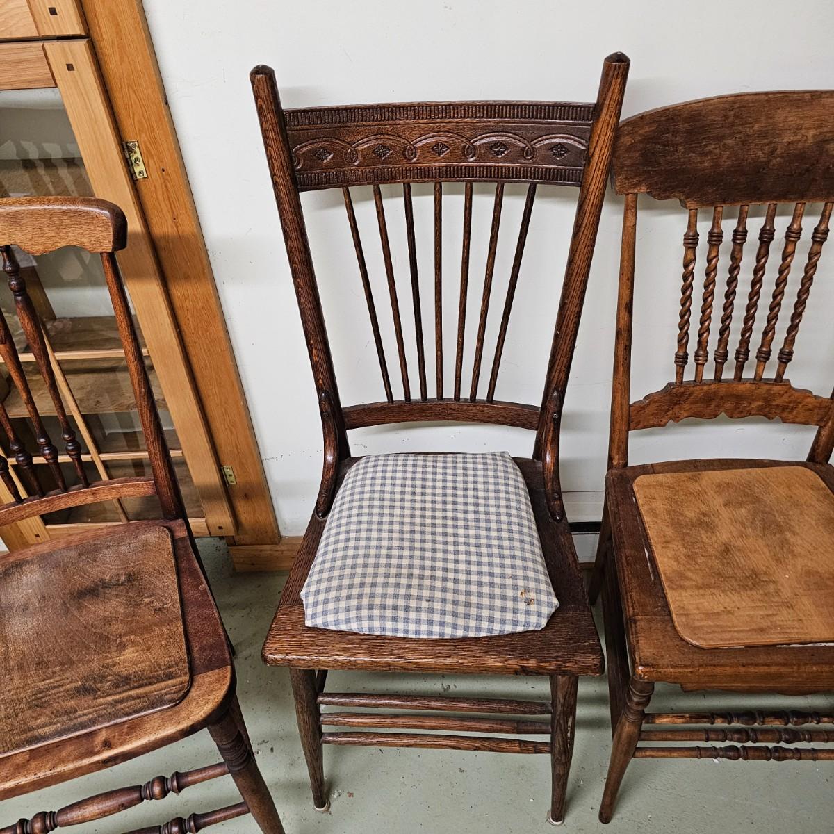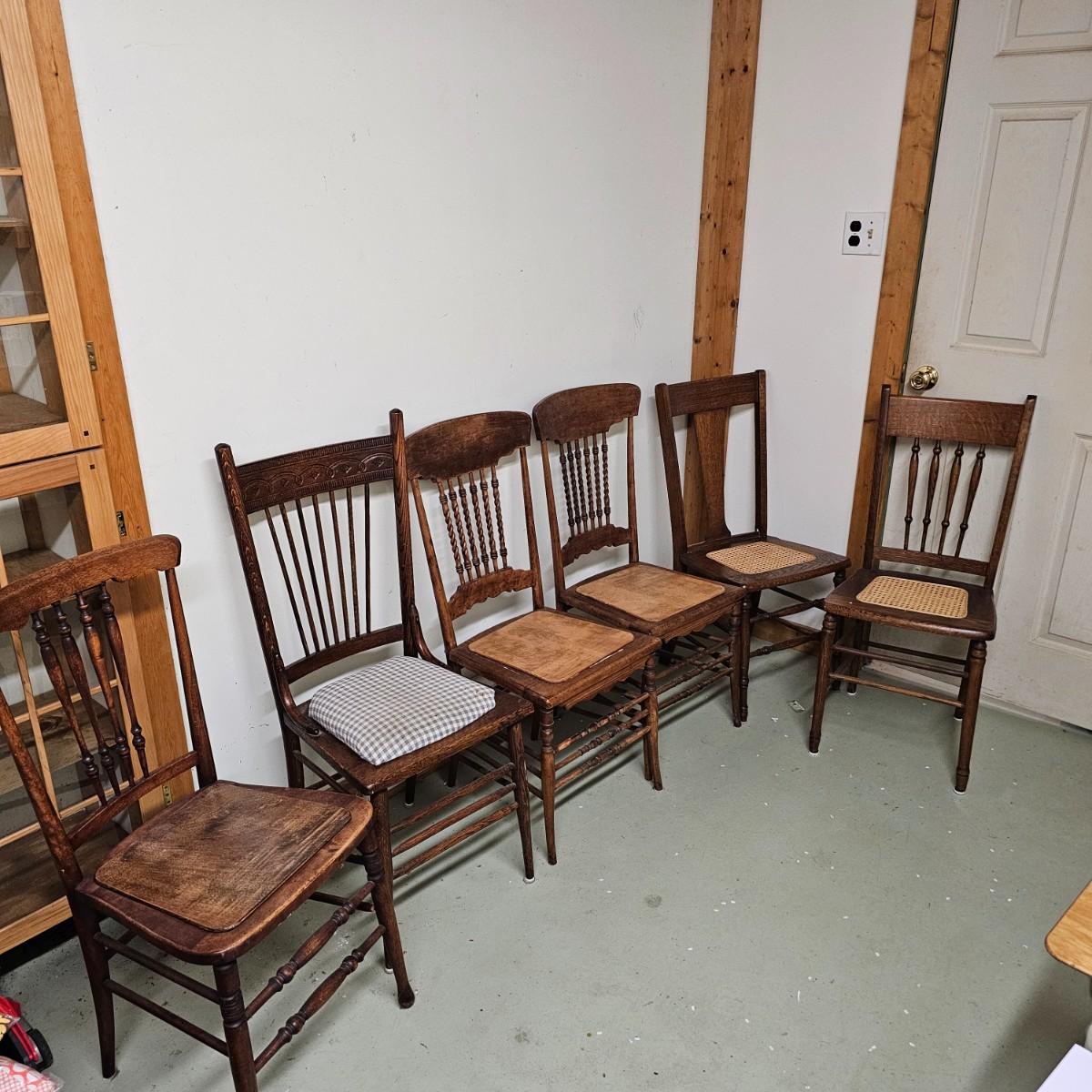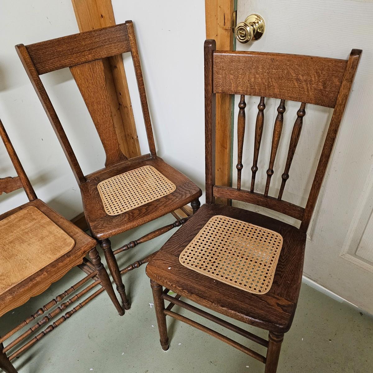 Six unique spindle/slat back oak chairs, some with woven seats. Two chairs are matching, the others are all individual. Wooden seat tops have been laid over woven seats that are broken or weak. Chairs measure between 16"-17"W x 17"D x 36"-40" H, with an average seat height of 17". Feet have padded adhesive pieces to save flooring. See photos for details. Local pickup only.