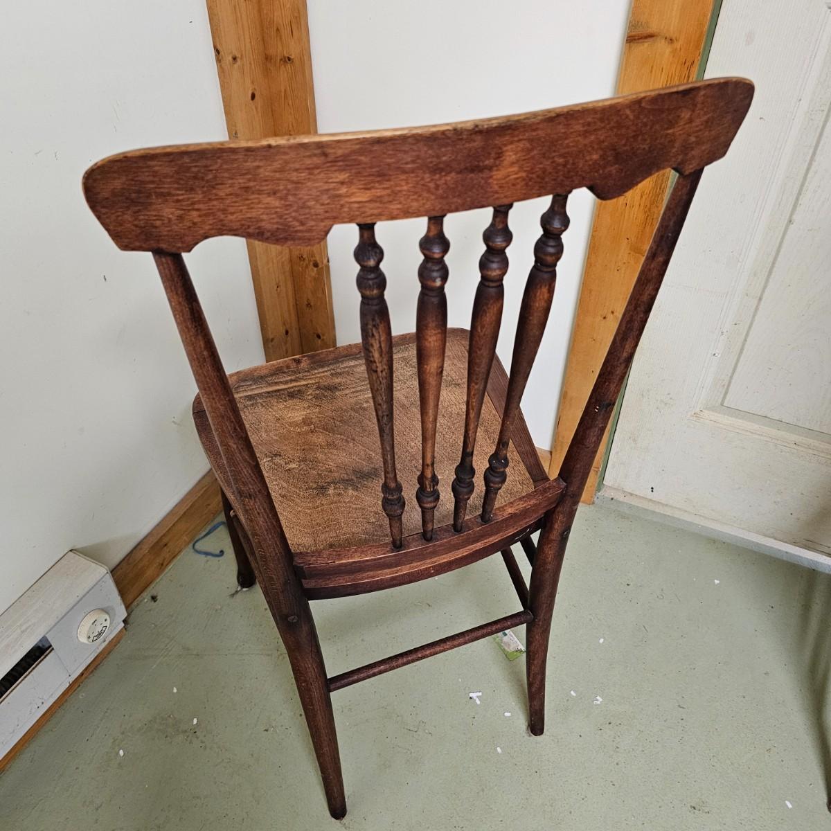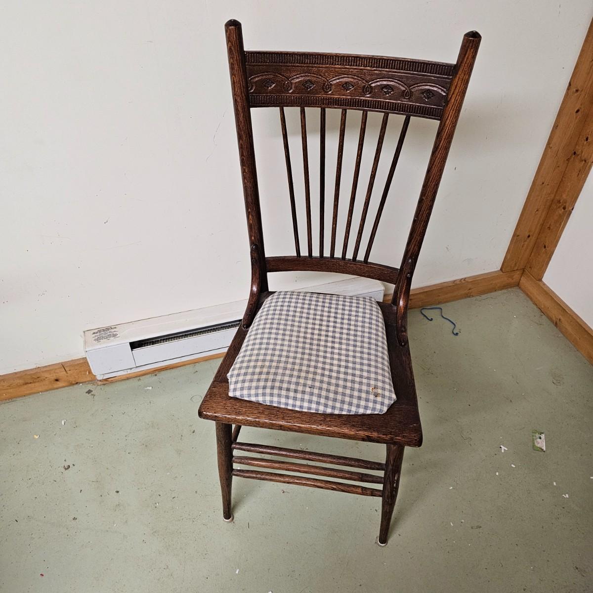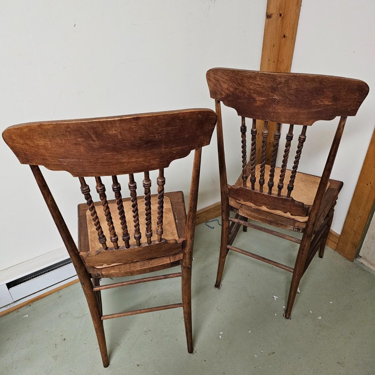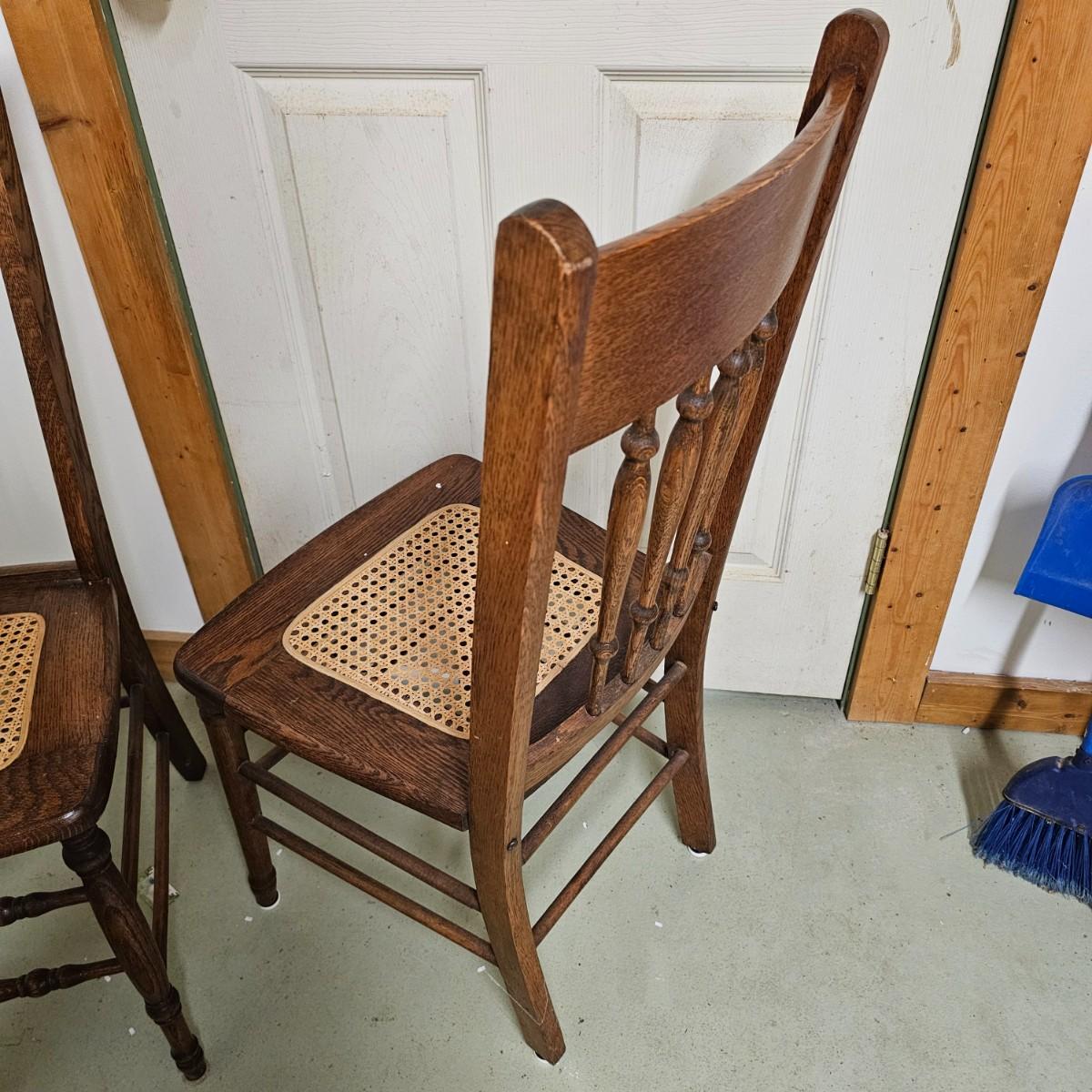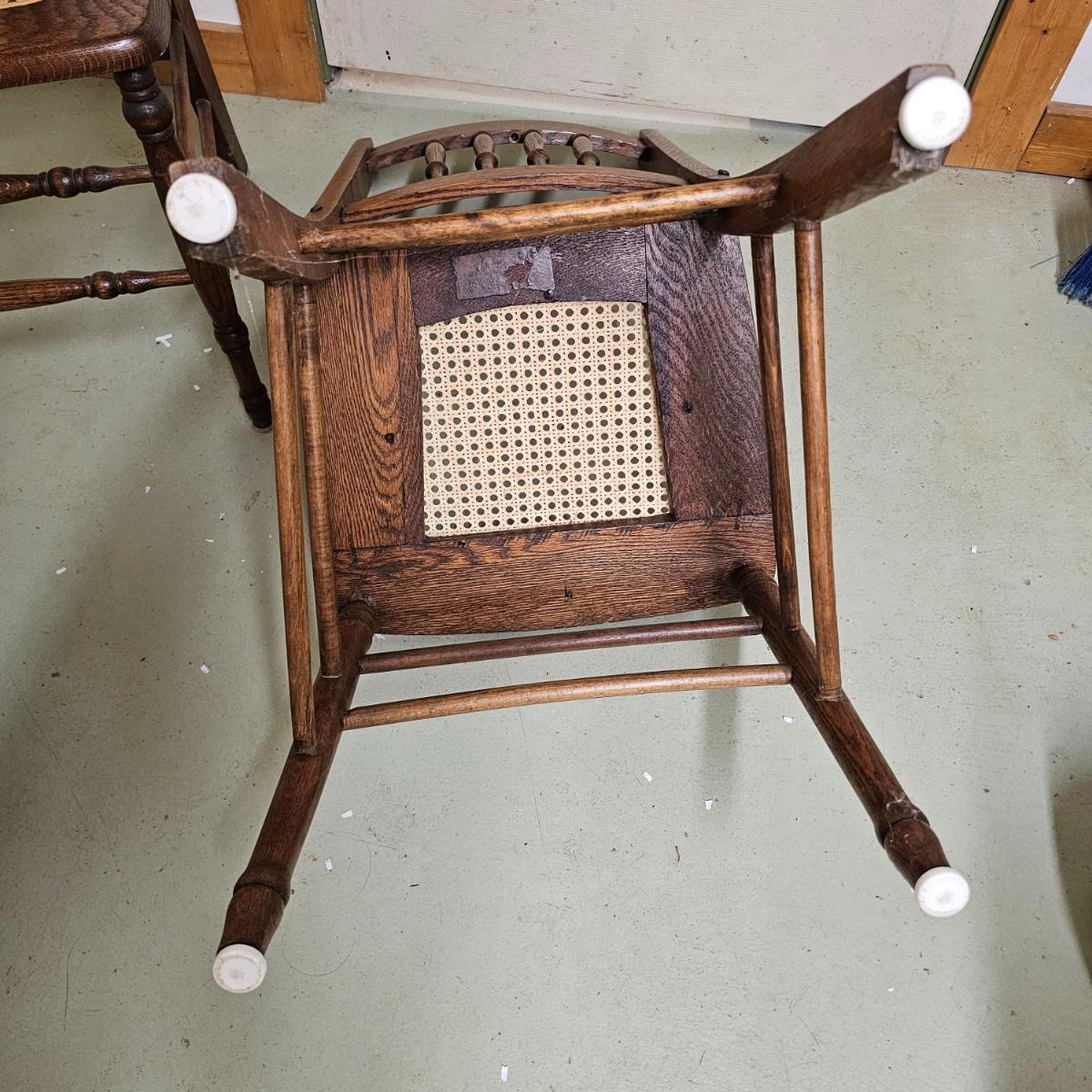 Six unique spindle/slat back oak chairs, some with woven seats. Two chairs are matching, the others are all individual. Wooden seat tops have been laid over woven seats that are broken or weak. Chairs measure between 16"-17"W x 17"D x 36"-40" H, with an average seat height of 17". Feet have padded adhesive pieces to save flooring. See photos for details. Local pickup only.