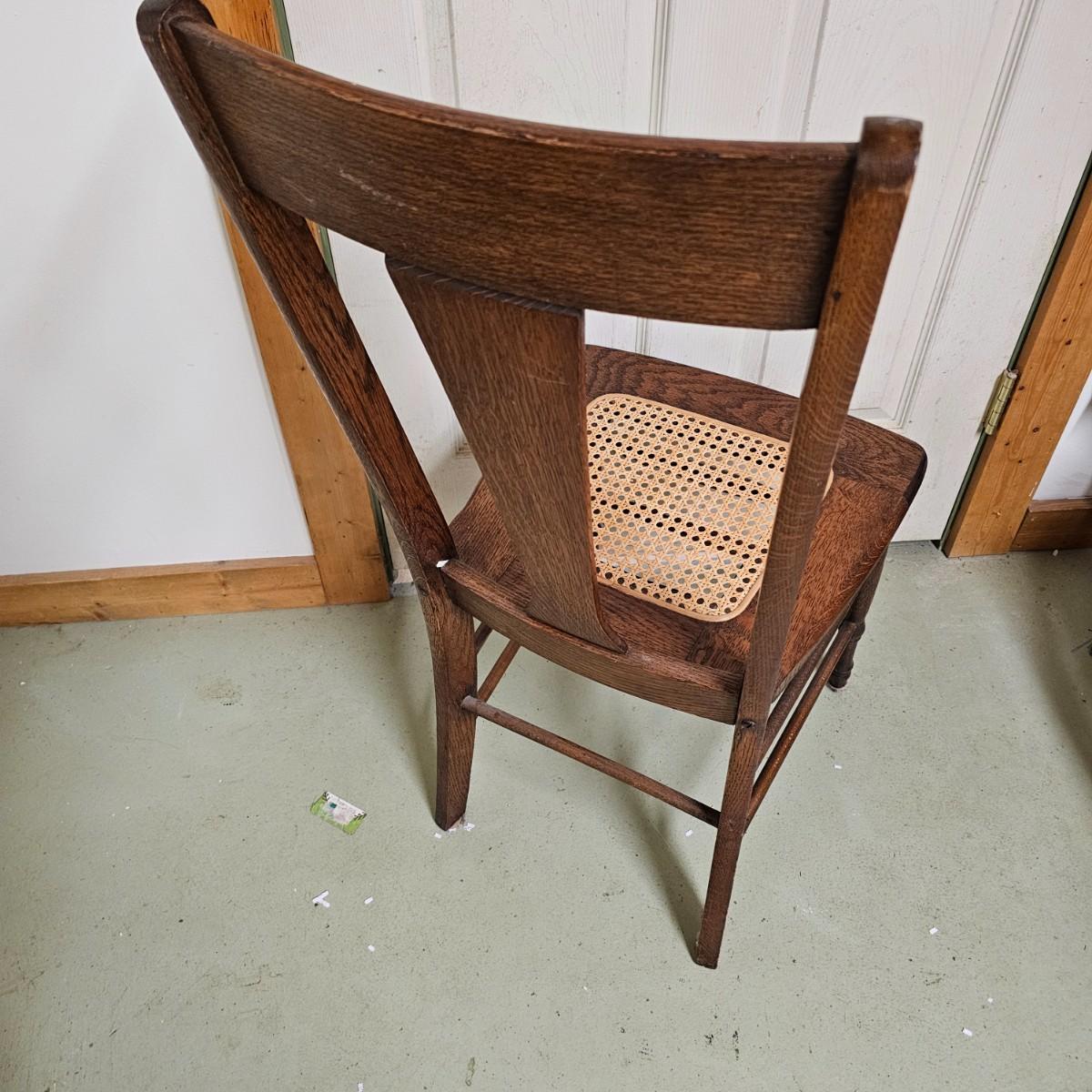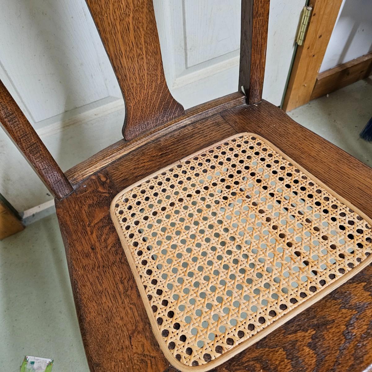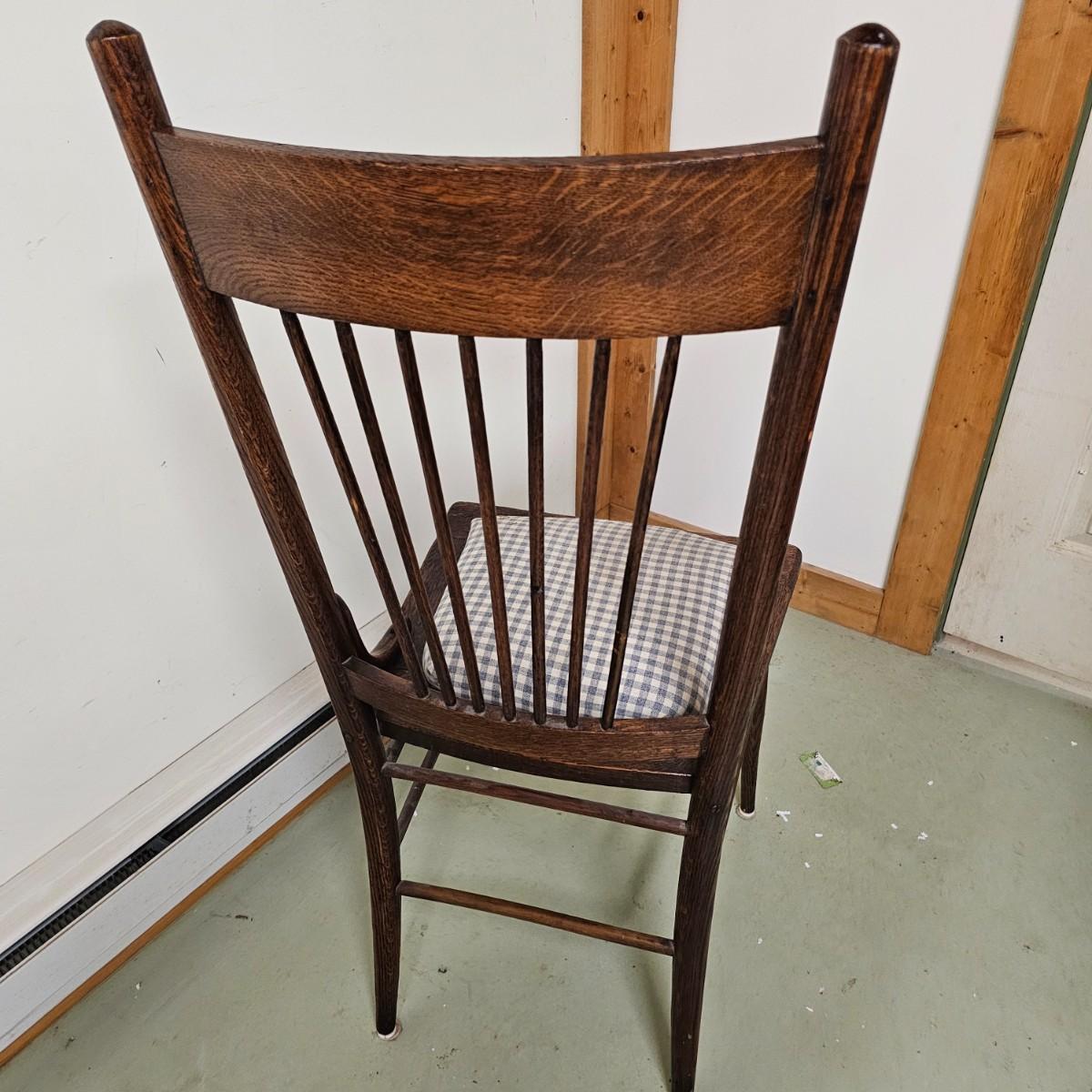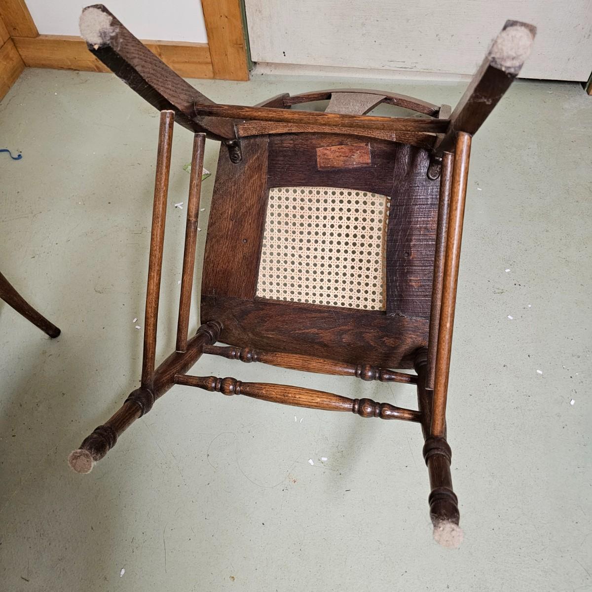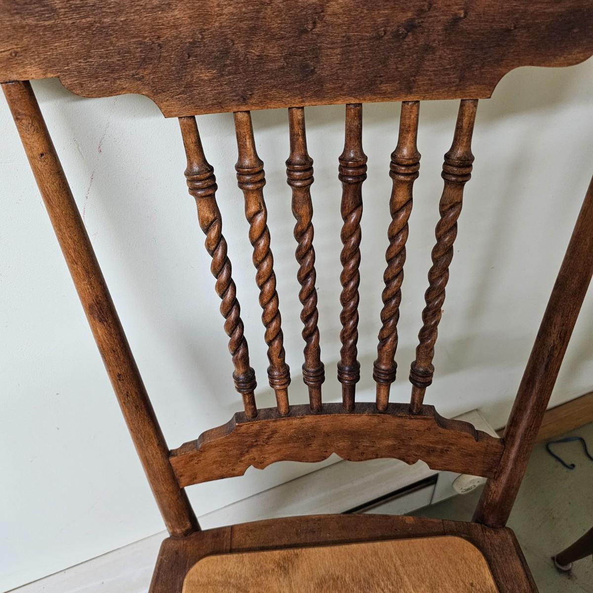Six unique spindle/slat back oak chairs, some with woven seats. Two chairs are matching, the others are all individual. Wooden seat tops have been laid over woven seats that are broken or weak. Chairs measure between 16"-17"W x 17"D x 36"-40" H, with an average seat height of 17". Feet have padded adhesive pieces to save flooring. See photos for details. Local pickup only.