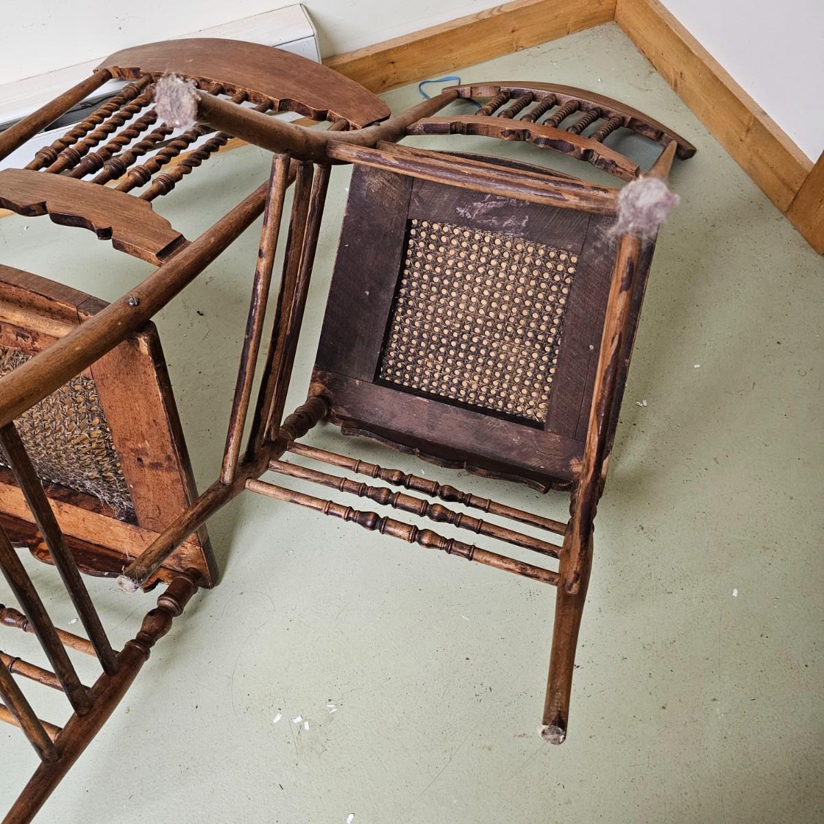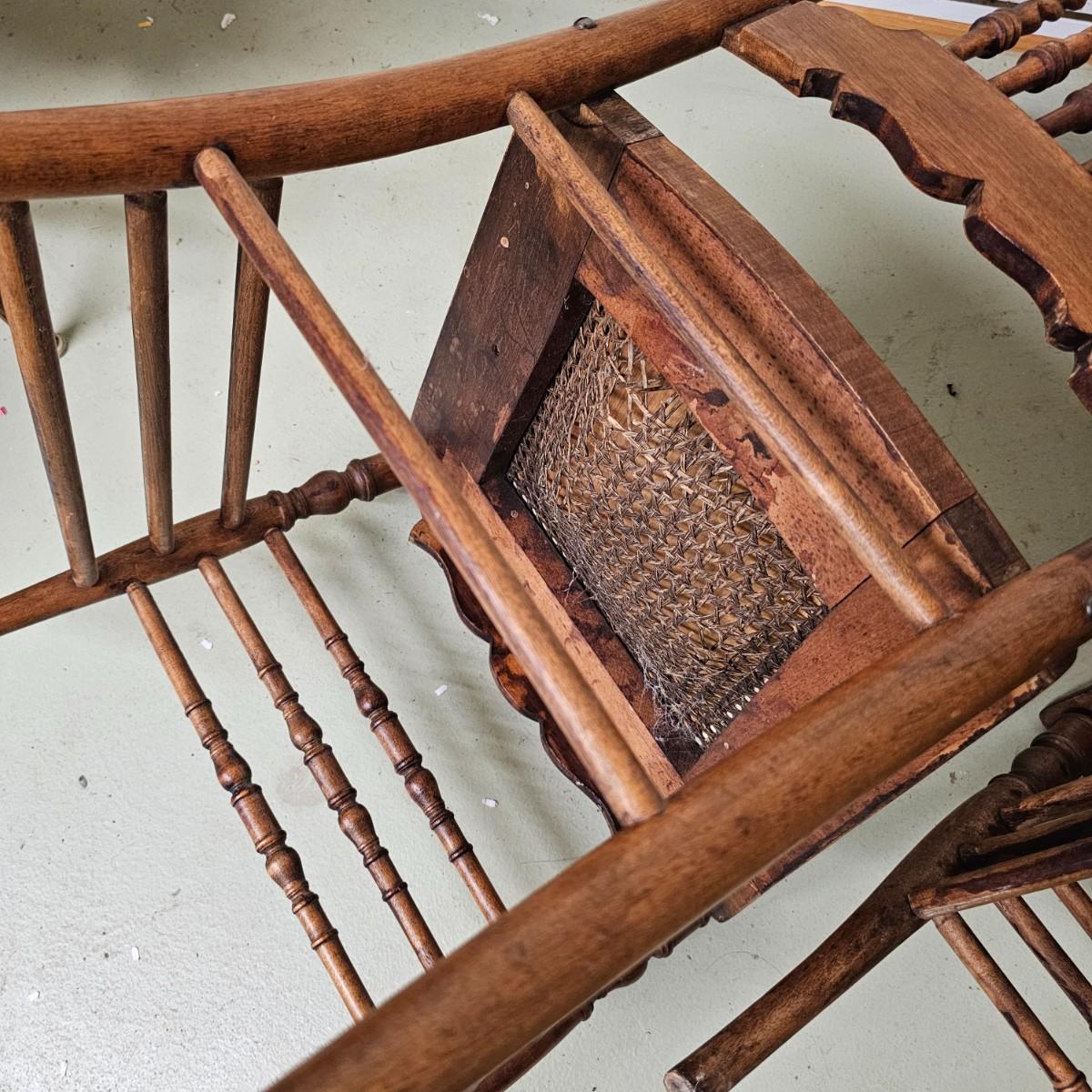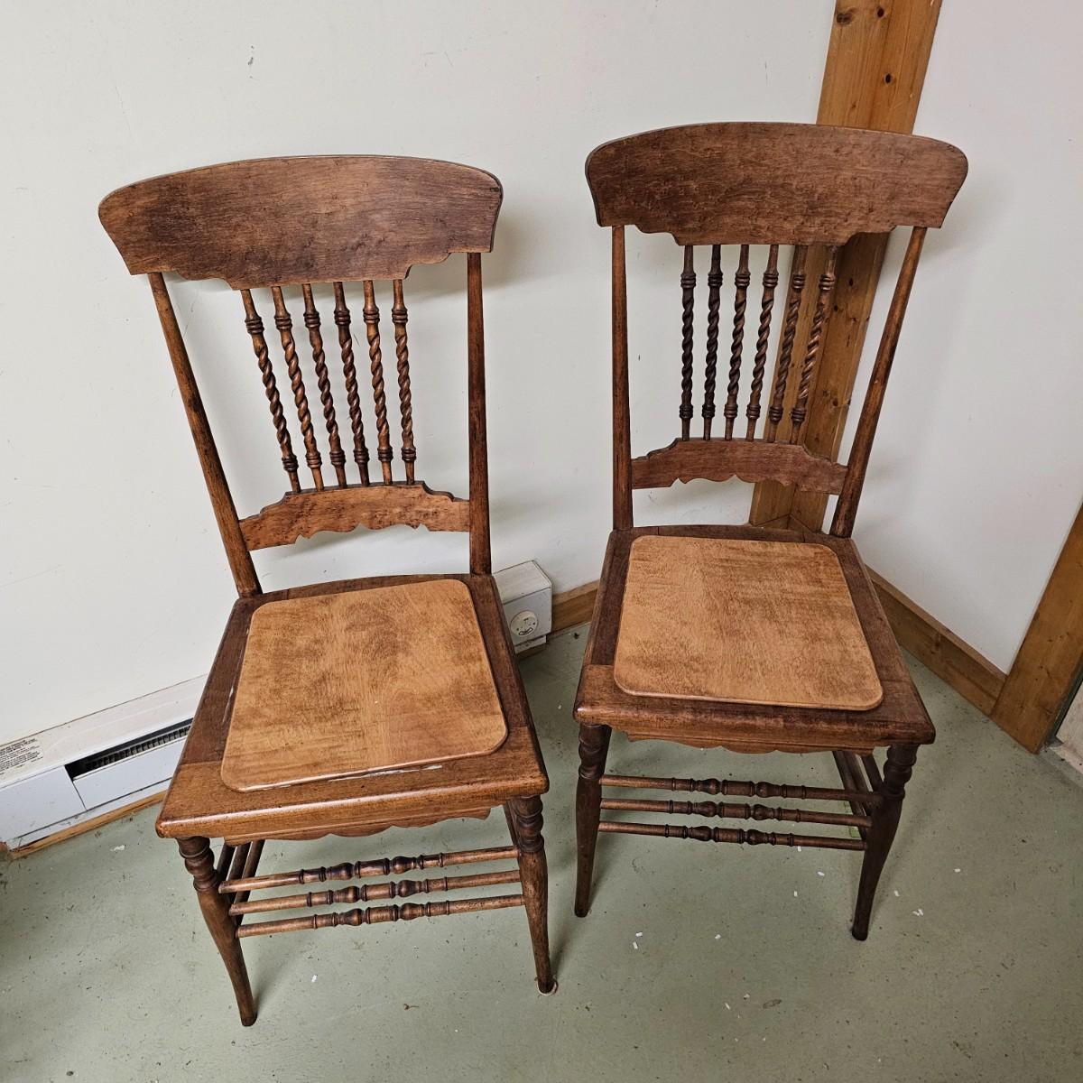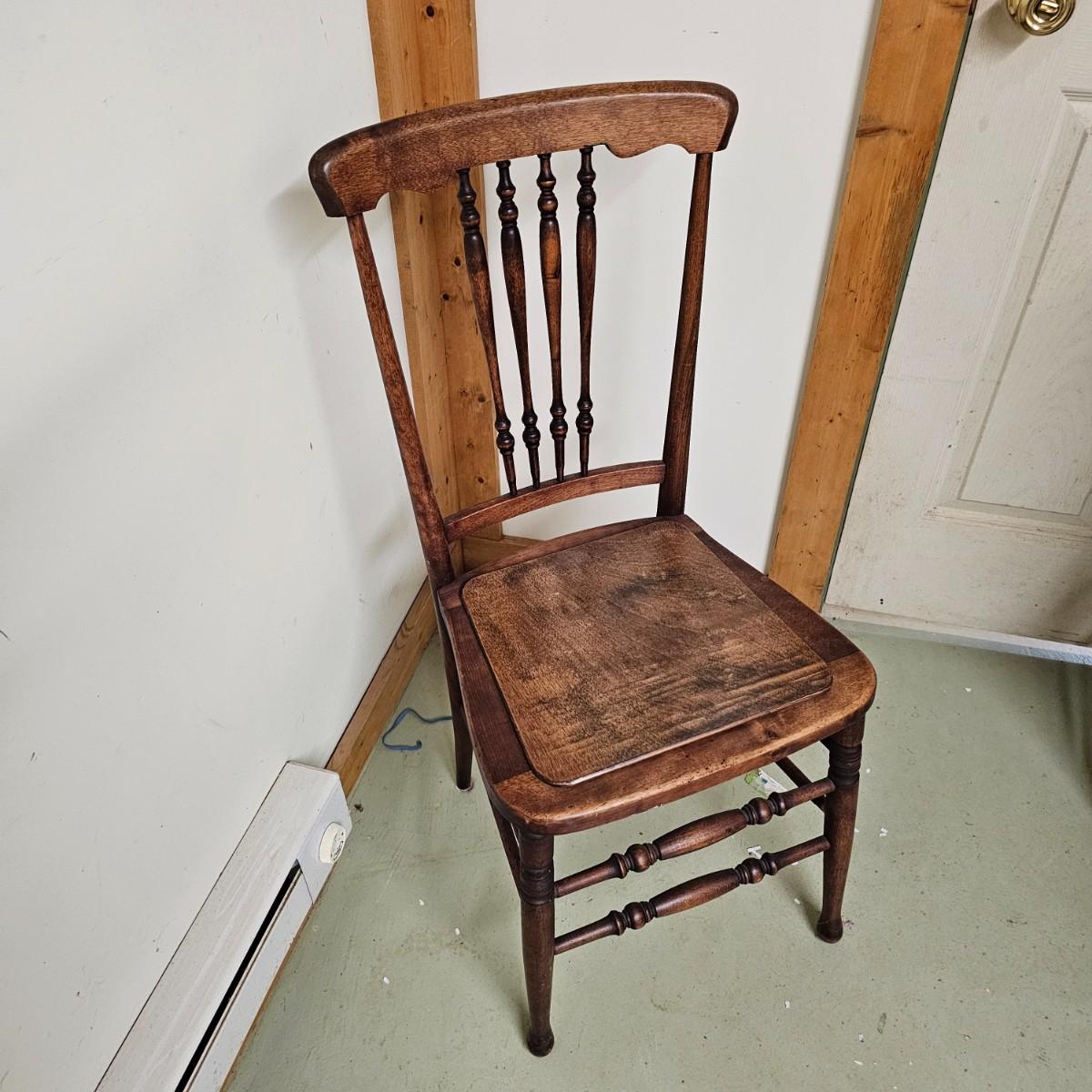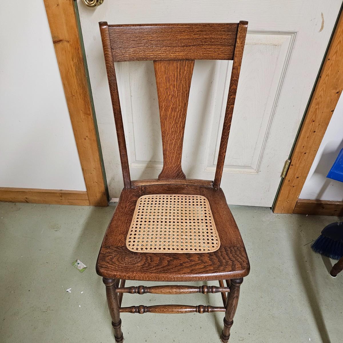 Six unique spindle/slat back oak chairs, some with woven seats. Two chairs are matching, the others are all individual. Wooden seat tops have been laid over woven seats that are broken or weak. Chairs measure between 16"-17"W x 17"D x 36"-40" H, with an average seat height of 17". Feet have padded adhesive pieces to save flooring. See photos for details. Local pickup only.
