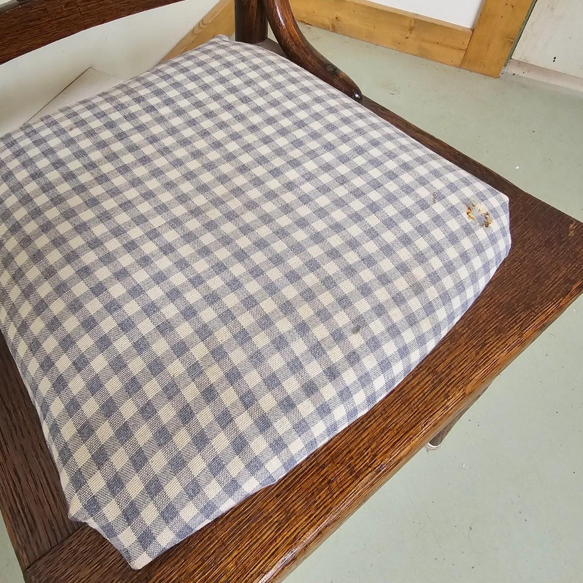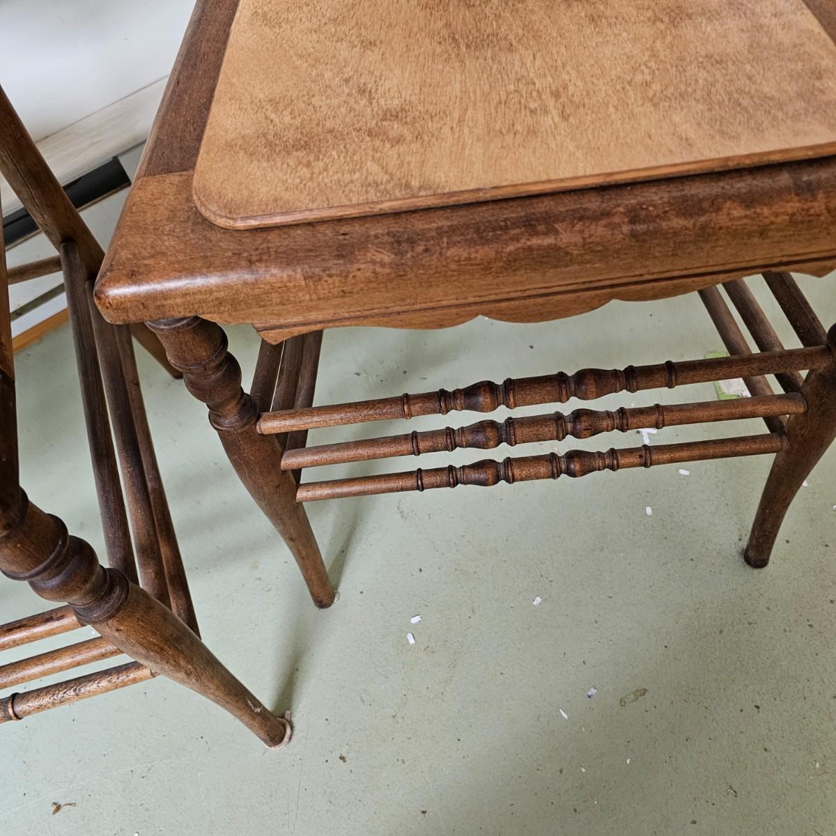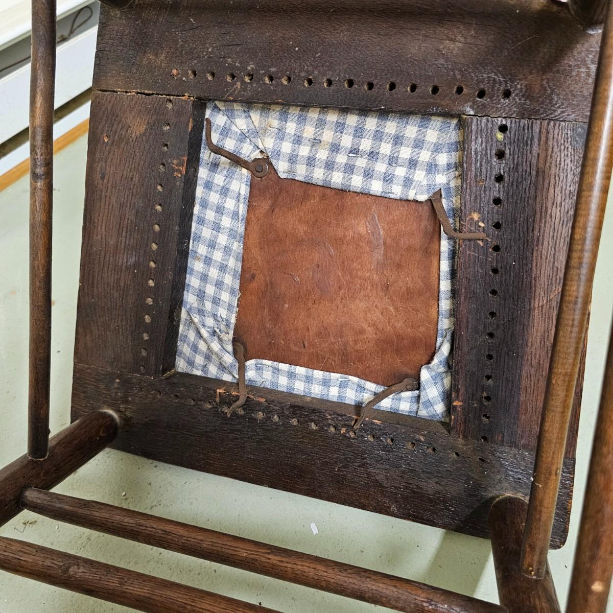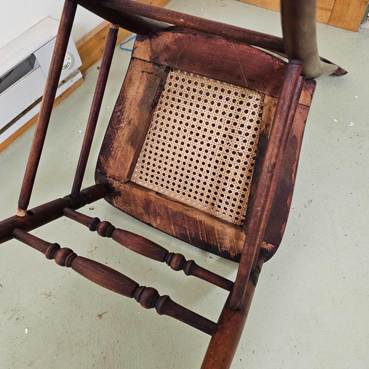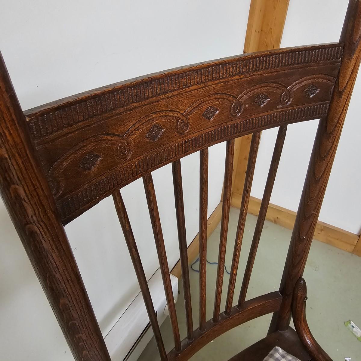 Six unique spindle/slat back oak chairs, some with woven seats. Two chairs are matching, the others are all individual. Wooden seat tops have been laid over woven seats that are broken or weak. Chairs measure between 16"-17"W x 17"D x 36"-40" H, with an average seat height of 17". Feet have padded adhesive pieces to save flooring. See photos for details. Local pickup only.