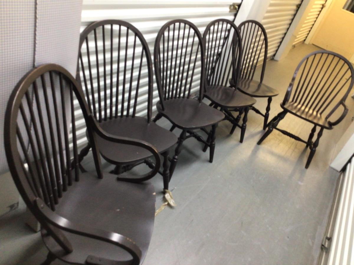 Includes two arm chairs and four side chairs. Some scuffs and scratches to paint. Measures 21”w x 17”d x 37”h. This is a heavy item. You must bring help to move this item into your vehicle. Local delivery may be able available at cost to the buyer. If you need an item to be delivered then please coordinate with us once you have purchased the item.