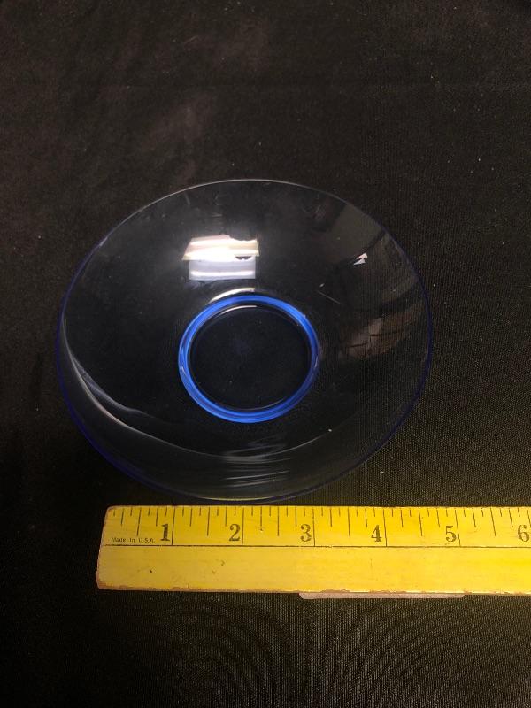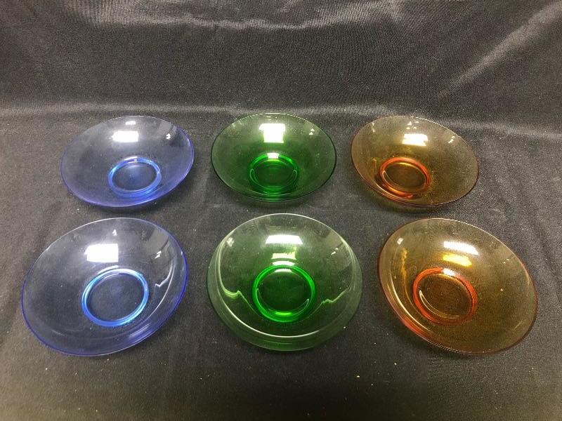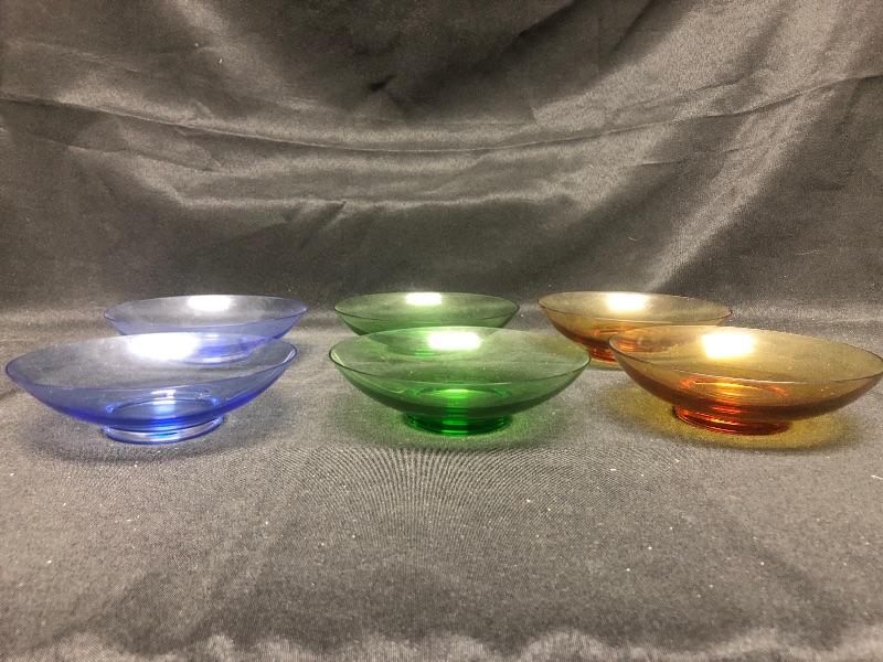 6 colorful glass dessert bowls. Shallow bowls. 2 each in blue, green, and orange.
