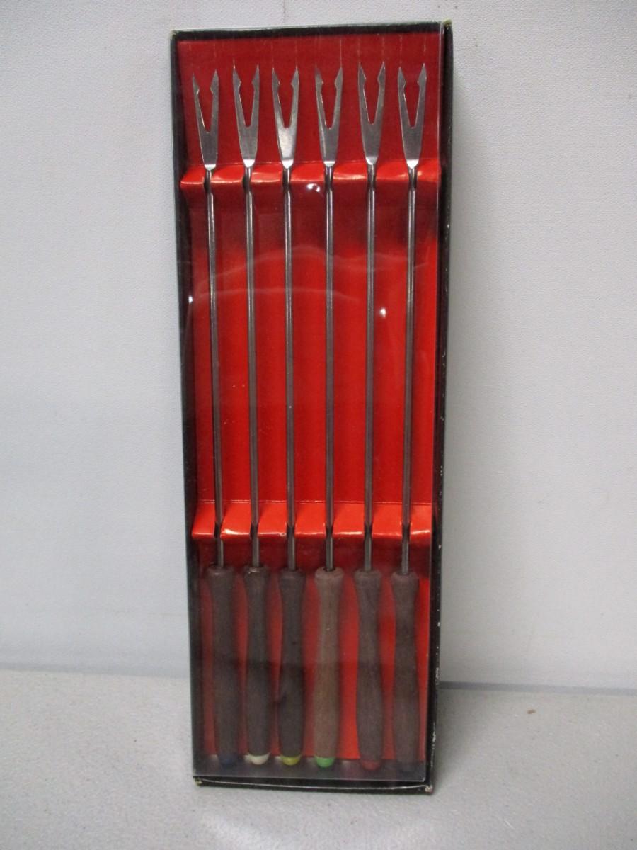 Set Of Six Stainless Steel Fondue Forks - Wood - Made In Japan