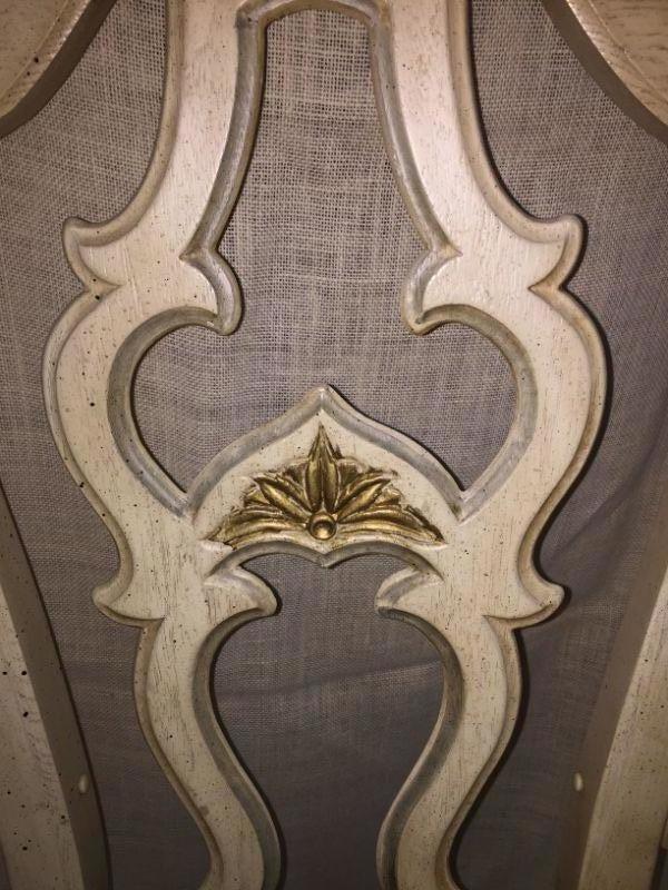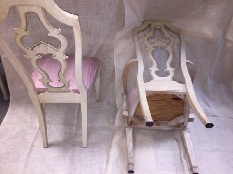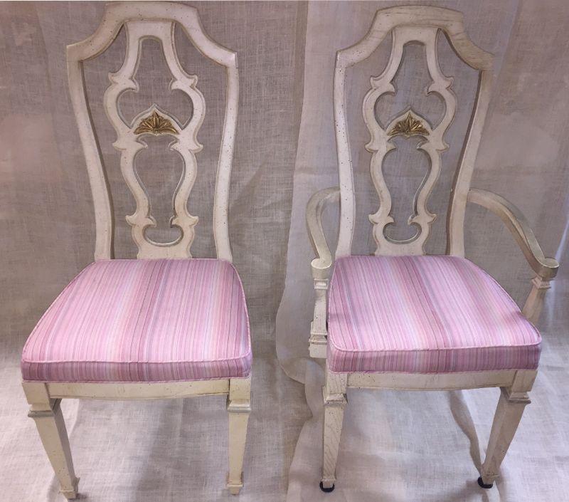 Two Arm Chairs, 4 Side Chairs, sturdy and substantial with vintage finish and charming violet/mauve stripe upholstery in good condition, measure 20"w x 20"d x 42"h x 19"seat