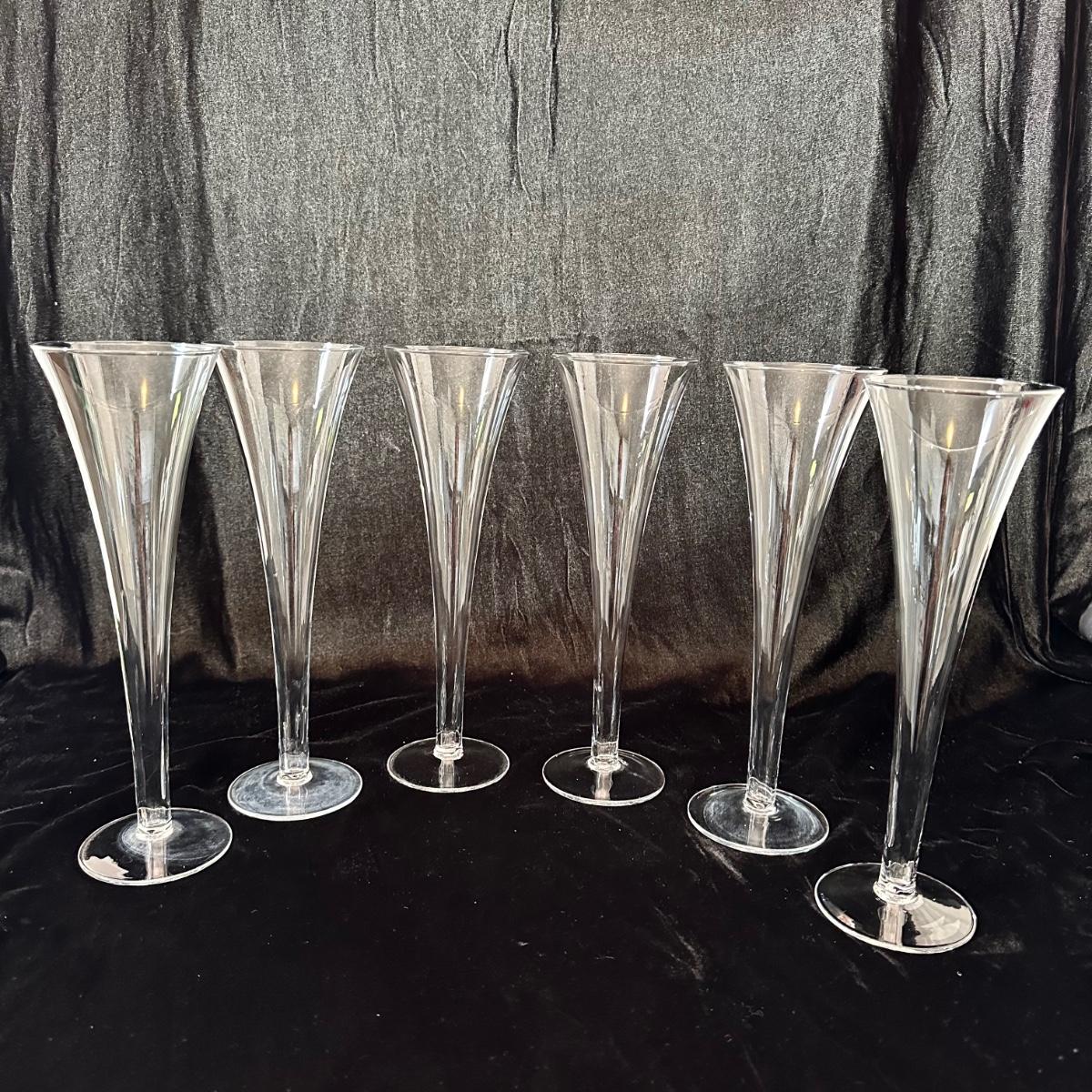 Set of six glass trumpet flute champagne glasses. Flutes are 3"D x 10"H.