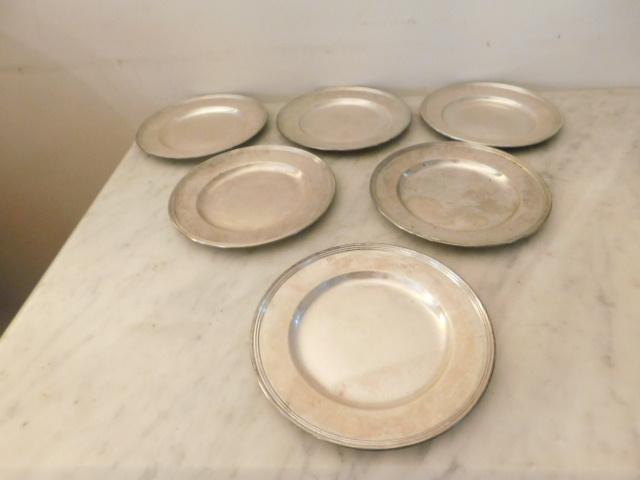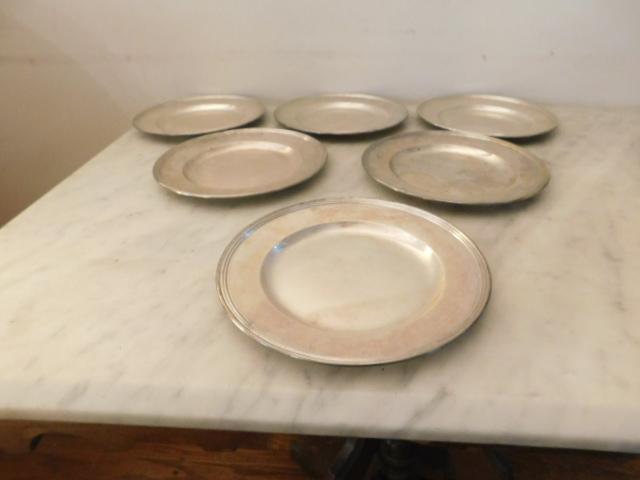 Set of Six Vintage Sterling Silver Plates Approximately 451 grams. Each plate is approximately 6 inches in diameter.