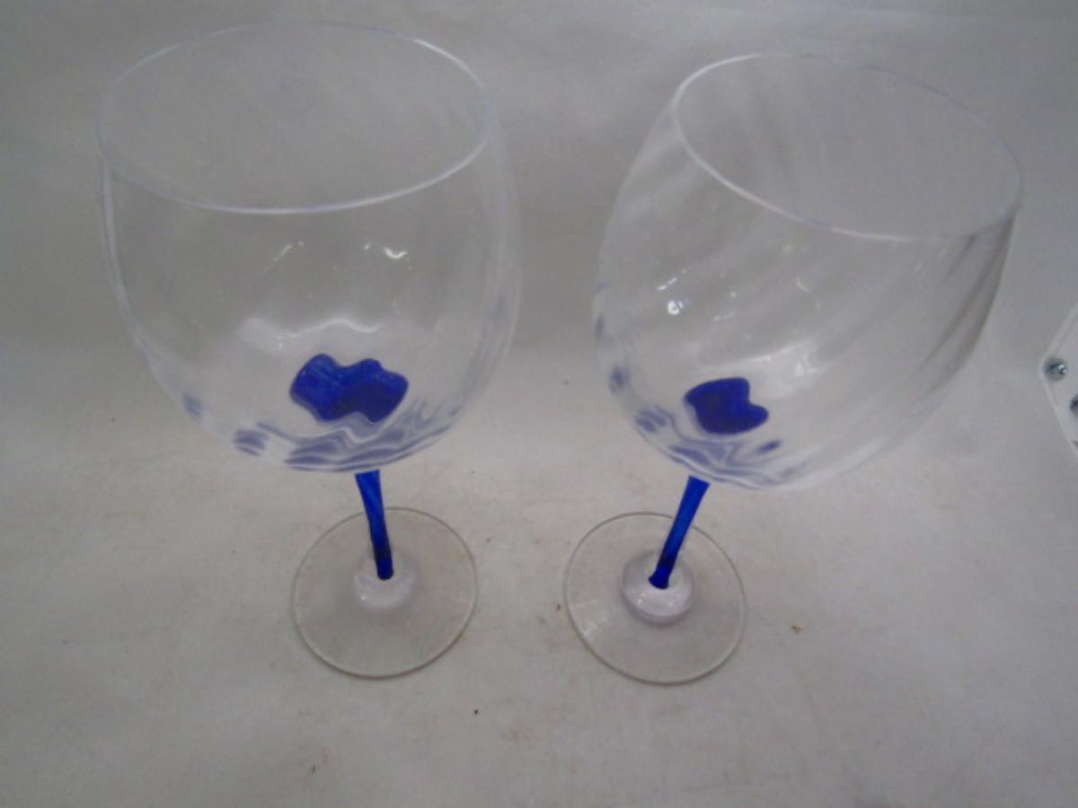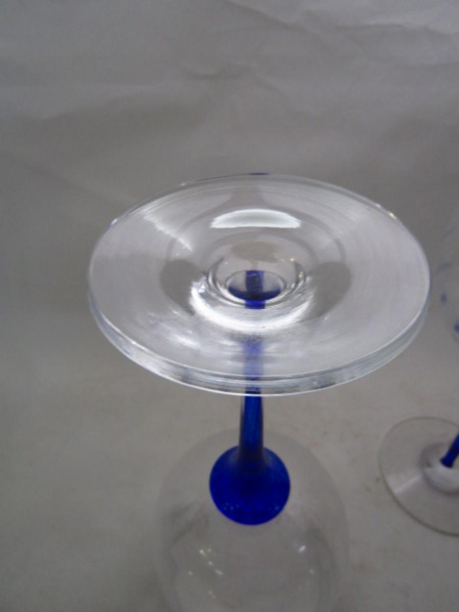 Set of Six Wine Glasses- Swirl Pattern with Cobalt Blue Stem. No maker's mark found.