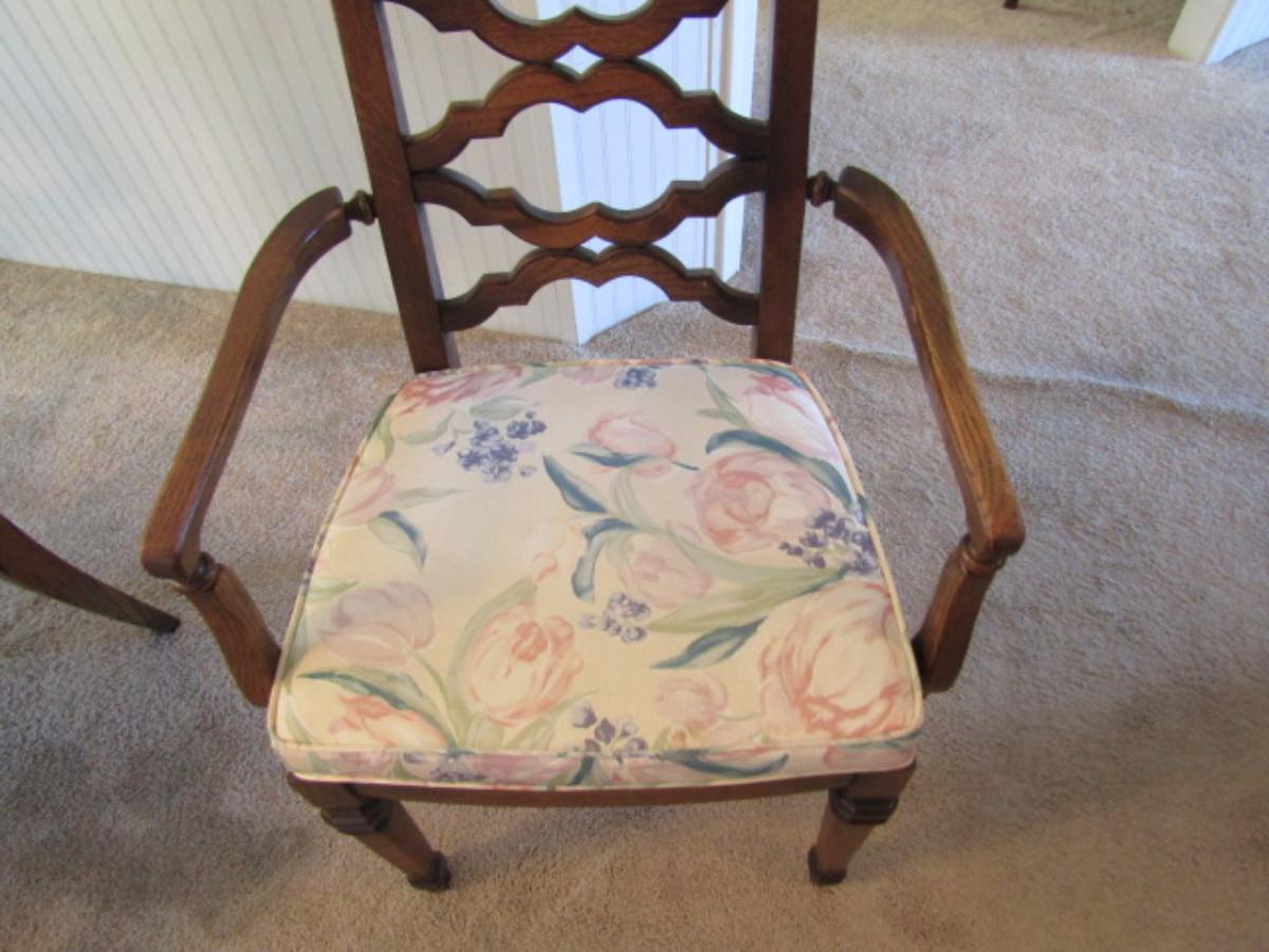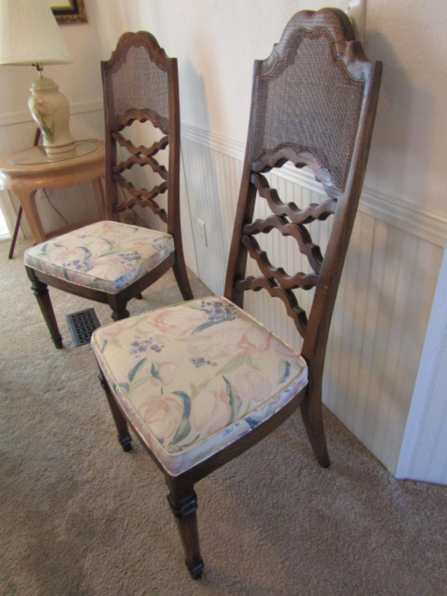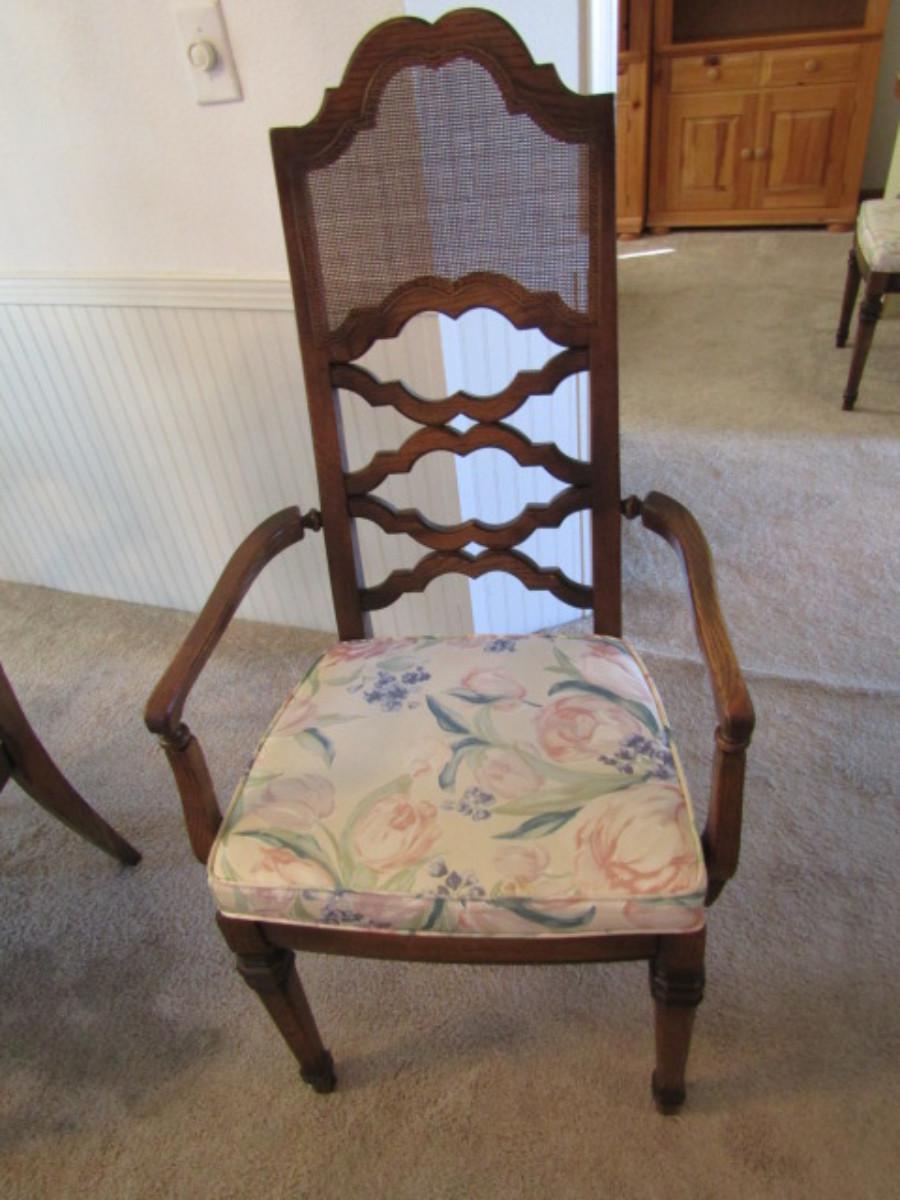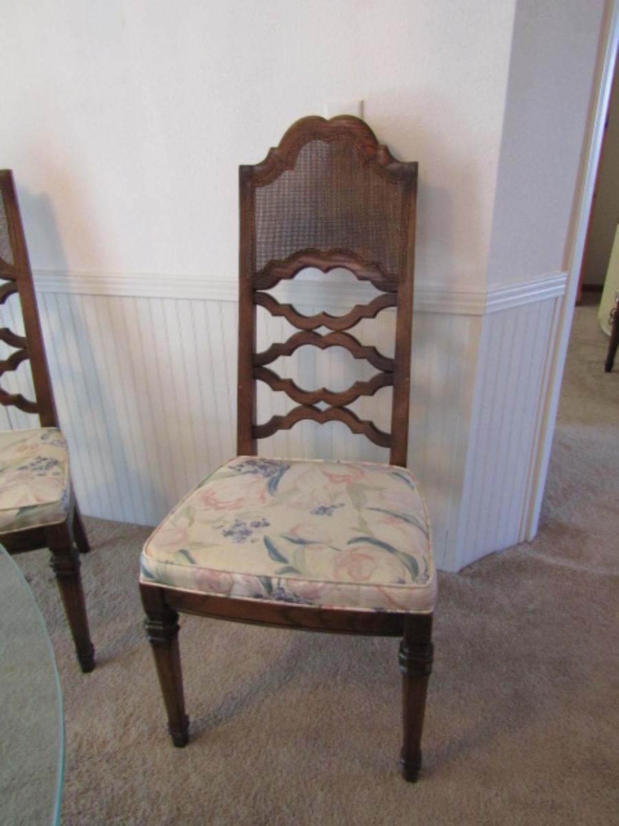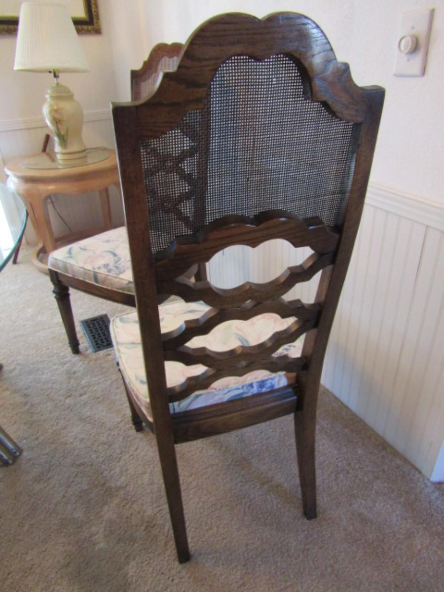 Set of Six Wood Frame Cane Back Dining Chairs with Upholstered Seats- 4 are side chairs, 2 are arm chairs.