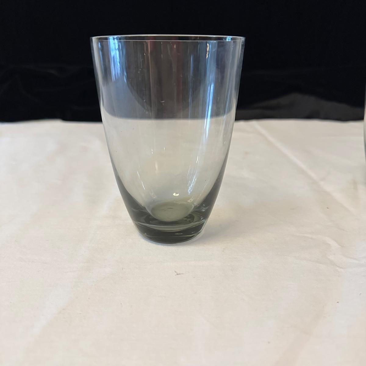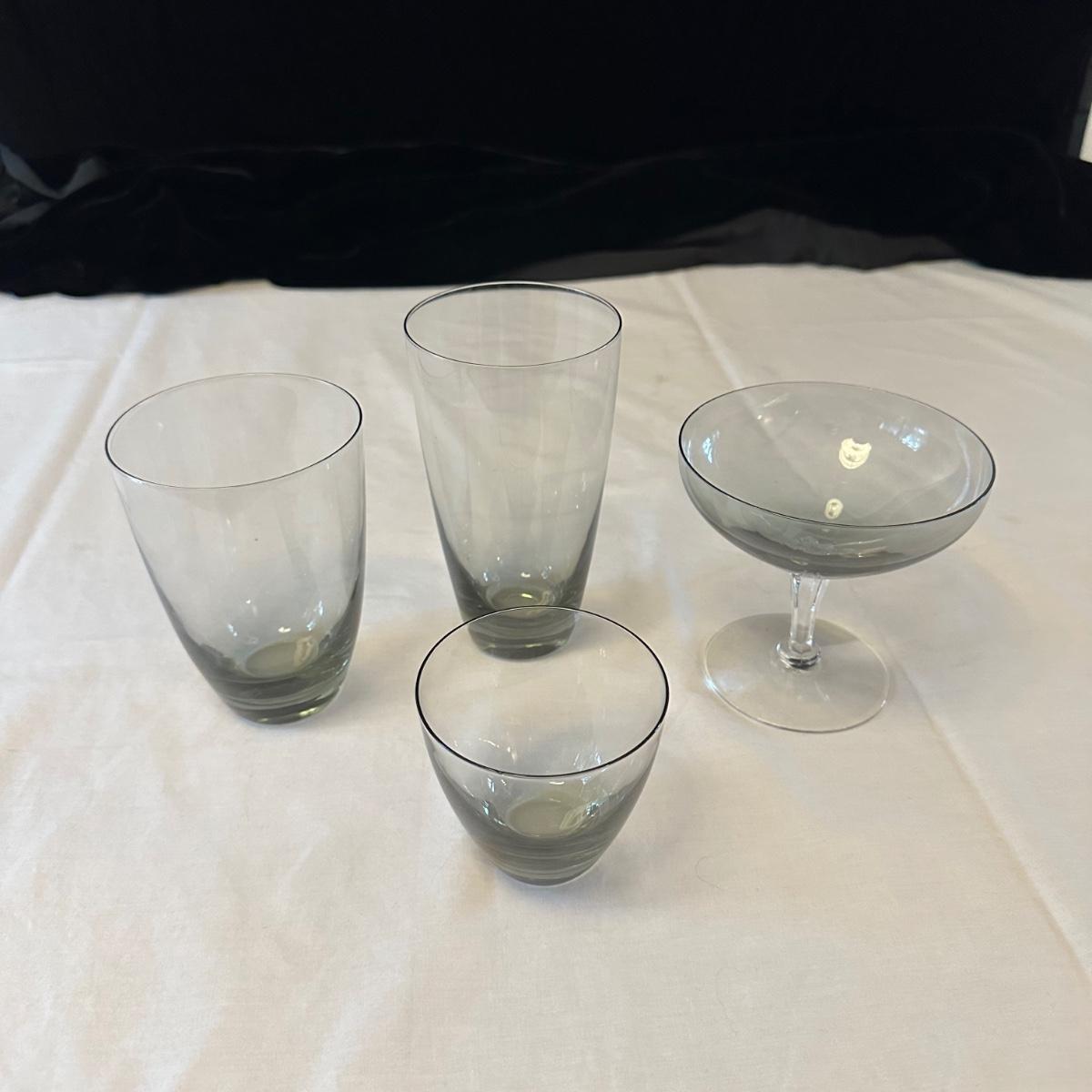 Three sizes of drinking glasses and four champagne glasses. They have the appearance of vintage Kastrup Holmegaard Copenhagen gray smoke glass. Tallest glass measures 6”H. Shortest glass measures 3”H. One champagne glass has a small chip. See photo. Shipping available.