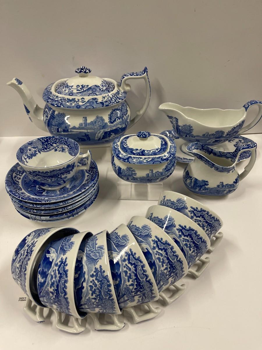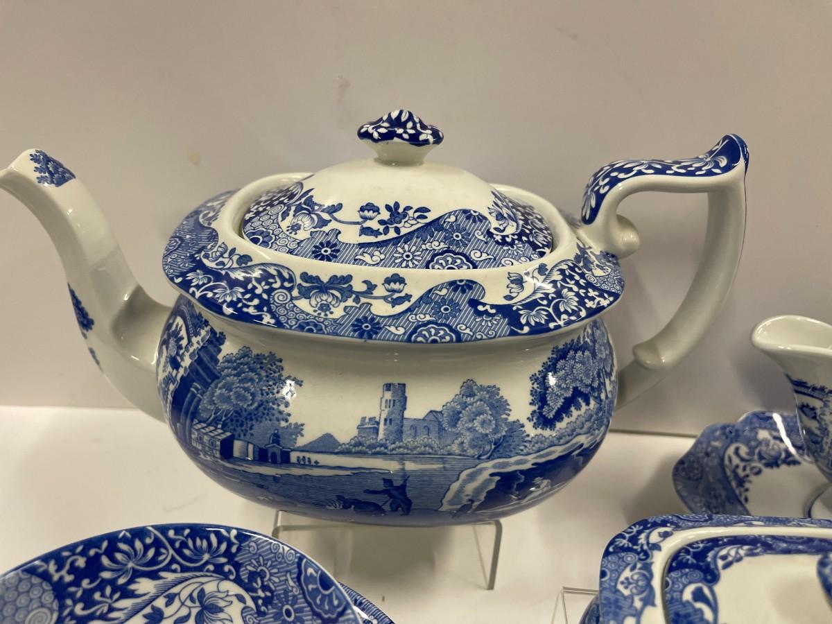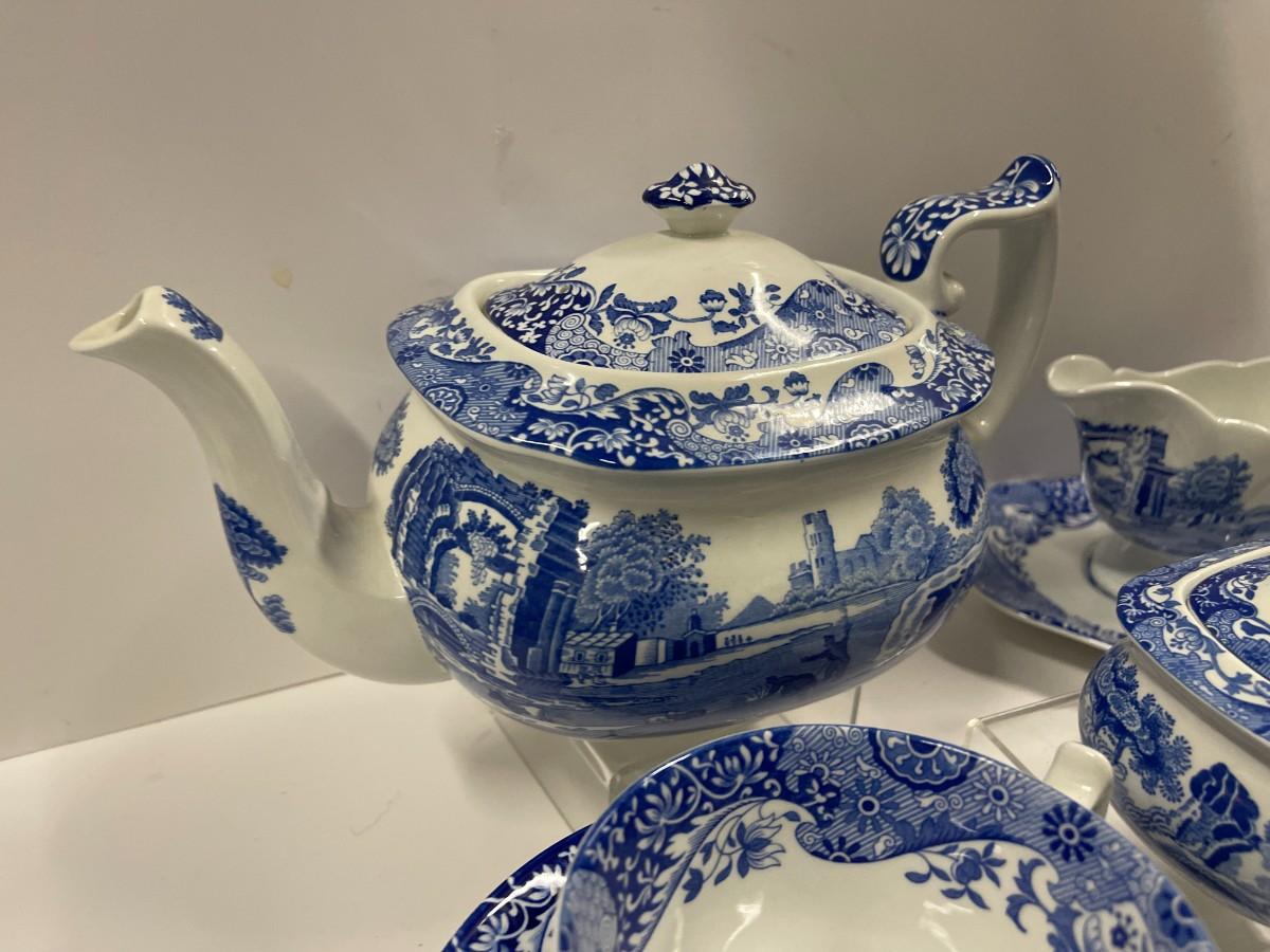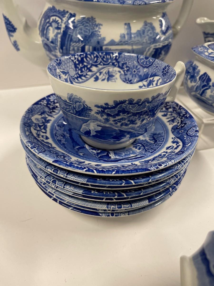 Set of Spode Blue Italian porcelain dishes. Includes: 8 cups and saucers, gravy boat with under plate, sugar and creamer and tea pot.