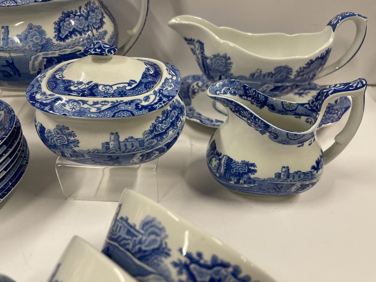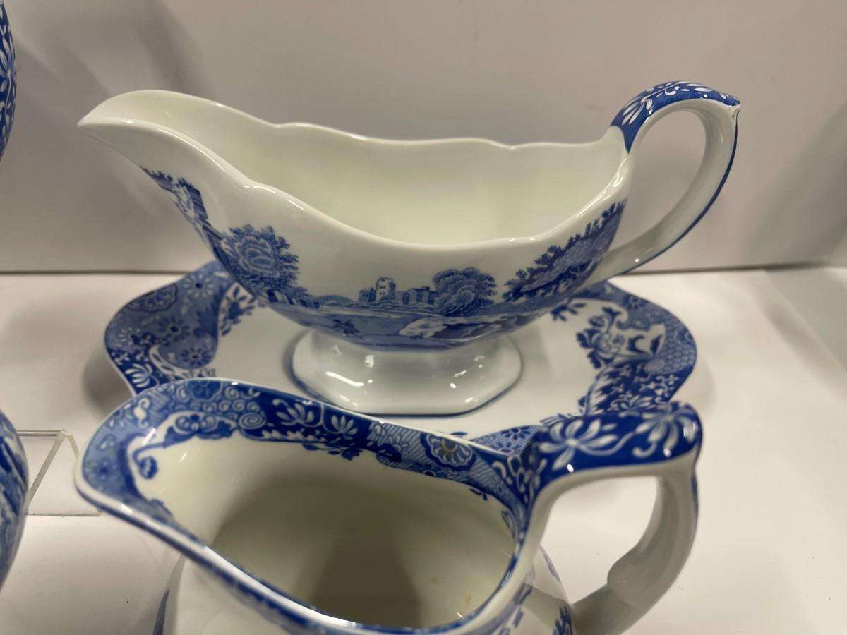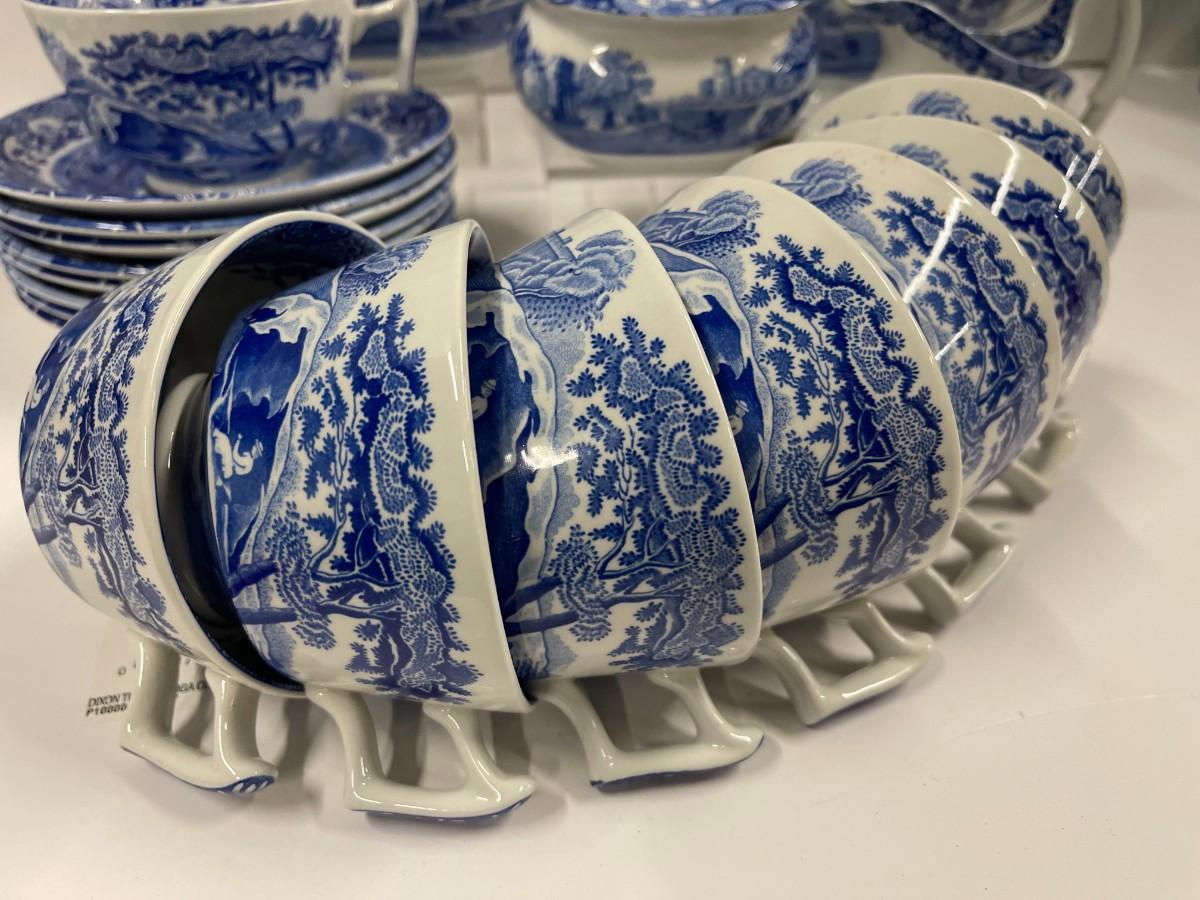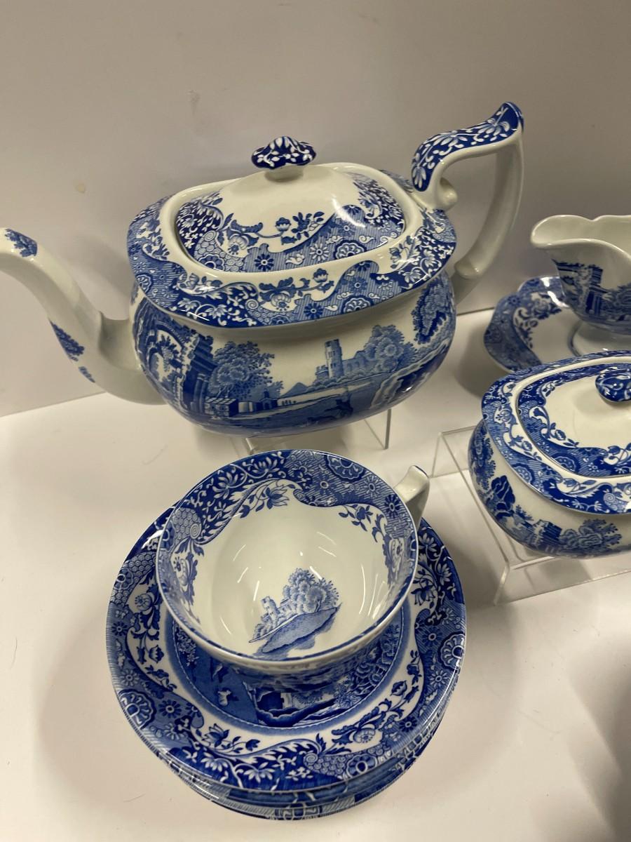 Set of Spode Blue Italian porcelain dishes. Includes: 8 cups and saucers, gravy boat with under plate, sugar and creamer and tea pot.