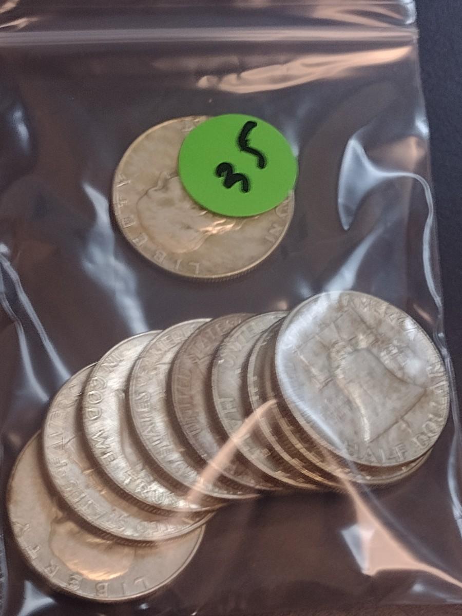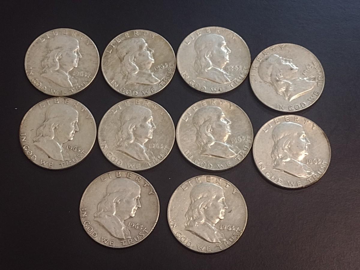 Set of Ten 1963-D, Unmarked U.S. Mint Franklin Silver Half Dollars Circulated (35)