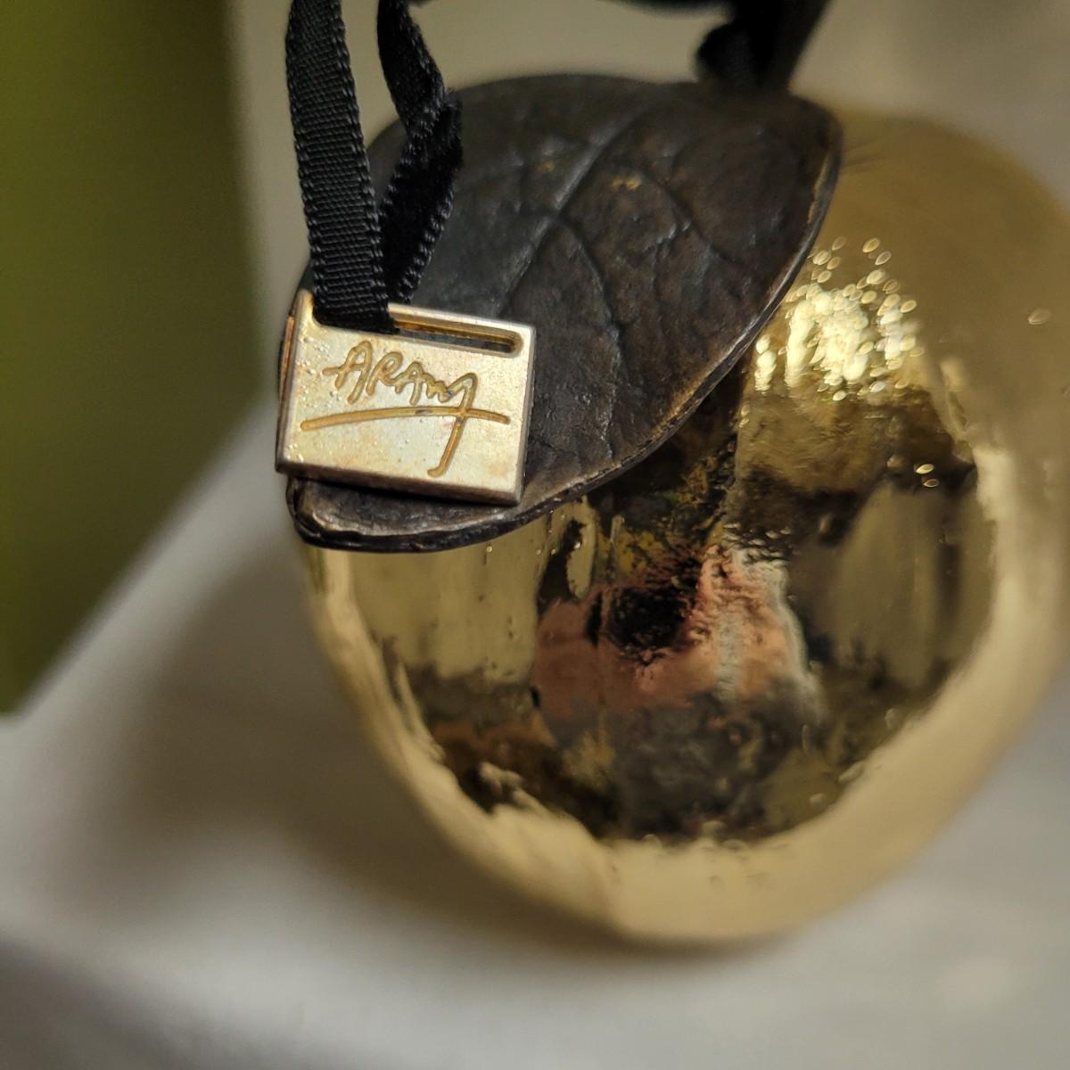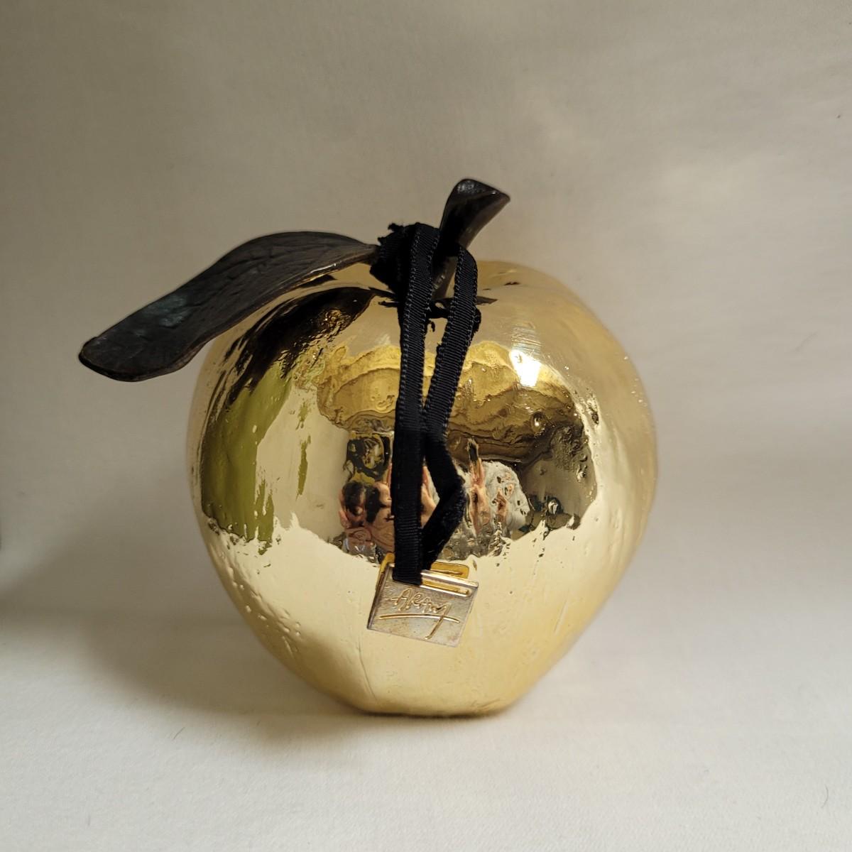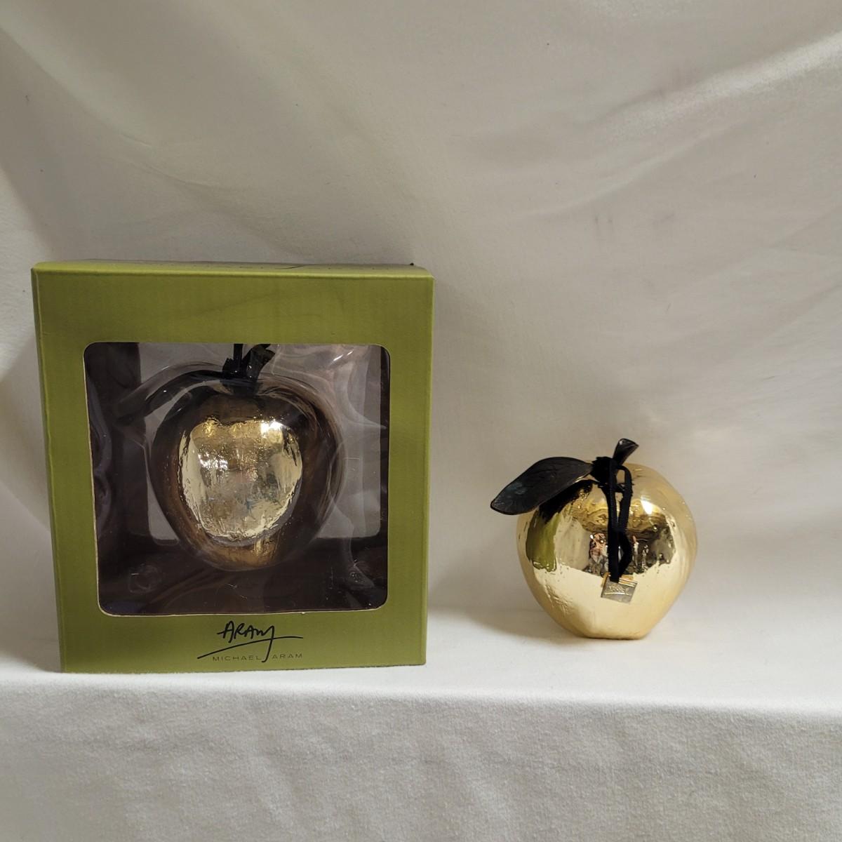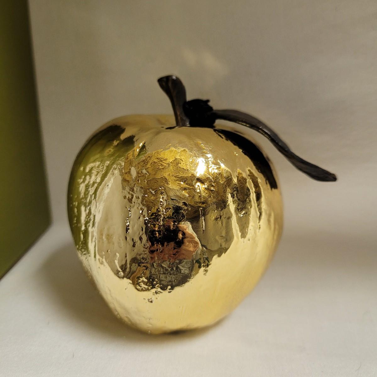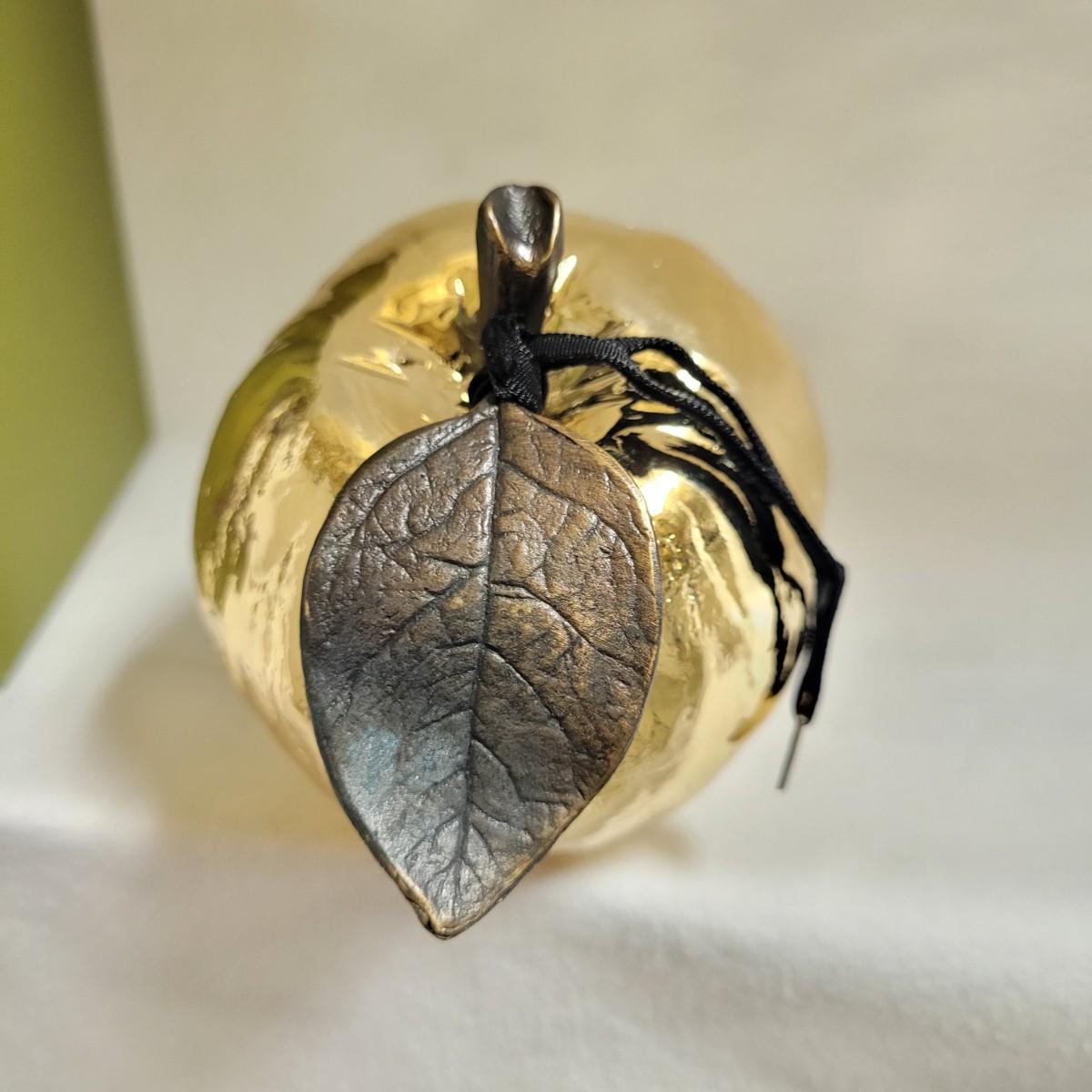 These unique, gold colored metal apple ornaments are beautifully detailed with texture and design, down to the veins in the single leaf. Each set is fully encased in its box. Apple measures approximately 4"H. Shipping available. Shipping can be costly. Shipping available. Shipping can be costly. We suggest contacting our preferred local shipping provider, Postage Express, with dimensions and getting an estimate before bidding: (828) 670-5501 or postageexpress@yahoo.com.