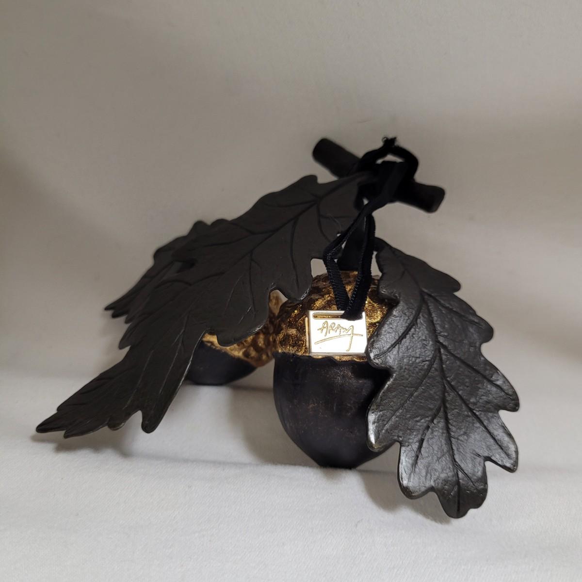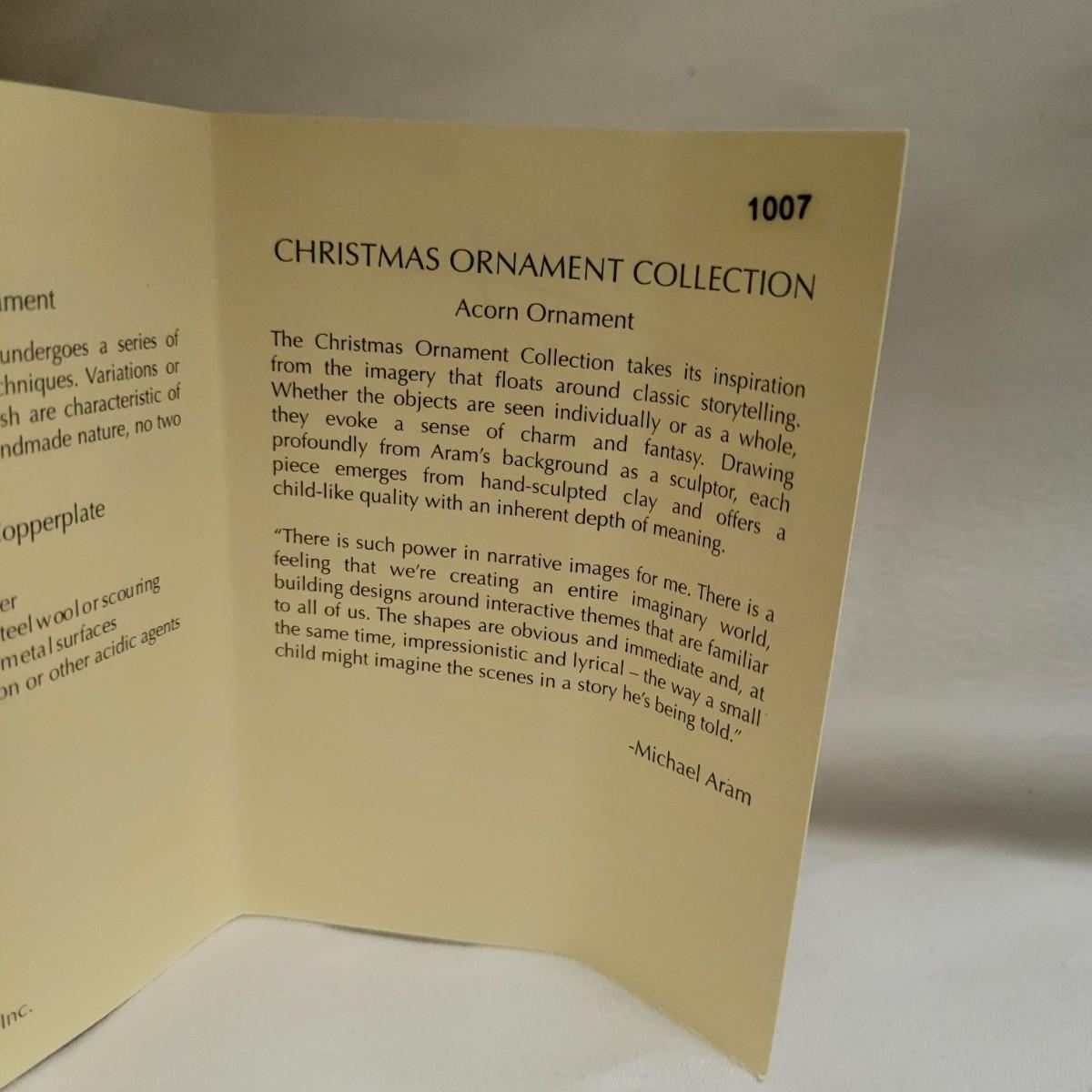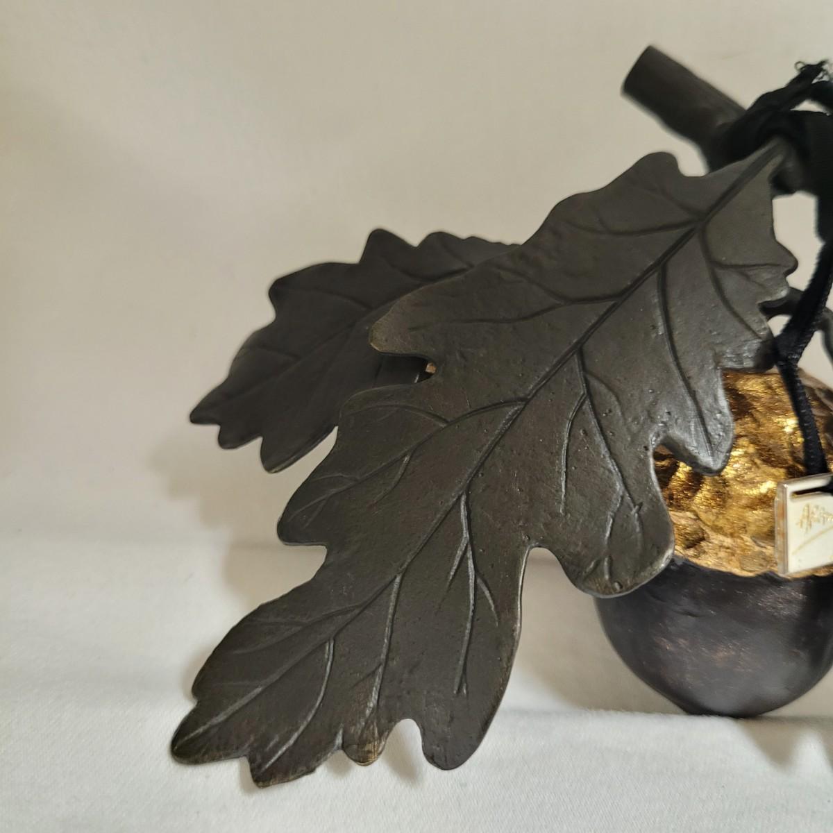 These unique metal acorn ornaments are beautifully detailed with texture and design, down to the gold acorn tops and realistic oak leaves. Each set is fully encased in its box. Ornaments measure approximately 5" x 4"H. Shipping available. Shipping can be costly. We suggest contacting our preferred local shipping provider, Postage Express, with dimensions and getting an estimate before bidding: (828) 670-5501 or postageexpress@yahoo.com.