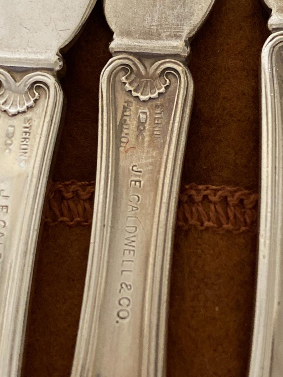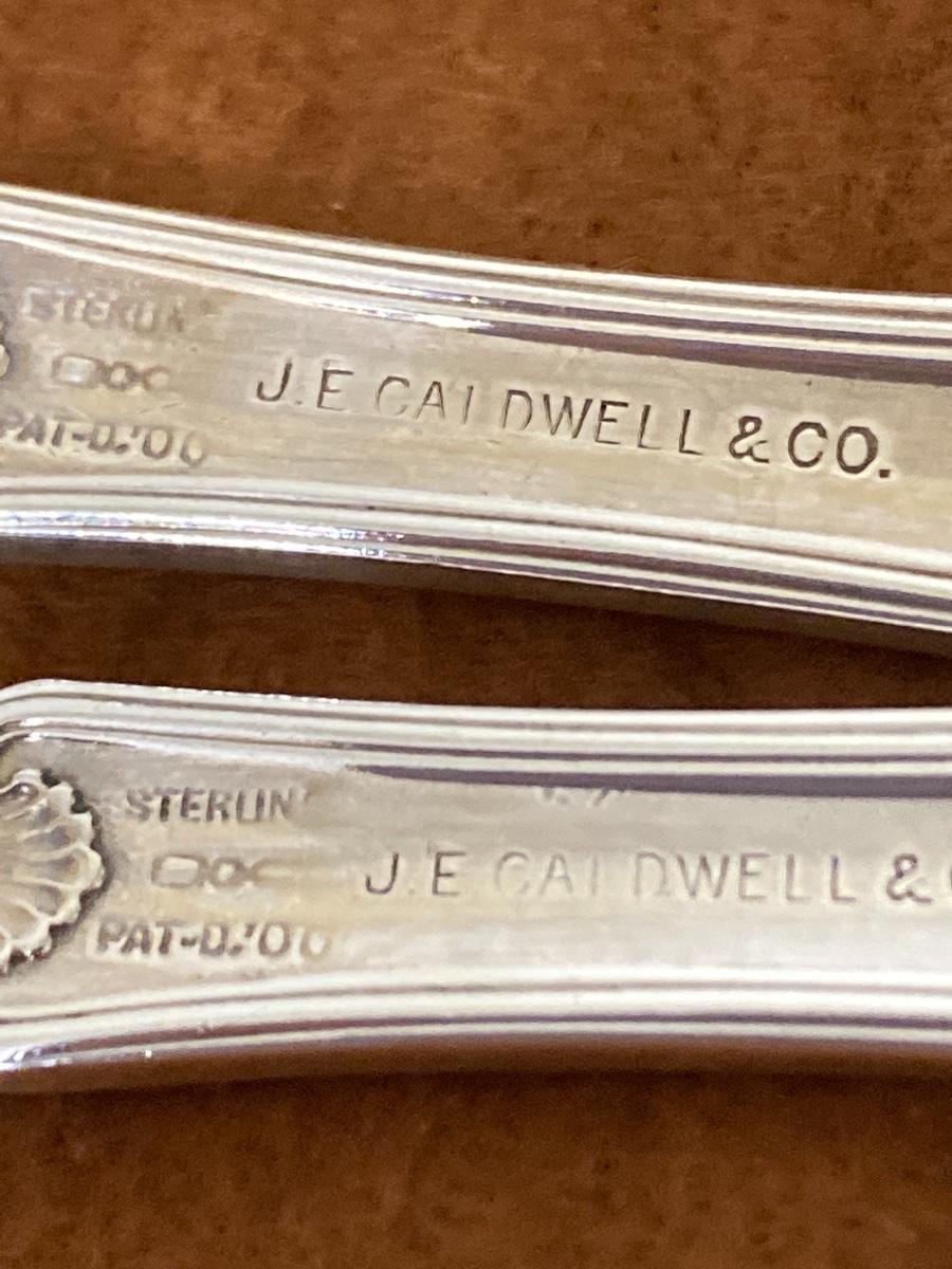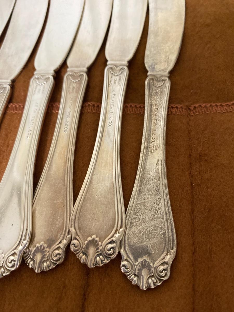 Ten sterling silver bread and butter knives stamped Sterling J E Caldwell. Each knife is 5.5 inches long. The total weight of all knives is 276 grams and 178 dwt. .
