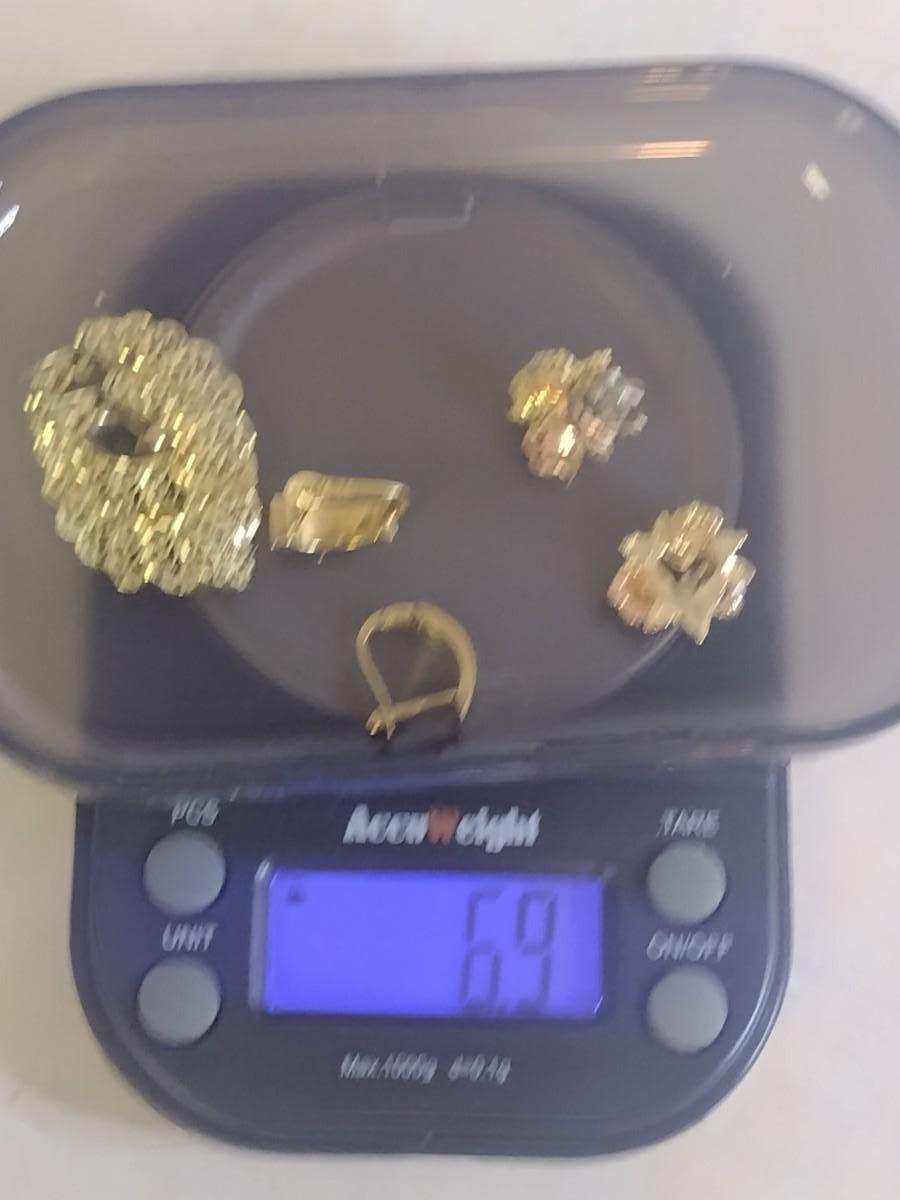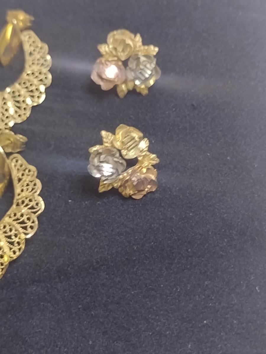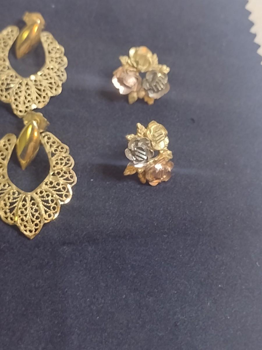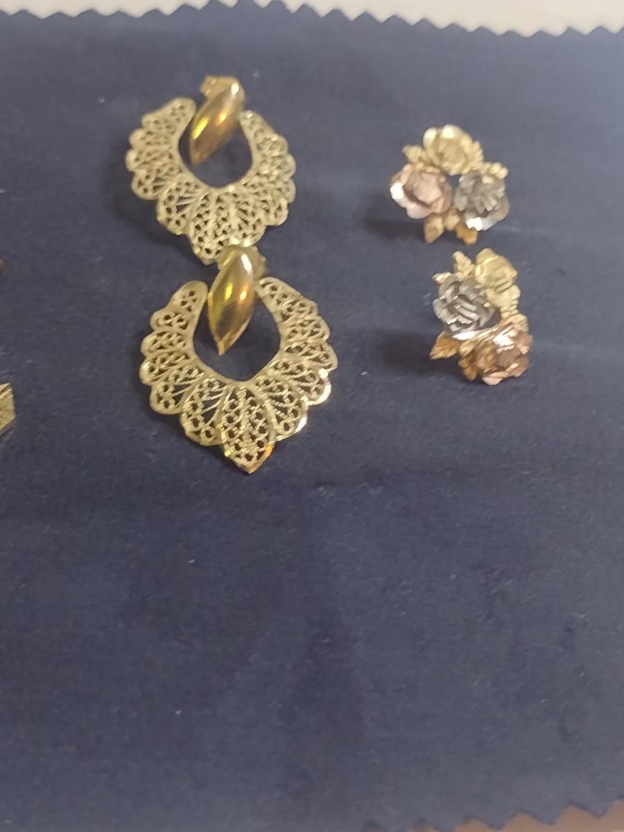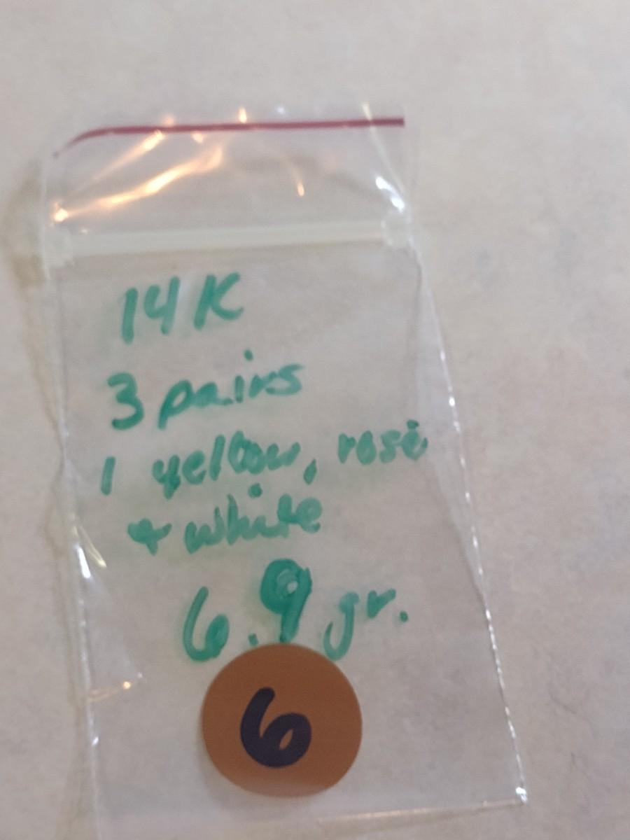Set of Three 14K Gold Post Earrings- Approx Total Weight 6.9 Grams (#6). One pair is yellow, white, and rose gold. A 6.75% NC sales tax will be added to the jewelry invoice amount at the end of the sale. Coins are exempt from state sales tax.