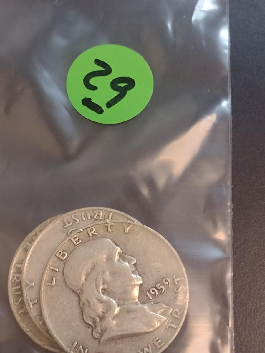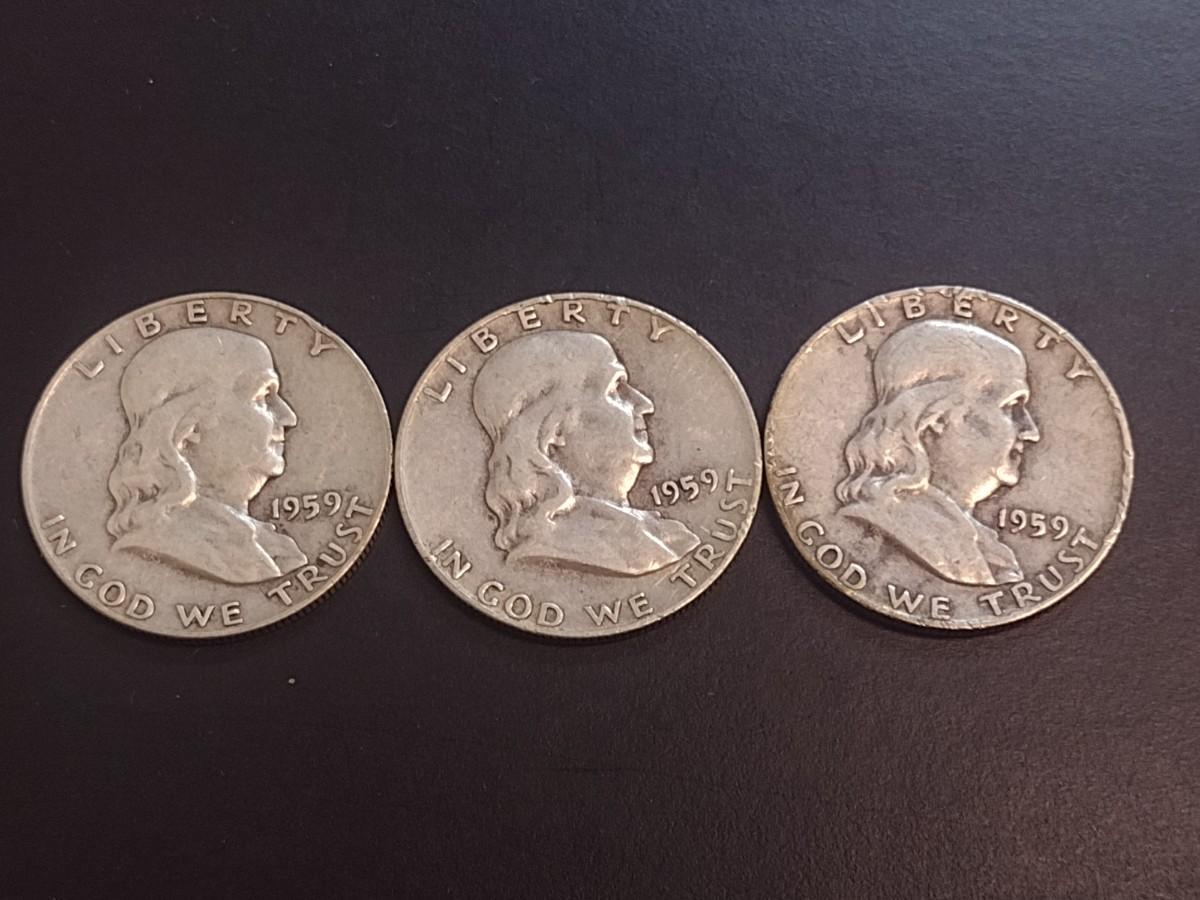 Set of Three 1959 Unmarked U.S. Mint Franklin Silver Half Dollars Circulated (29)
