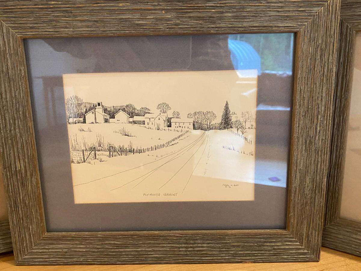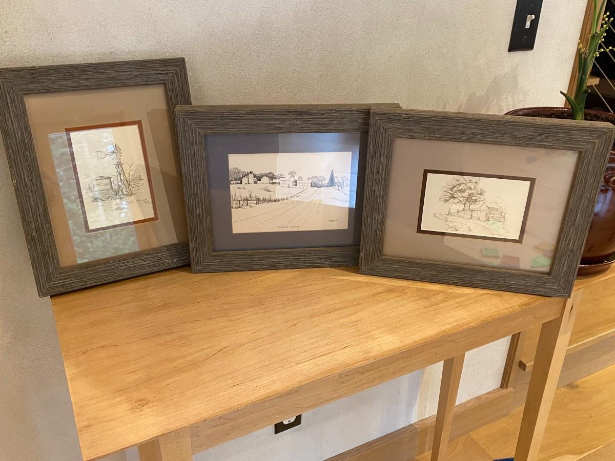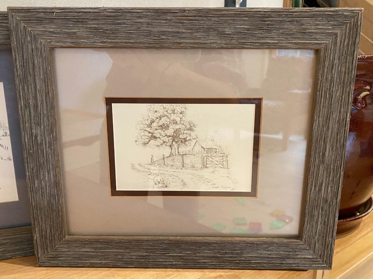 Set of three (3) barnwood framed "farmscape" landscape drawings