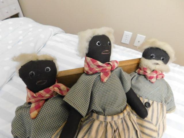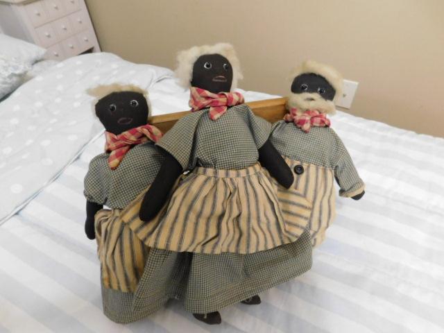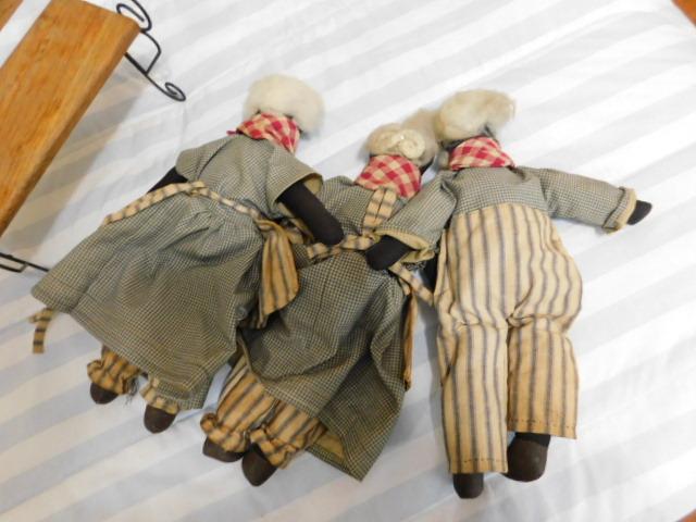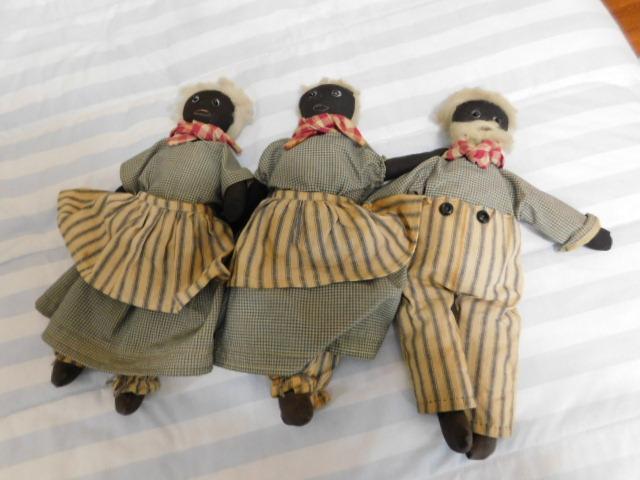 Set of Three Antique Hand Crafted Fabric Dolls 14" clothes appear to have some staining. May need to be cleaned.