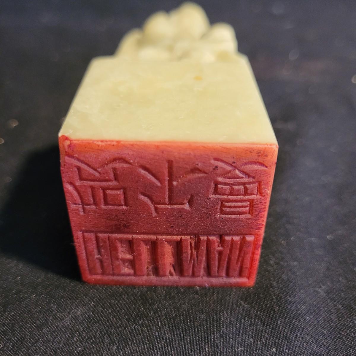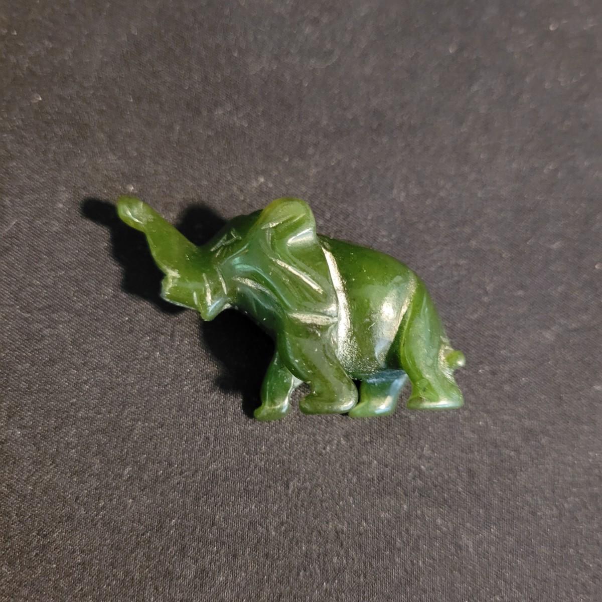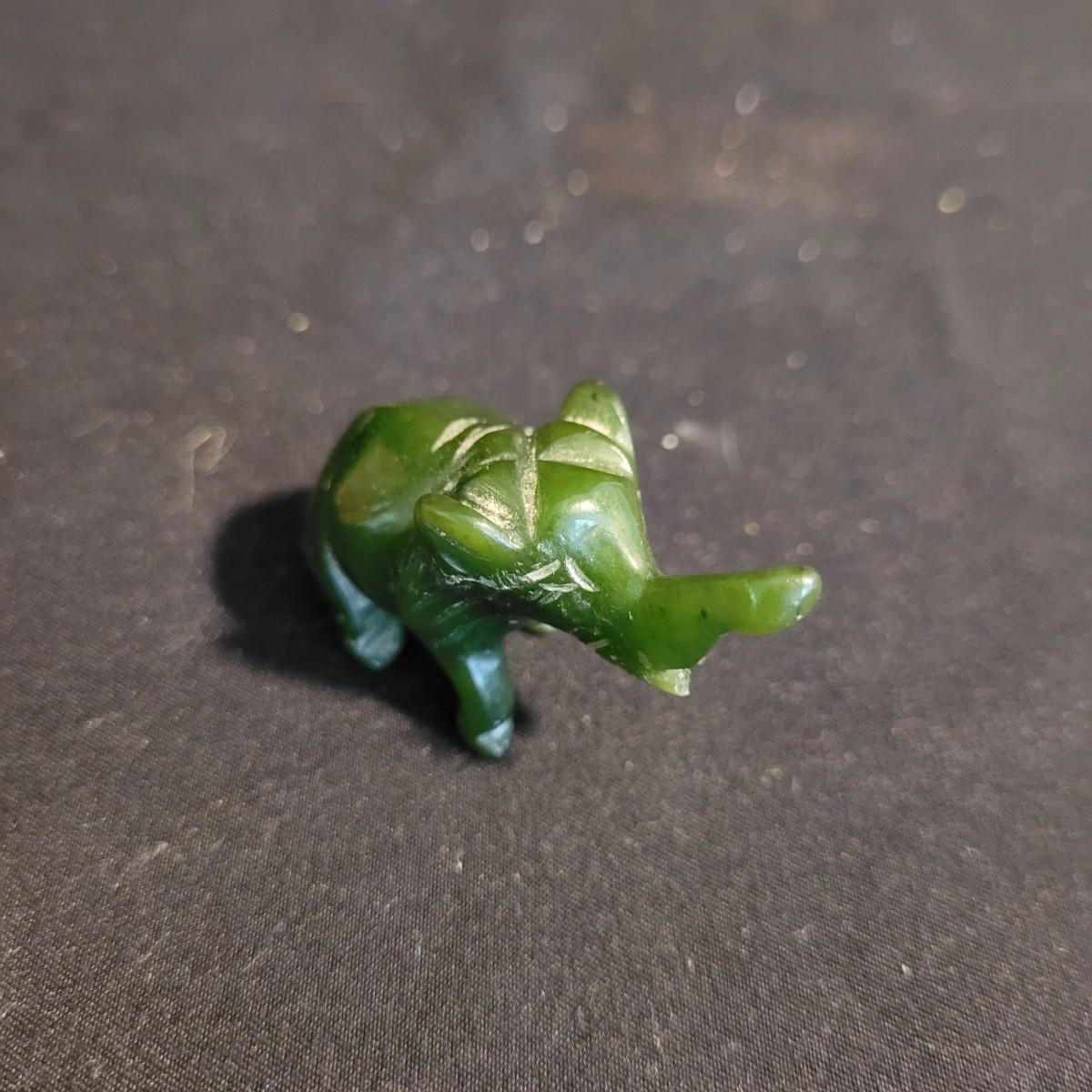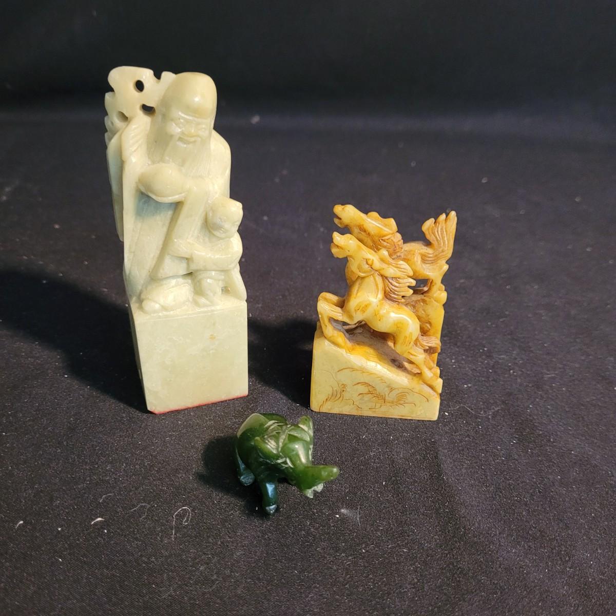 Set of three handcarved Asian stone figurines. One is possibly jade, cannot verify. Two larger figurines have engraved stamps on bottom with "Hellman" and Chinese characters. In good condition with chip at bottom corner of largest piece. Elephant in fair condition, with tusks broken off. For reference, largest figurine measures approximately 1.5"L x1.5"D x5"H. Shipping available.
