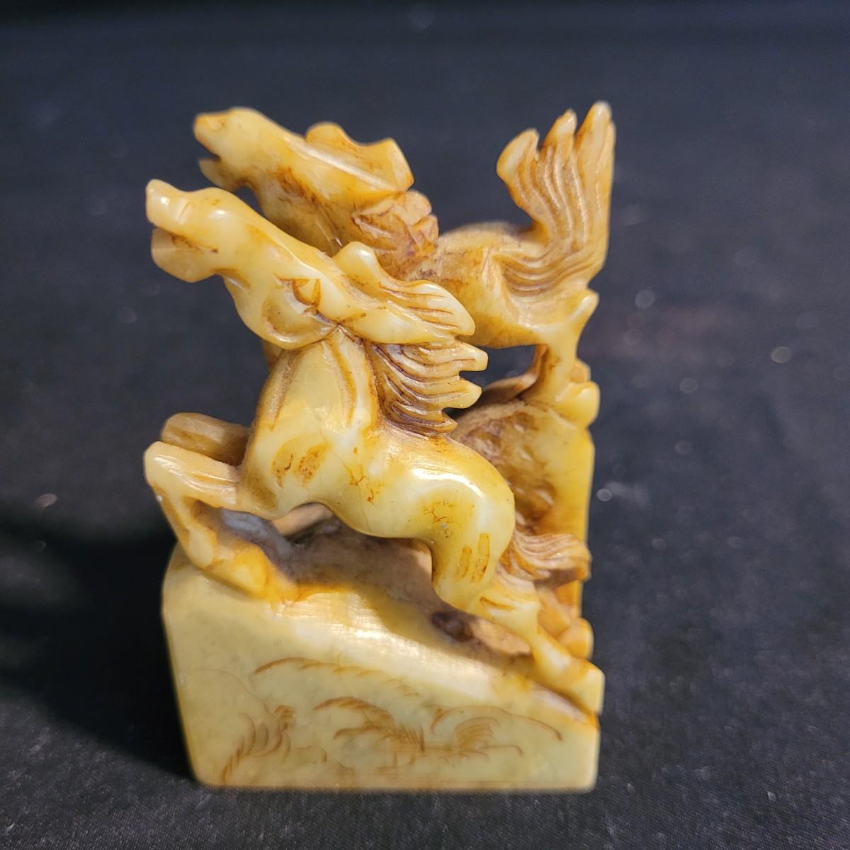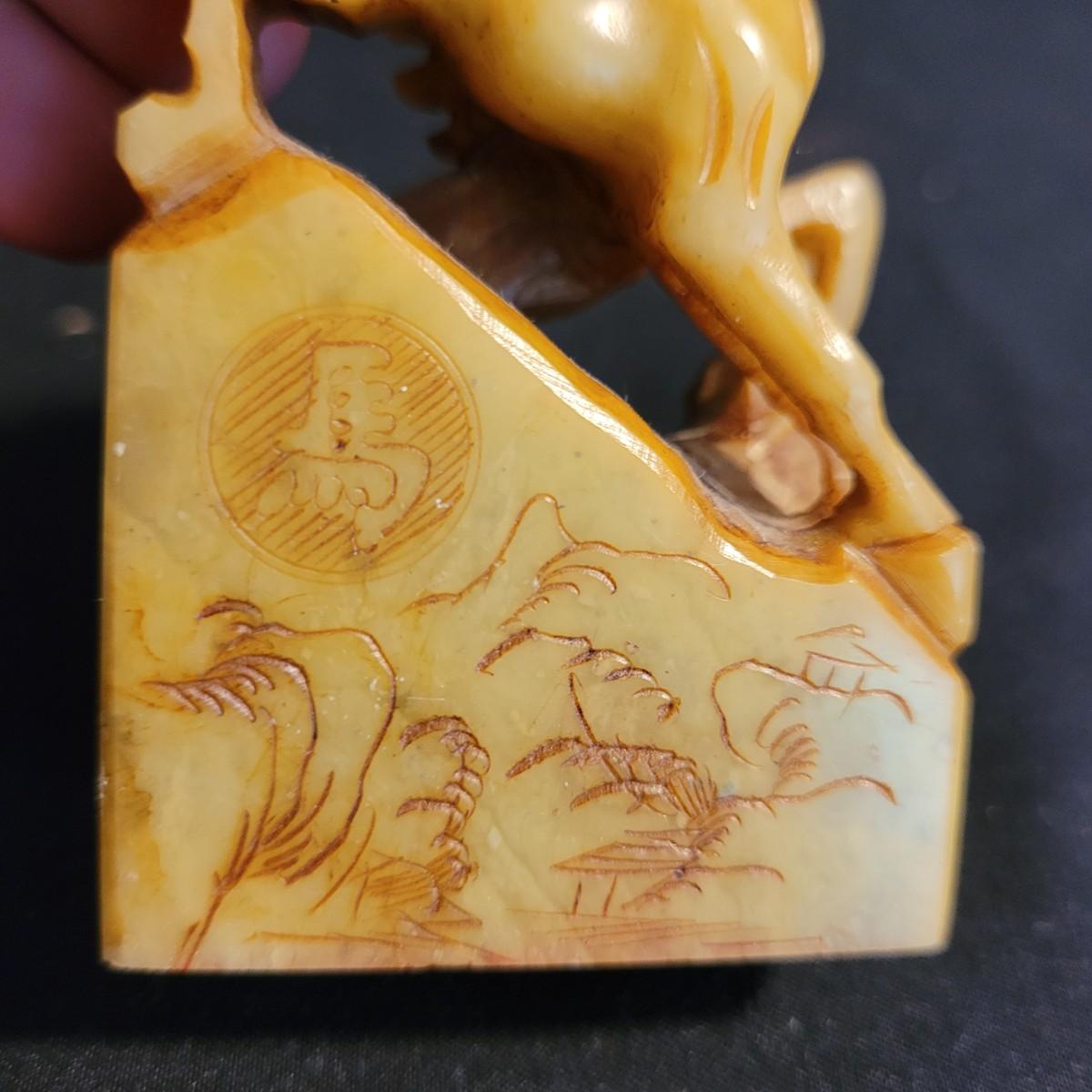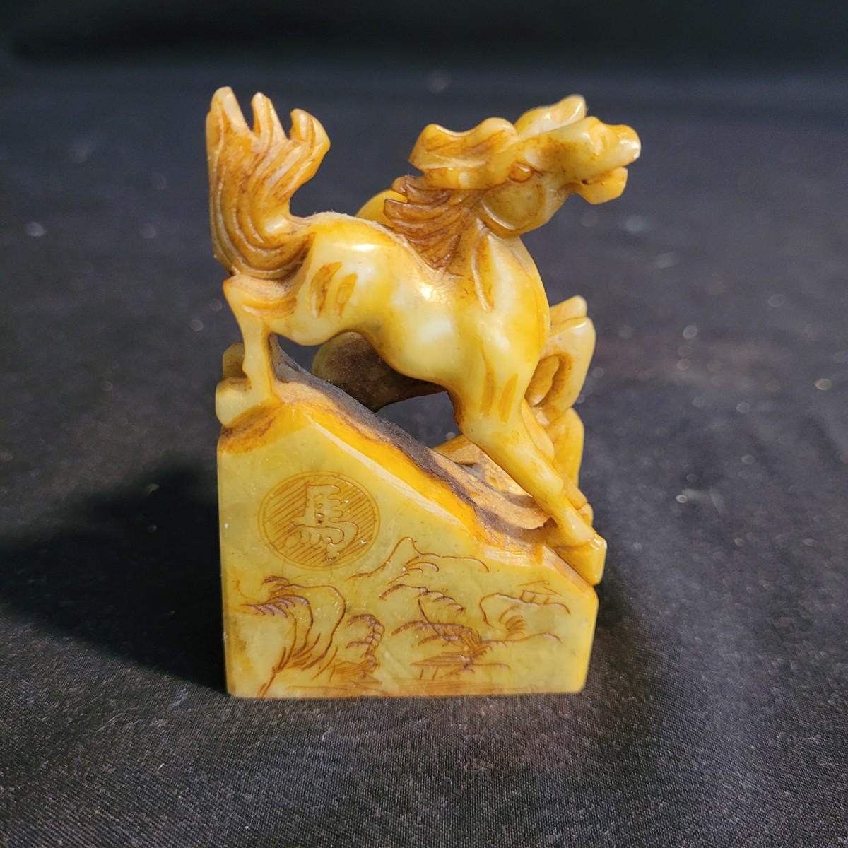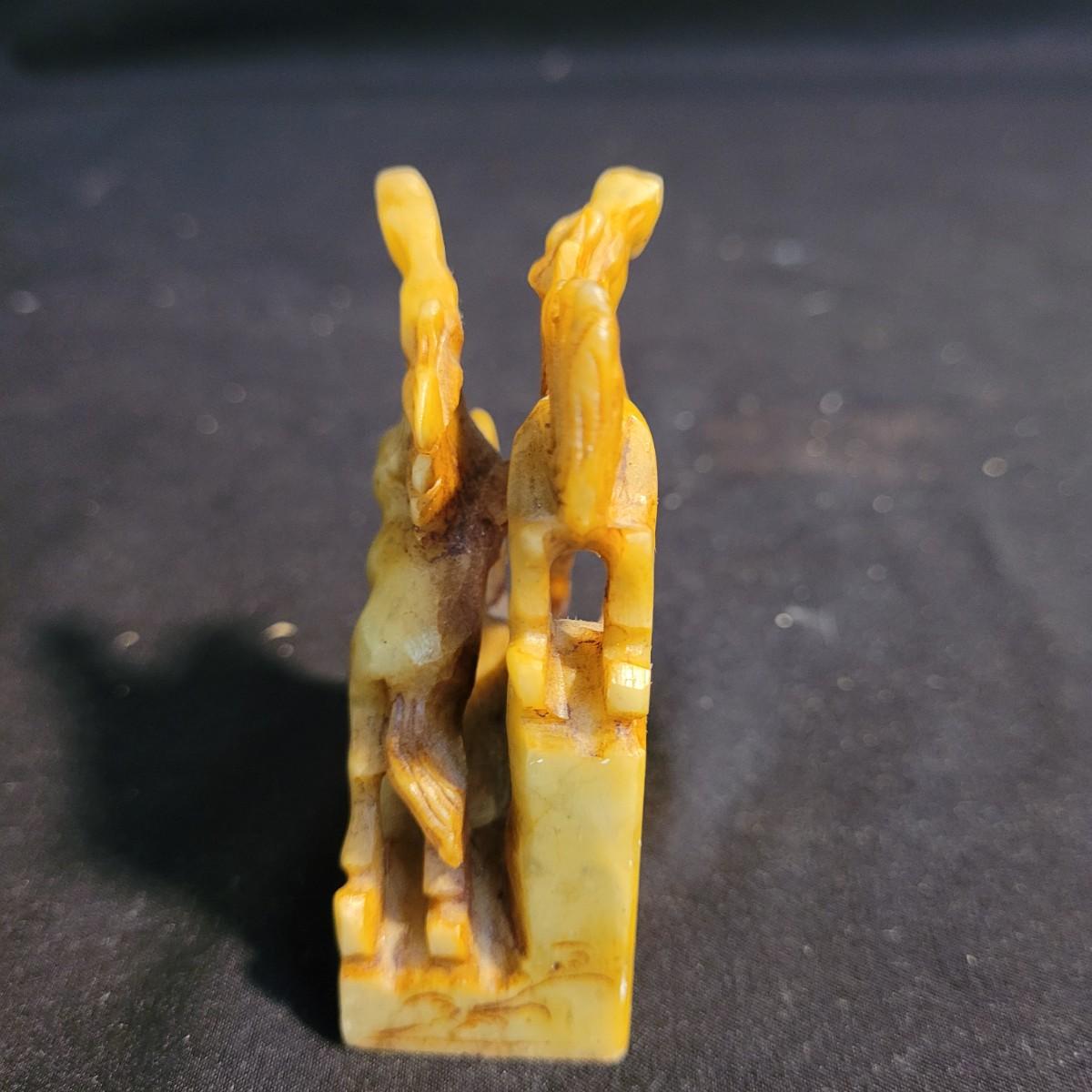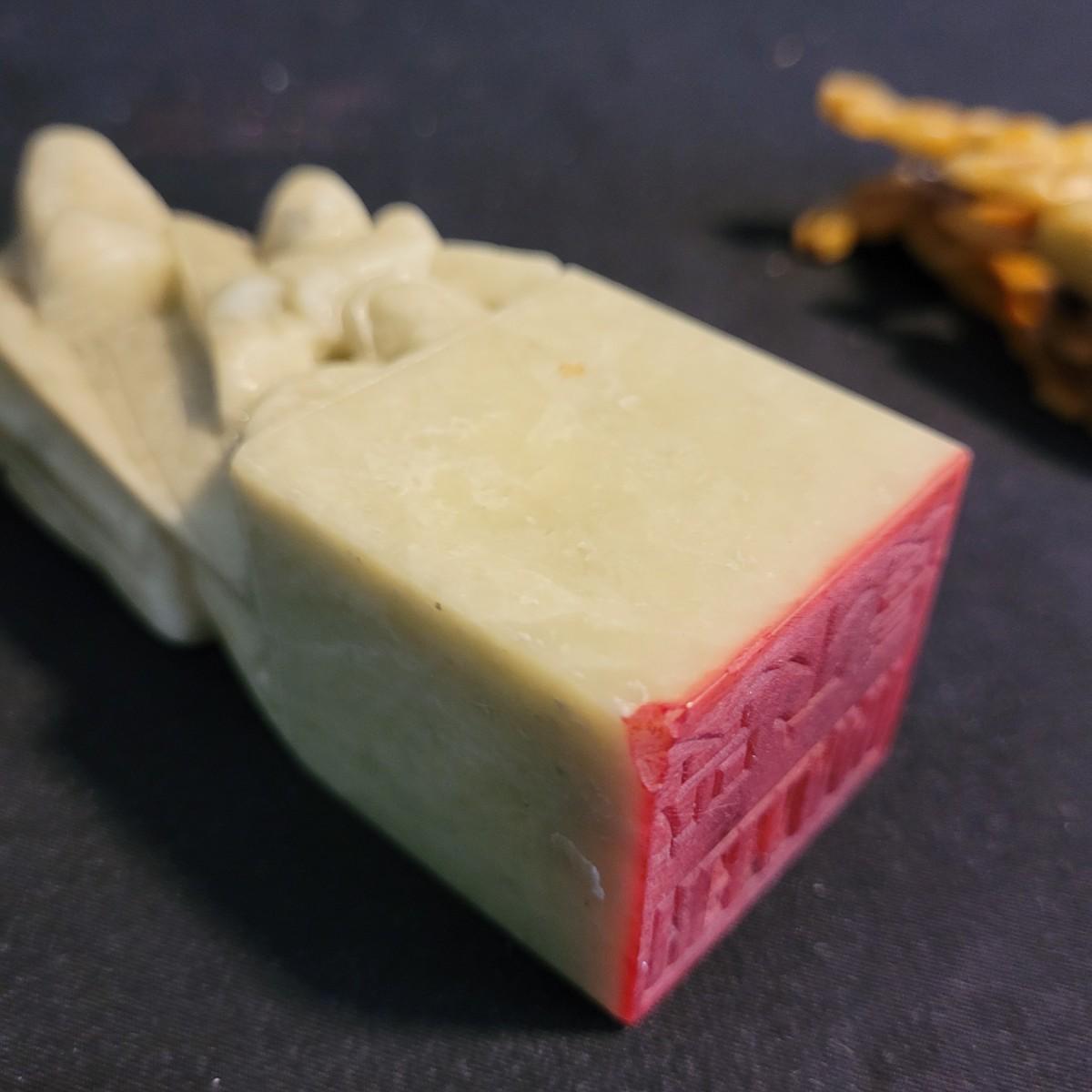 Set of three handcarved Asian stone figurines. One is possibly jade, cannot verify. Two larger figurines have engraved stamps on bottom with "Hellman" and Chinese characters. In good condition with chip at bottom corner of largest piece. Elephant in fair condition, with tusks broken off. For reference, largest figurine measures approximately 1.5"L x1.5"D x5"H. Shipping available.