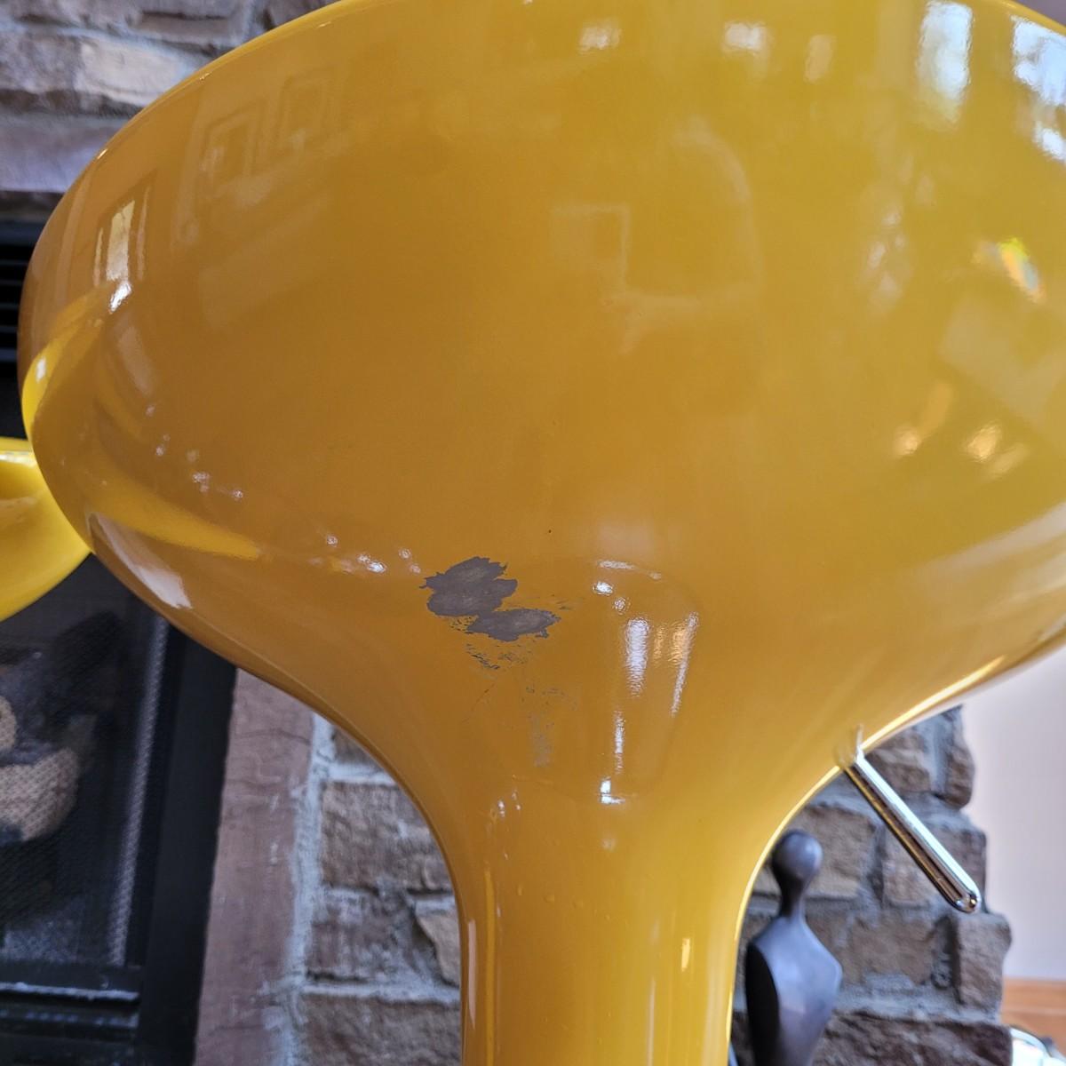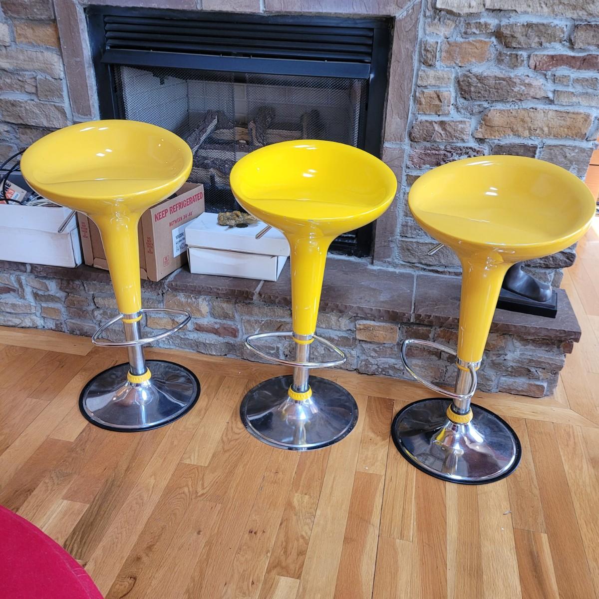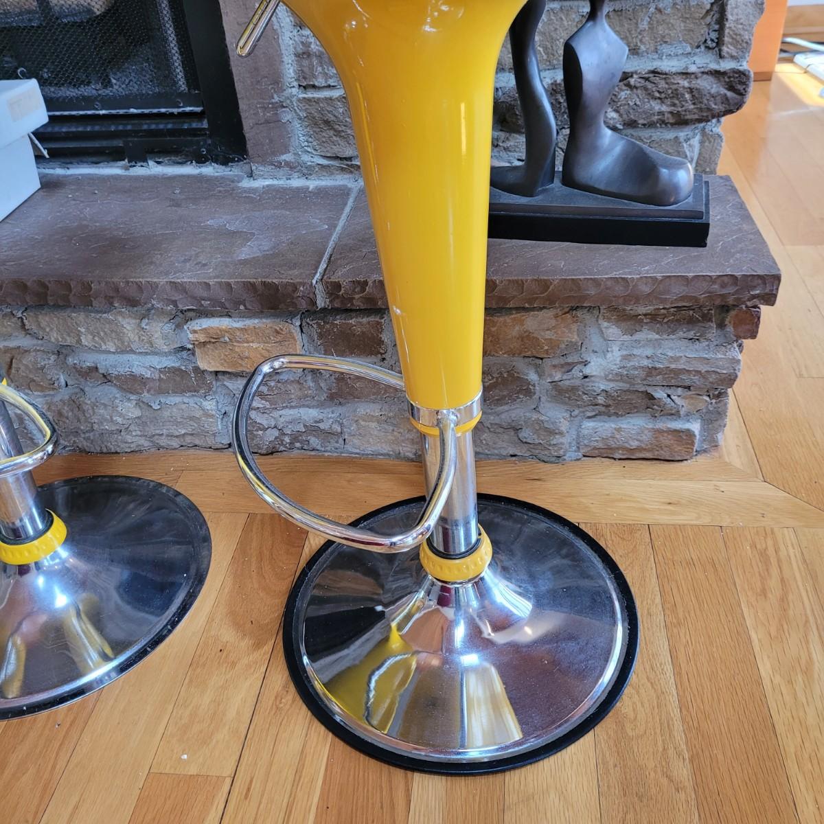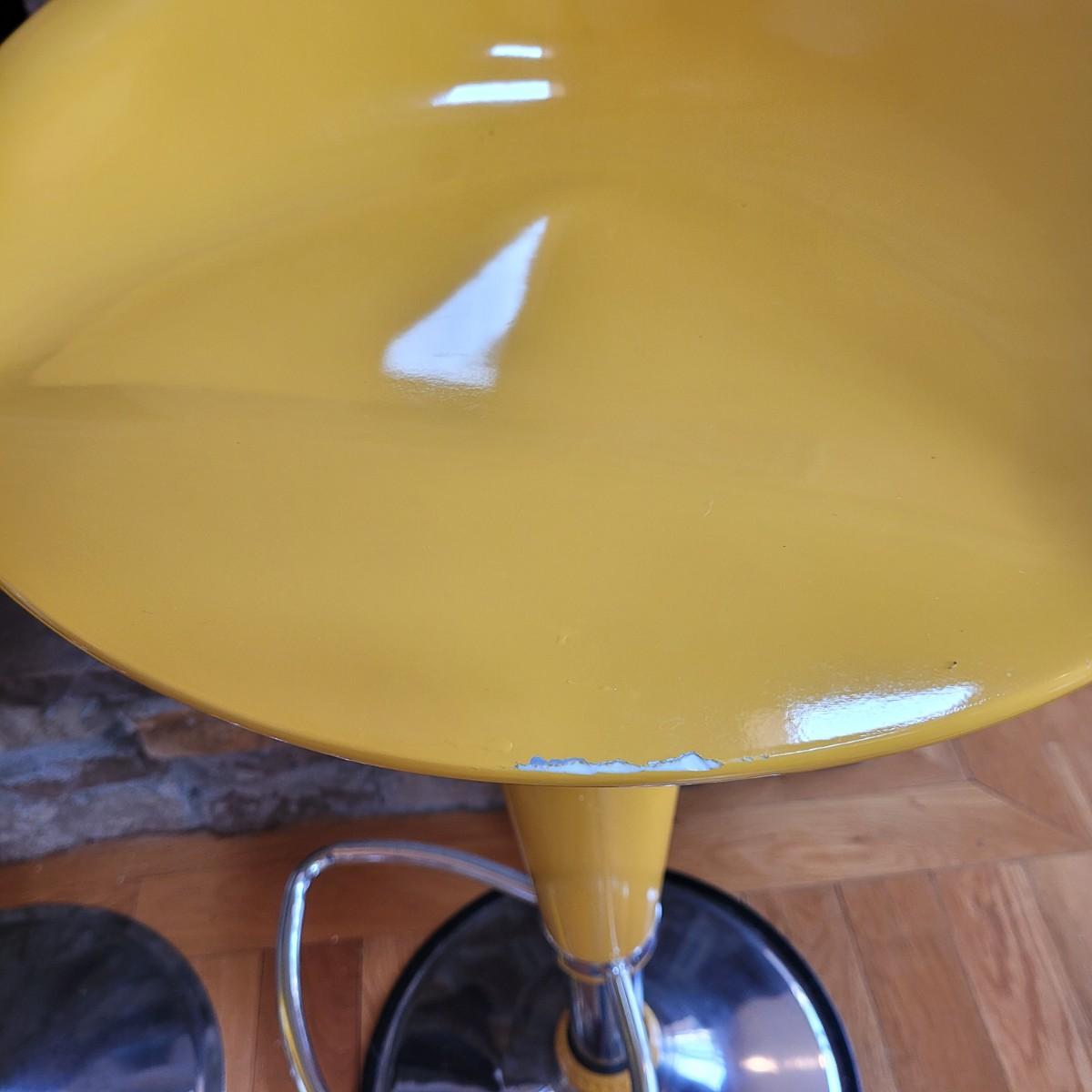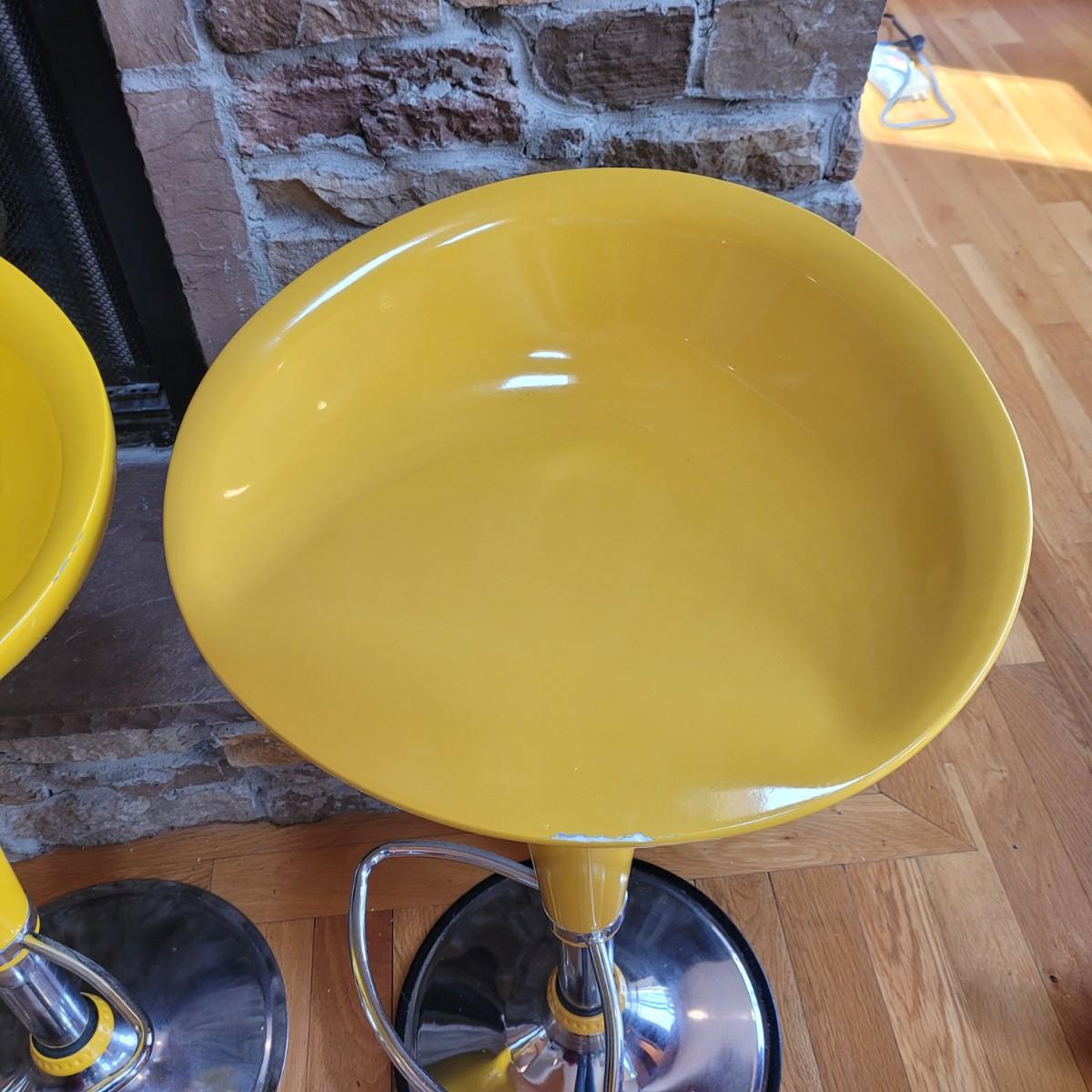 Set of three modern, marigold yellow barstools. Plastic coating scuffed and chipped in some areas (see photos). Rubber ring missing on one stool and others are cracked. Levers work on all stools when tested. Measure approximately 17.5" at widest part of seat. Lowest seat height setting is approximately 21", and highest is 28". Local pickup only.
