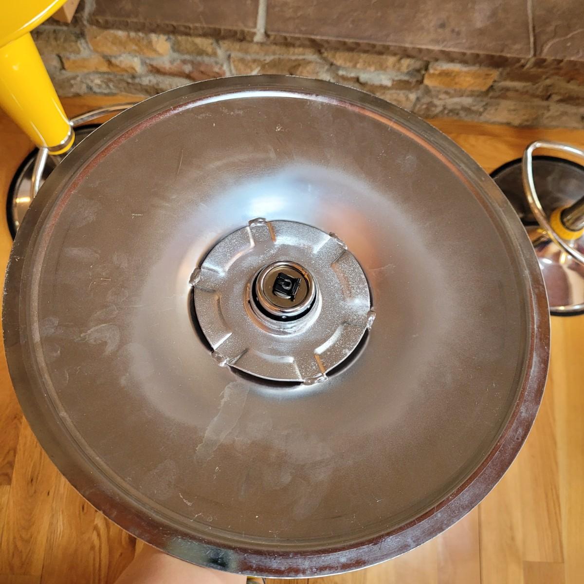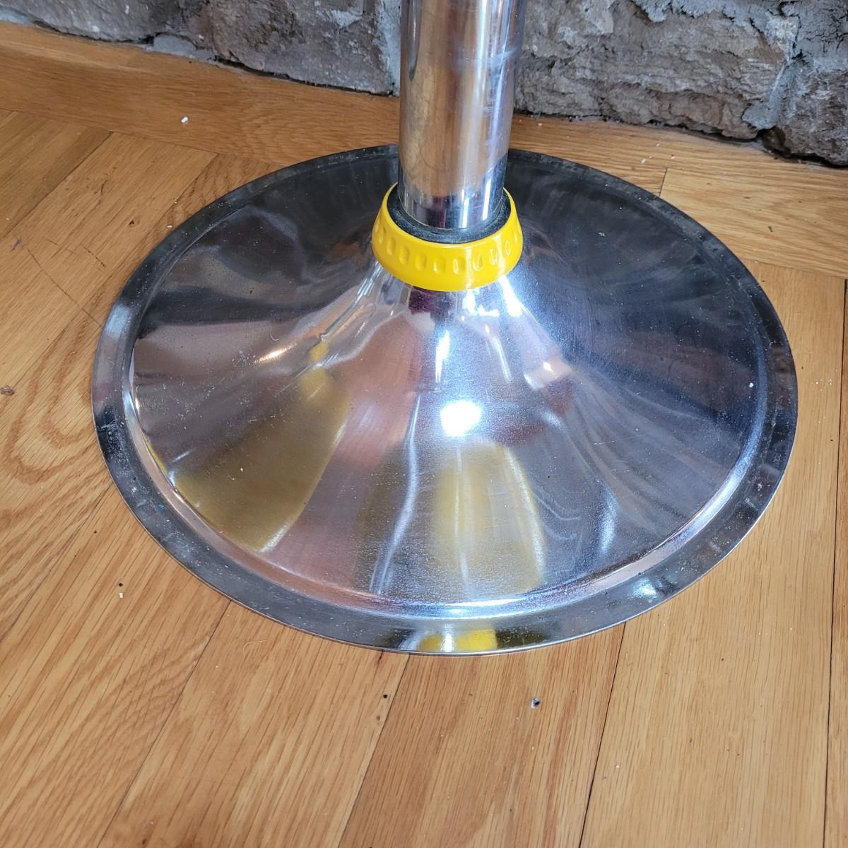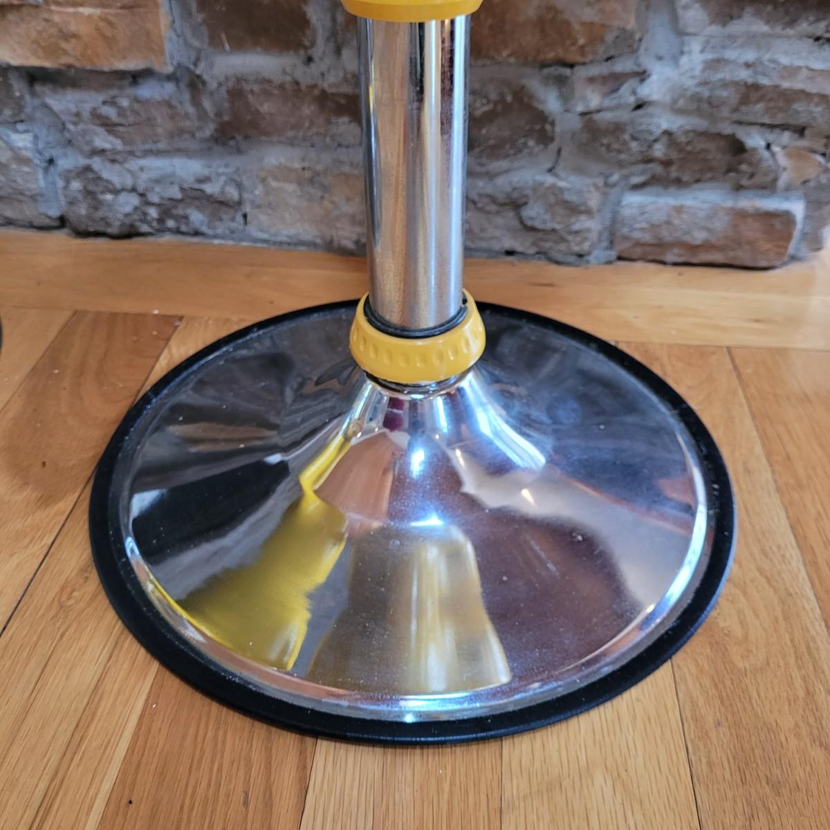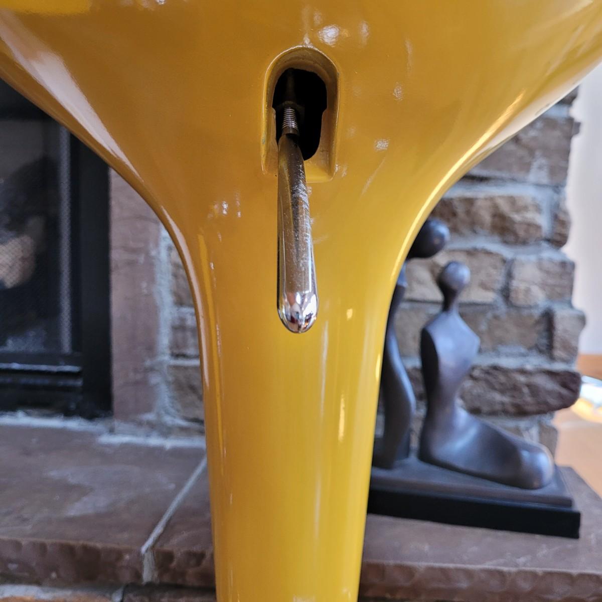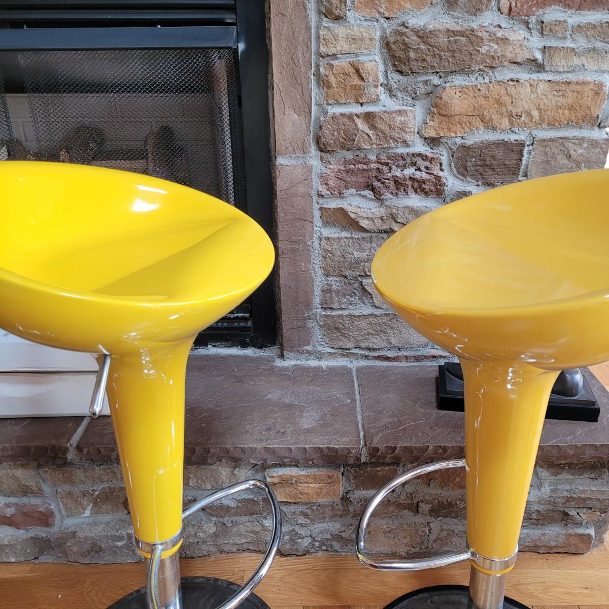 Set of three modern, marigold yellow barstools. Plastic coating scuffed and chipped in some areas (see photos). Rubber ring missing on one stool and others are cracked. Levers work on all stools when tested. Measure approximately 17.5" at widest part of seat. Lowest seat height setting is approximately 21", and highest is 28". Local pickup only.