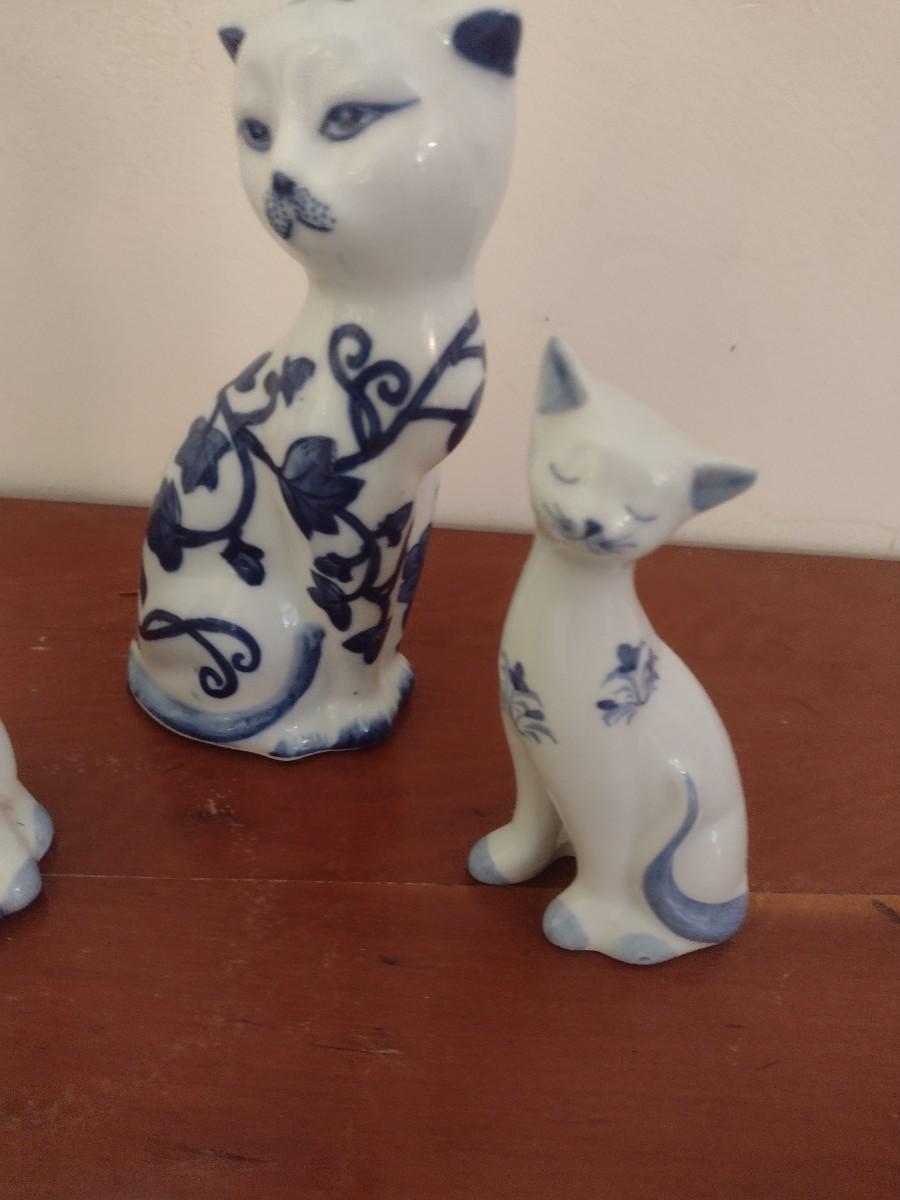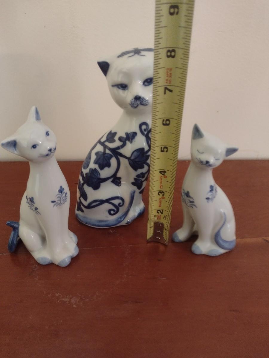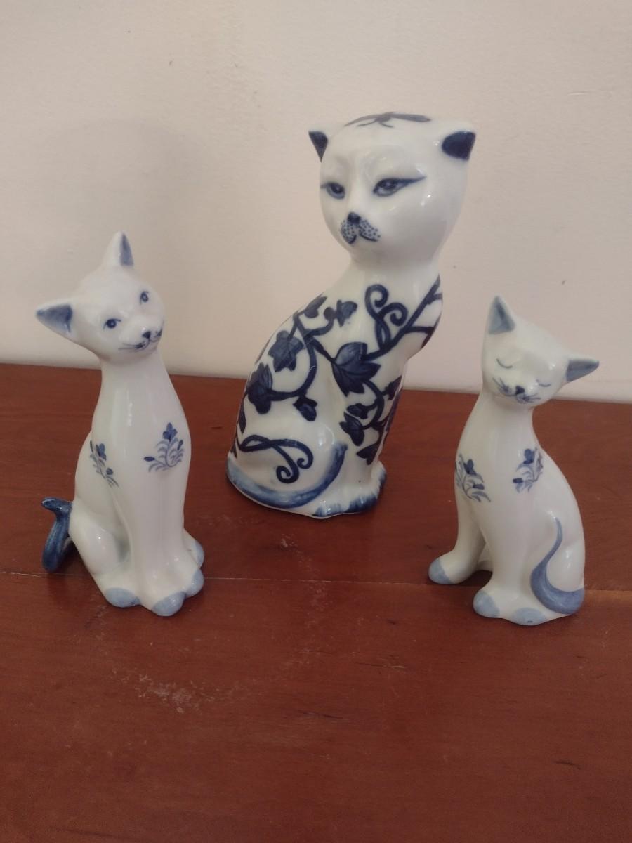 Set of Three Blue and White Ceramic Cat Statuettes