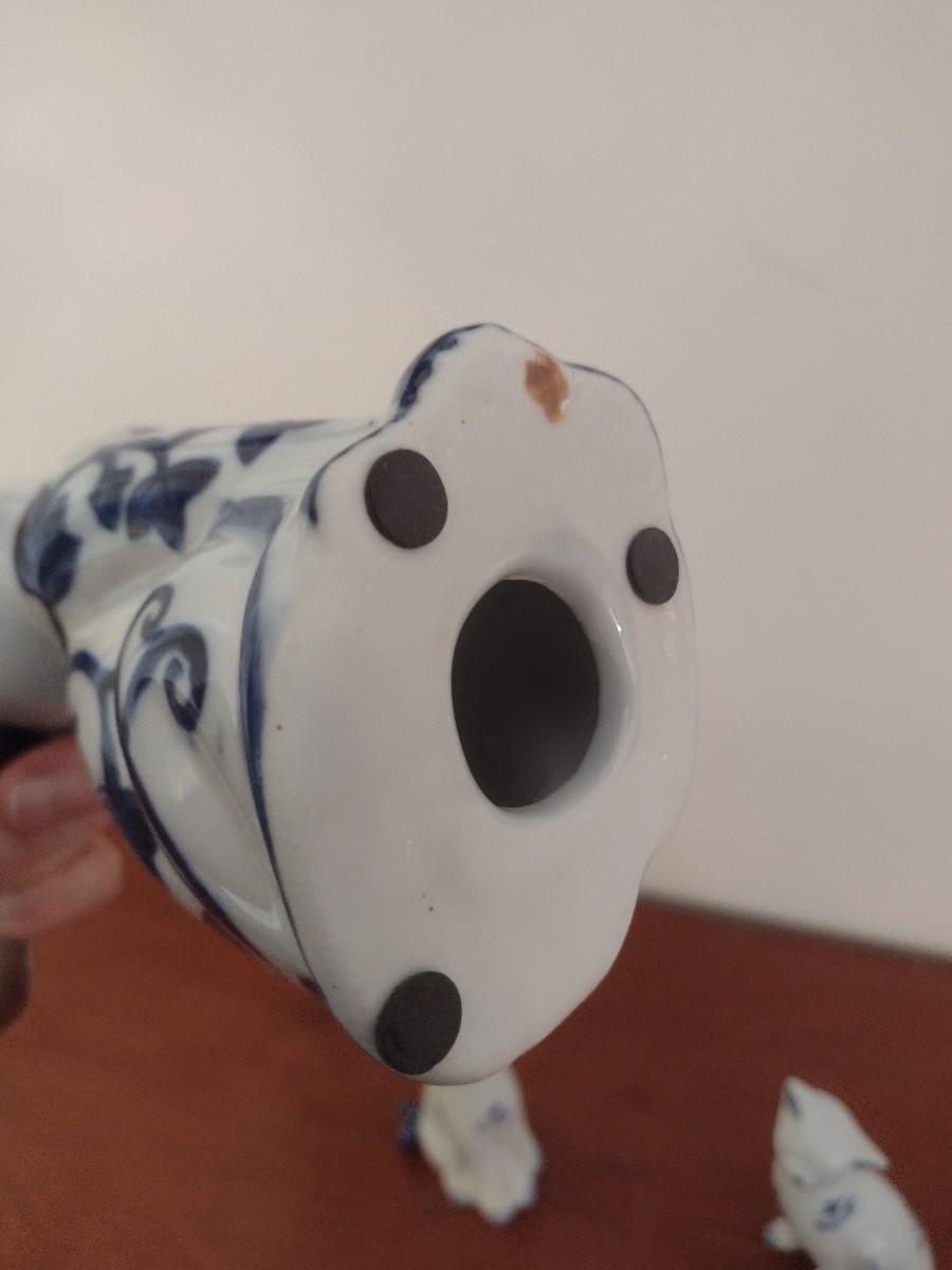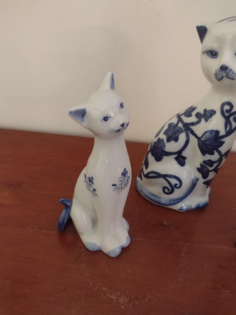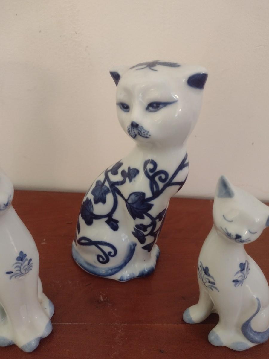 Set of Three Blue and White Ceramic Cat Statuettes